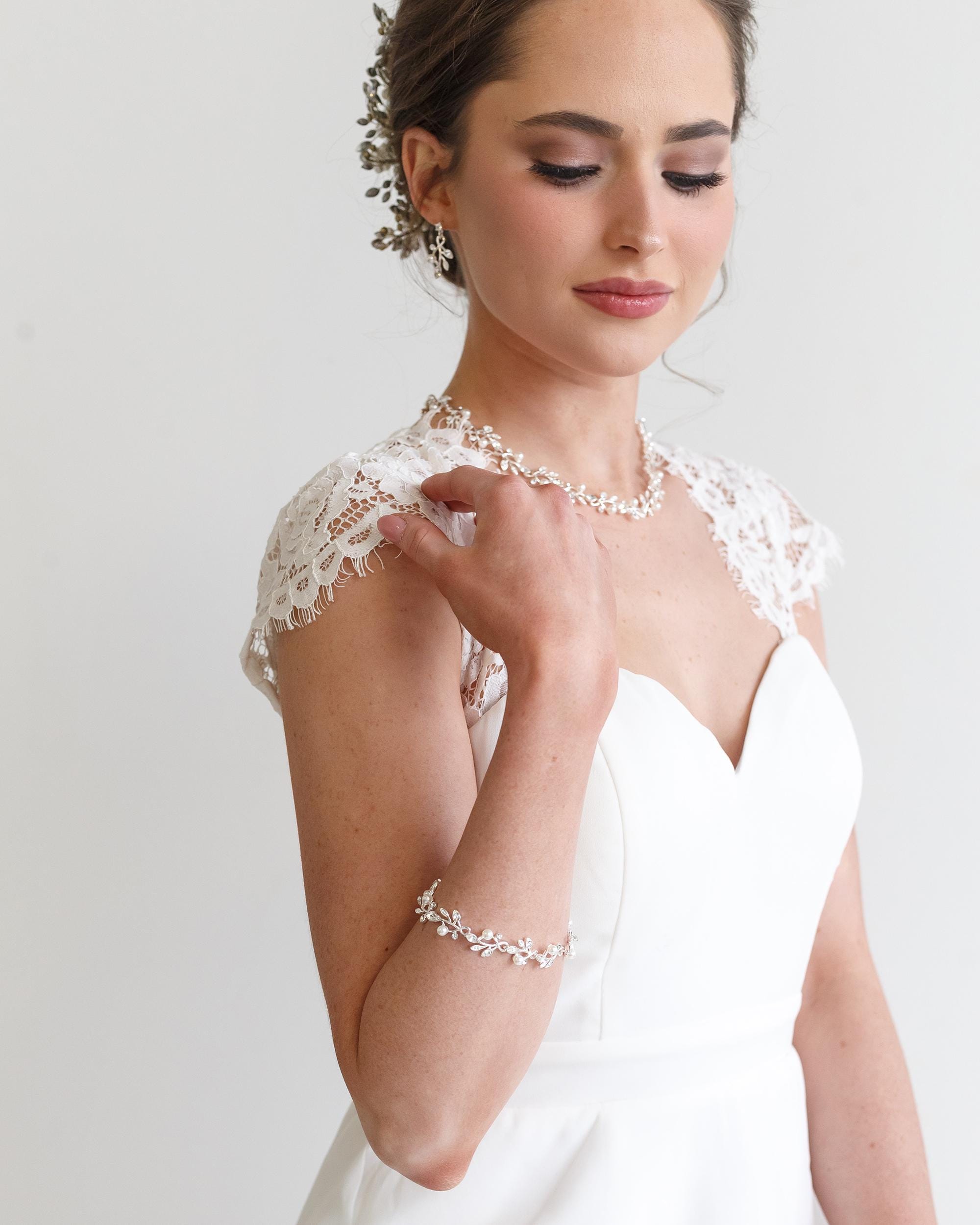 High quality materials featuring sparkling faceted crystals and lustrous pearls.