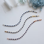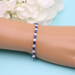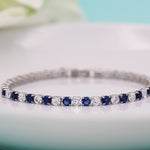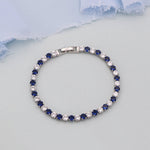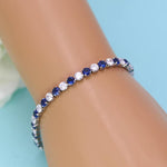 This exquisitely crafted bracelet boasts 4mm AAA grade cubic zirconia sapphire colored blue and clear round stones in an alternating pattern tennis style bracelet. Bracelet measures 7", and is perfect for the bride or any special occasion! Now available in silver, gold and rose gold!