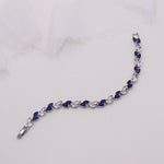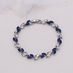 This exquisitely crafted bracelet boasts AAA grade cubic zirconia clear and sapphire colored blue stones in marquise and pear cuts. Bracelet measures 7", and is perfect for the bride or any special occasion!