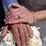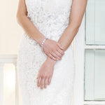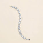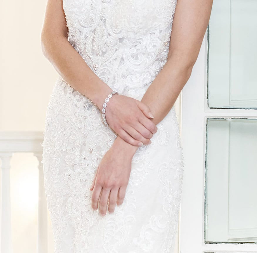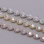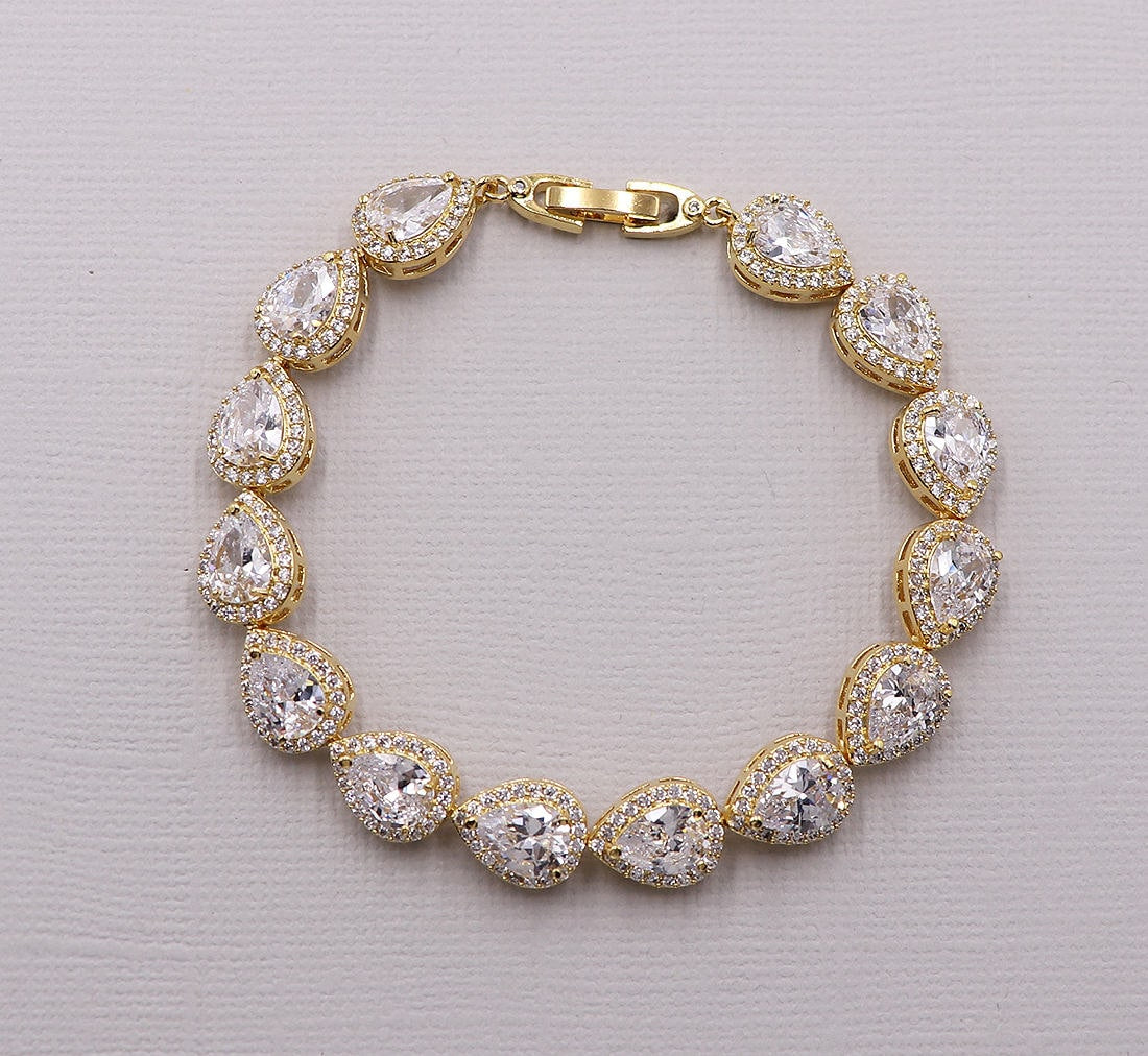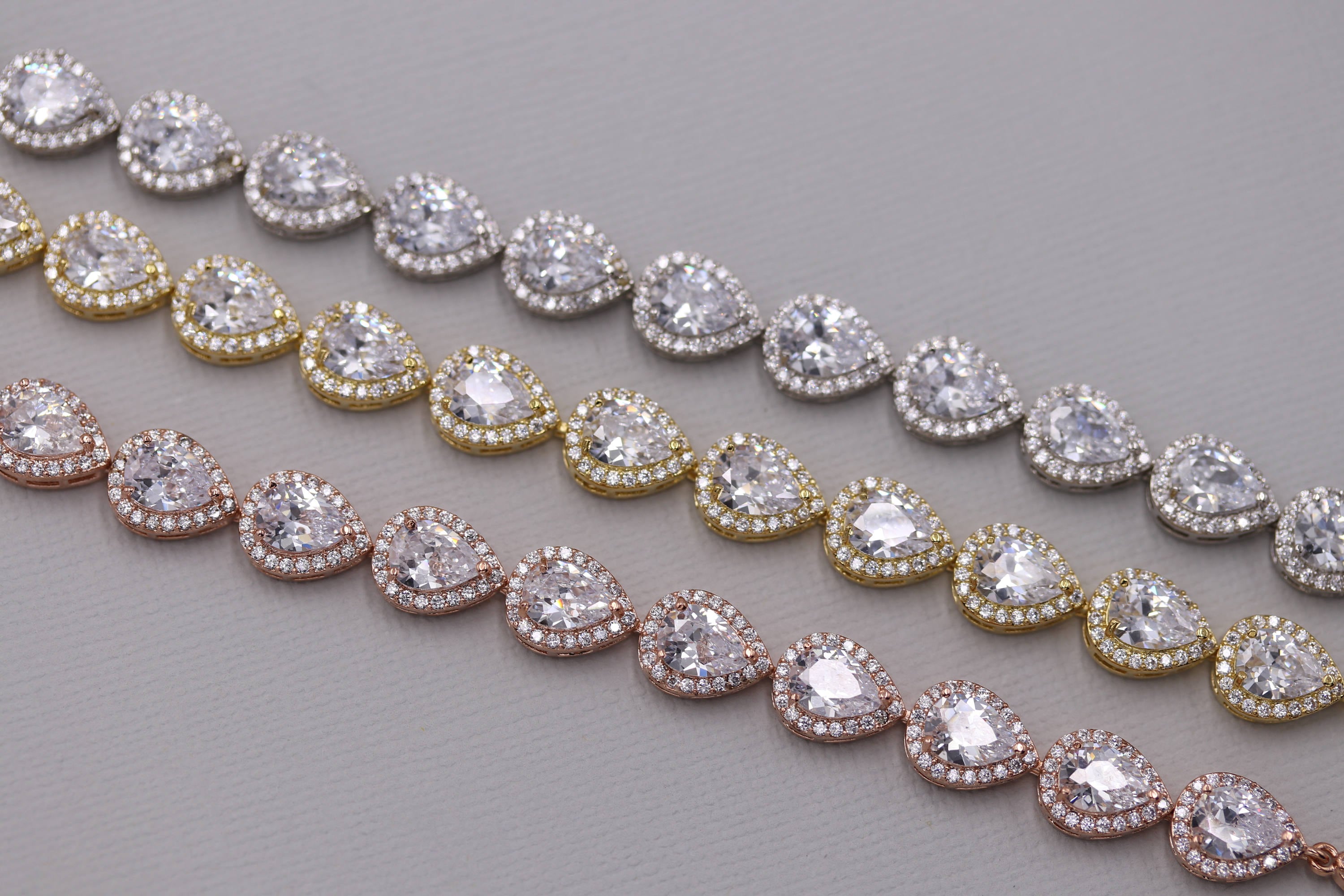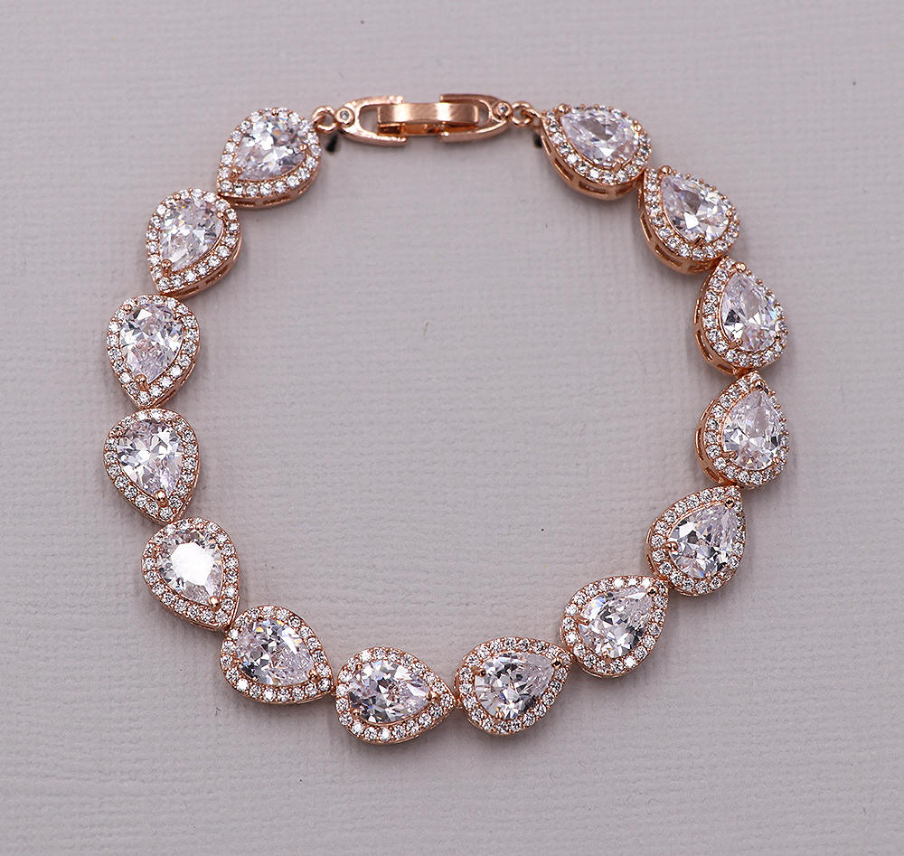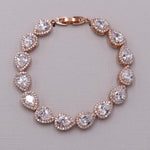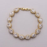 This exquisitely crafted bracelet boasts AAA grade cubic zirconia stones in a framed pave design. Bracelet measures 3/8" wide and 7" long. This wedding bracelet is perfect for the bride or any special occasion! Available in silver, gold or rose gold finish.