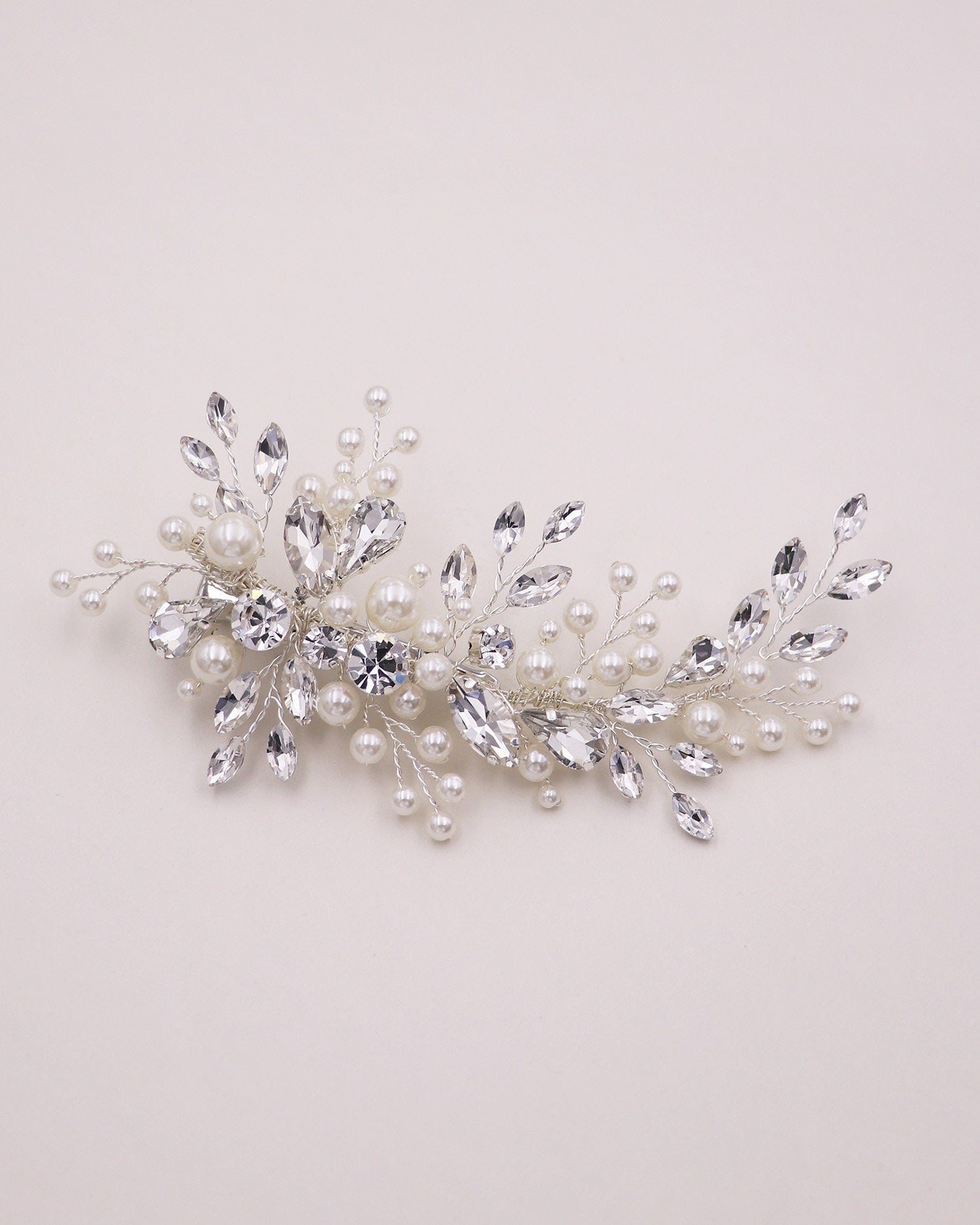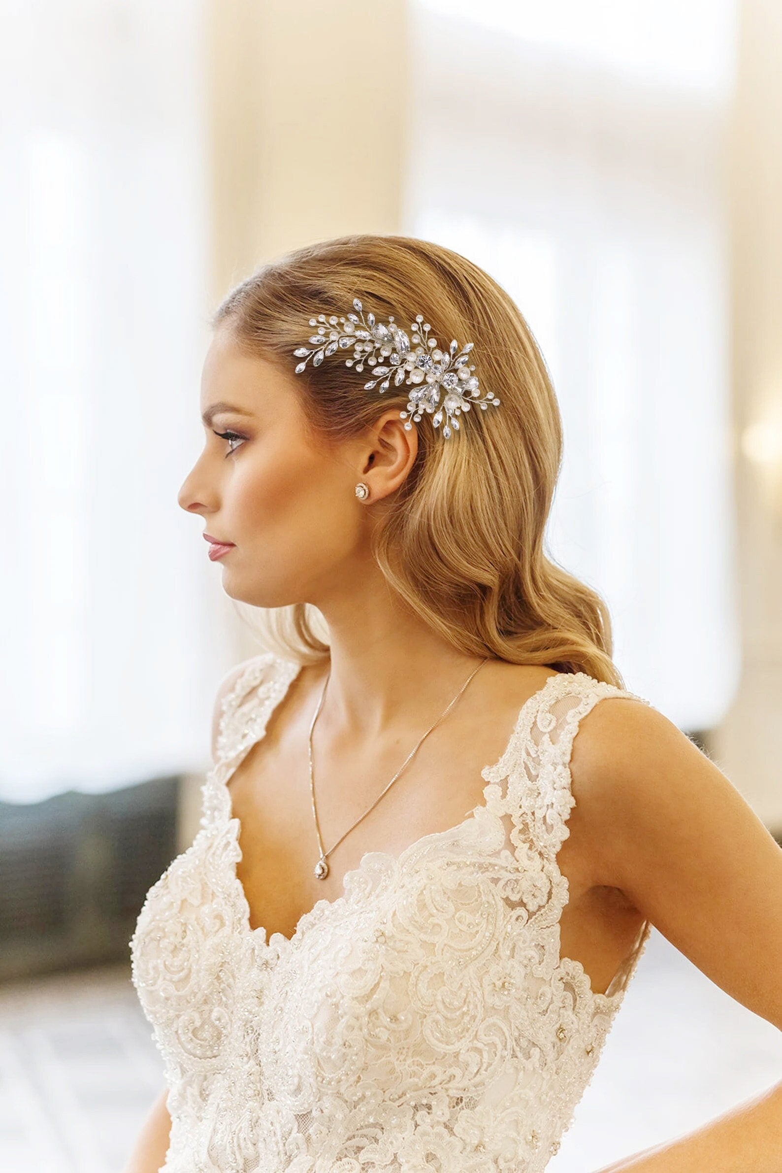 This brilliant crystal wedding hair clip is perfect to add to your hair on your most special day. Measuring 5" wide by 2" tall, this delicate rhinestone encrusted clip features clusters of round, pear and marquise crystals and glass pearls set in silver plating. This handmade comb has branches that can be moved to your liking.