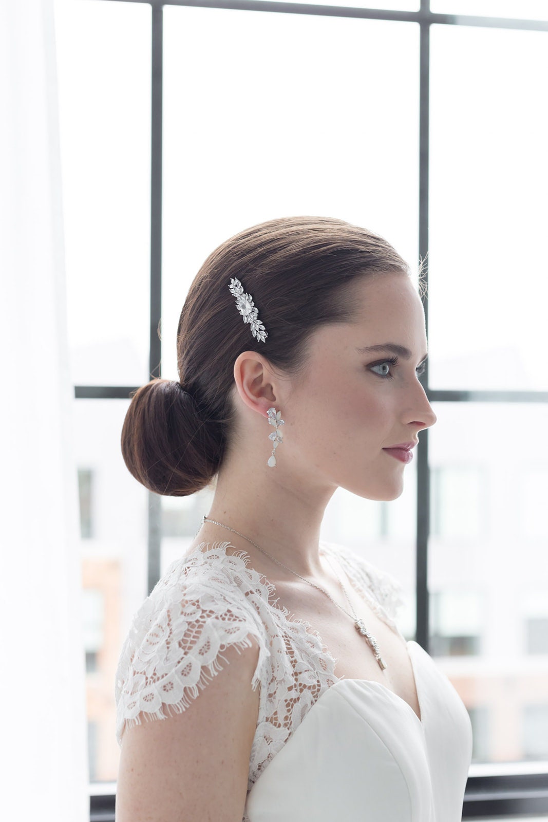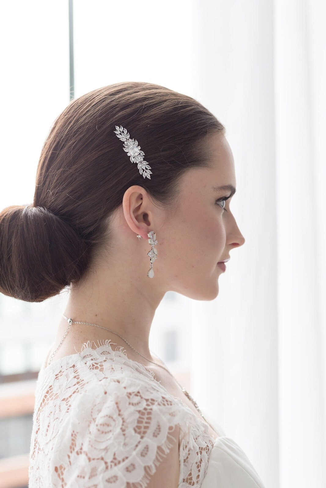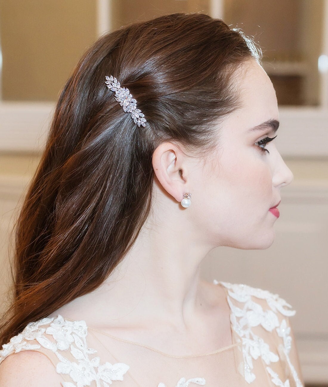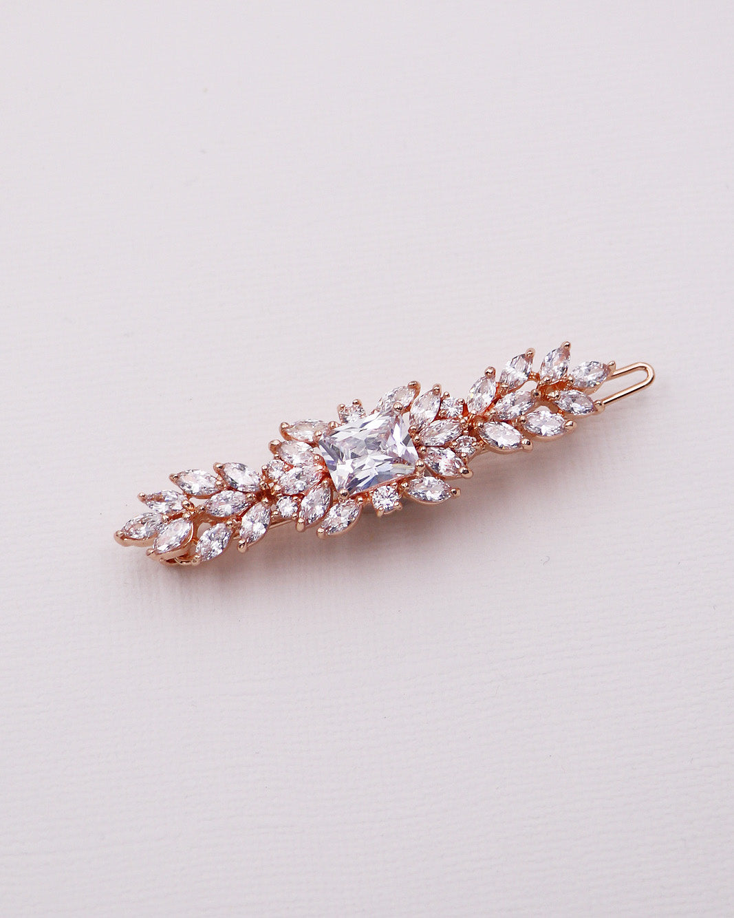 This uniquely designed barrette features sparkling marquise CZ stones with a dramatic emerald cut center stone. This piece is perfect as a side or back clip accessory. Measures a more petite size at 2 1/4" wide and 3/4" tall and has a clip on the back to securely place into your hair. The exquisite barrette was designed with the sparkle of rhinestones and the diamond-like brilliance of the cubic zirconia. This clip would be perfect for the bride, prom, or any special occasion!