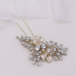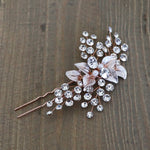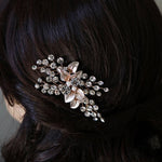 This lustrous hair pin is sure to add beauty and luster to your special day! Features brilliant high quality rhinestones in a floral cluster design mixed with brushed metal silver leaves for a very organic look, measuring 3 1/4" tall by 2 1/2" wide. This hairpin in handwired with silver colored wire, making the branches flexible to be moved to your liking. This gorgeous pin can be made in silver, yellow gold or rose gold.