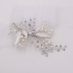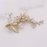 This sparkling crystal wedding hair clip is perfect to add to your hair on your most special day. Measuring 4" wide by 2" tall, this delicate rhinestone encrusted clip features clusters of brushed metal leaves and freshwater pearls set in silver plating. This handmade comb has branches that can be moved to your liking. Includes an alligator style clip for secure placement into your hair. Available in silver, gold and rose gold.