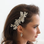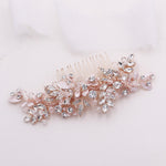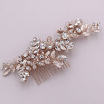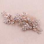 Add a touch of floral beauty with this unique bridal comb featuring crystal rhinestones bursting with sparkle and accenting sprays of high quality crystals and marquise stones. Plated in brilliant rose gold, this stunning comb measures 6" wide by 2 1/2" tall (at the widest point). This comb would be perfect as a side accent or back comb wedding hair accessory. Choose from silver or rose gold finish.