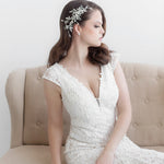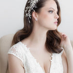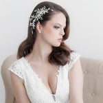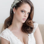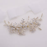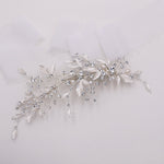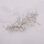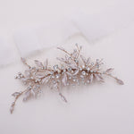 This lustrous crystal wedding hair clip is perfect to add to your hair on your most special day. Measuring 7" wide by 2 1/2" tall, this delicate rhinestone encrusted clip features clusters of brushed metal leaves and freshwater pearls set in silver plating. This handmade wedding clip has branches that can be moved to your liking. Includes an alligator style clip for secure placement into your hair. Available in silver, gold and rose gold.