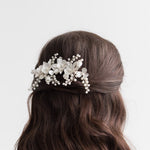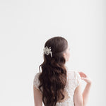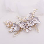 This floral inspired wedding hair clip is sure to add beauty to your special day! Features a cluster of brushed metal flower and leaves, porcelain flowers and pearl accents. Clip measures 5 1/2" wide by 3" tall and is available in silver or gold. Has an alligator style clip on the back with "teeth" for secure placement.