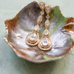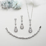 Add bold elegance with these exquisitely designed open framed cubic zirconia teardrop wedding pendant necklace set, featuring a pear top portion, a halo marquise piece ending in a double dangling tear drop pear accents. Design portion measuring 2" long, this is perfect for any special occasion. Necklace measures 16" and is adjustable up to 18" long. Choose from earrings and necklace set or with coordinating bracelet measuring 7". Available in silver, gold or rose gold.