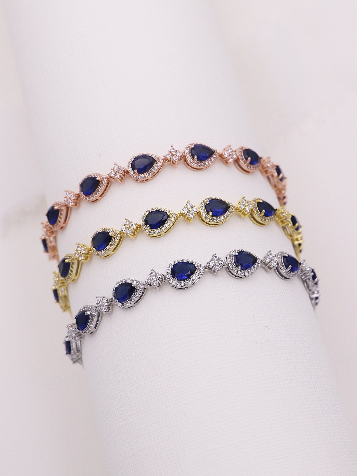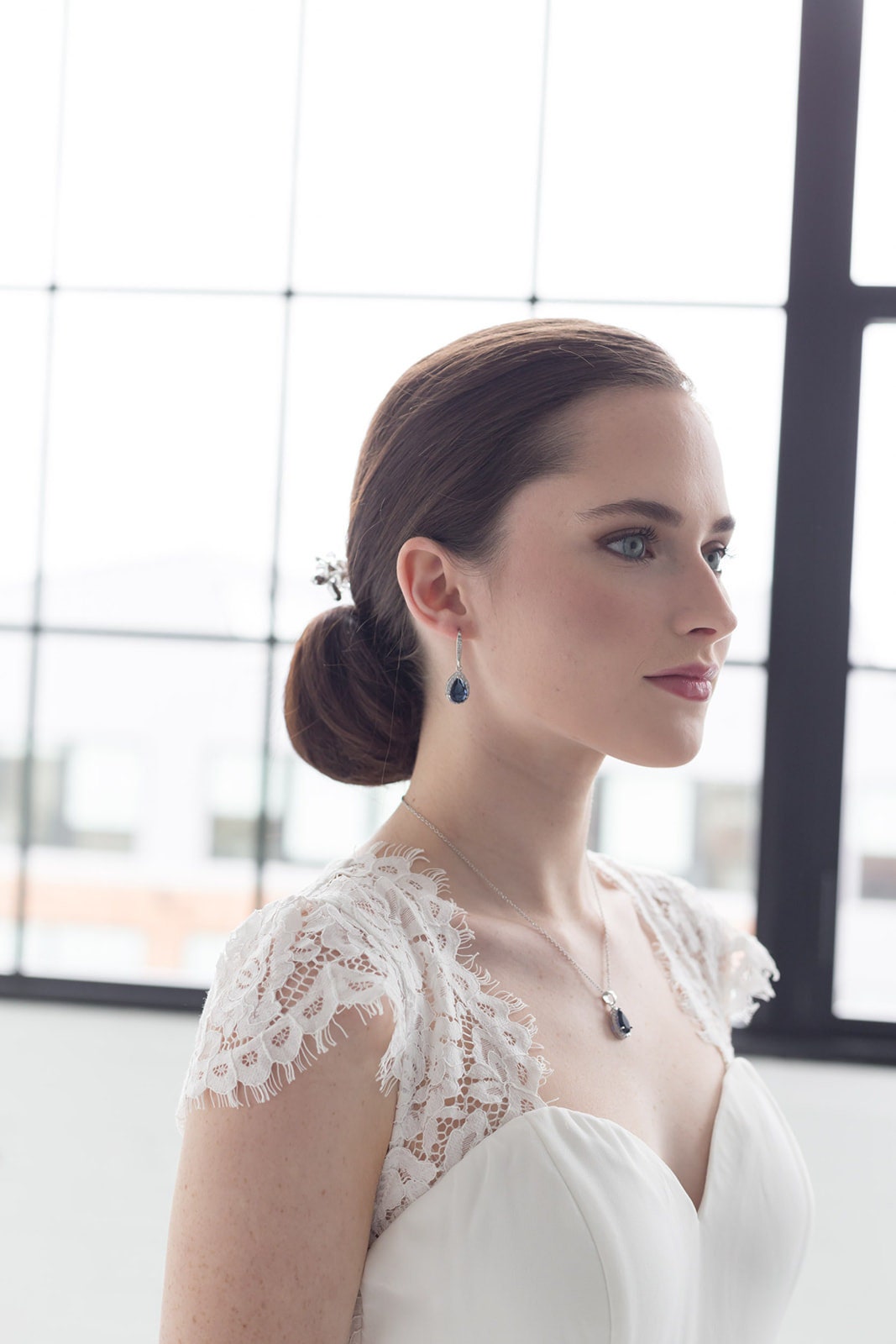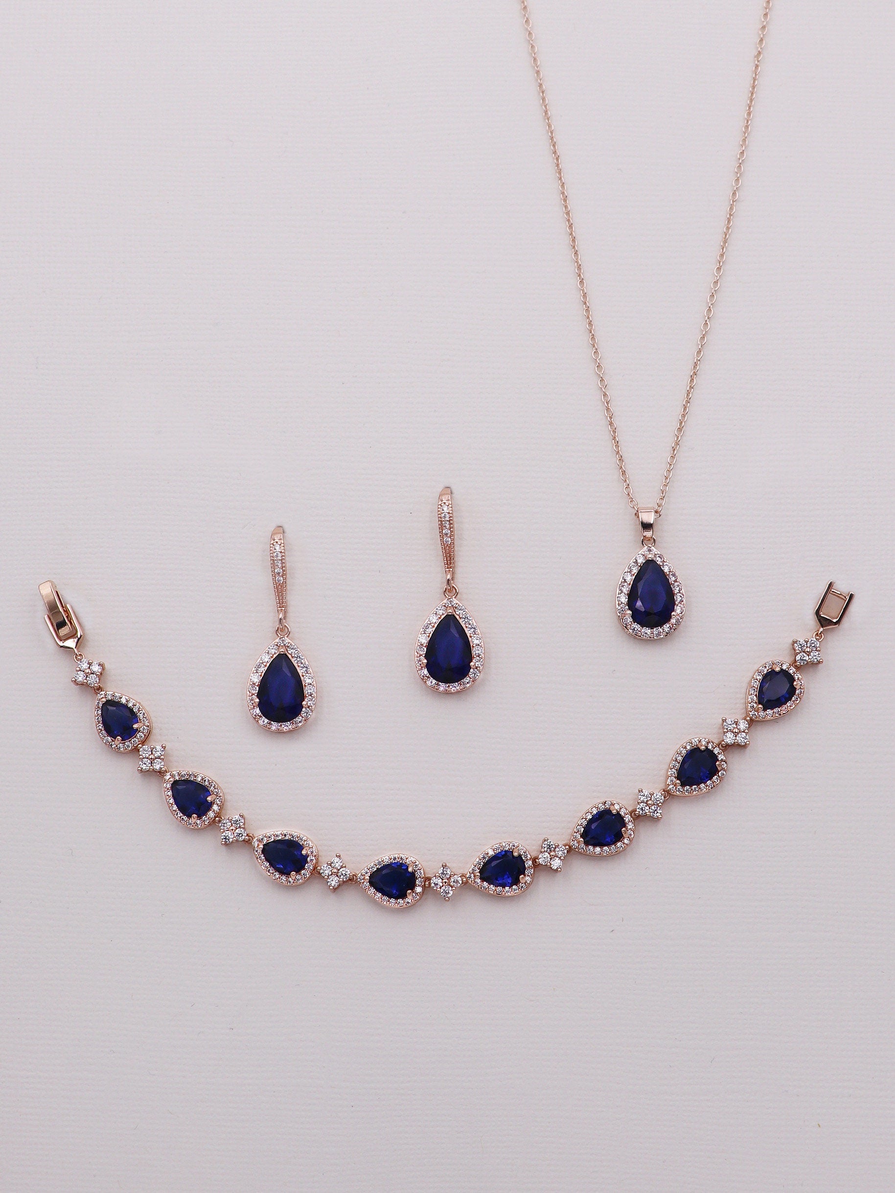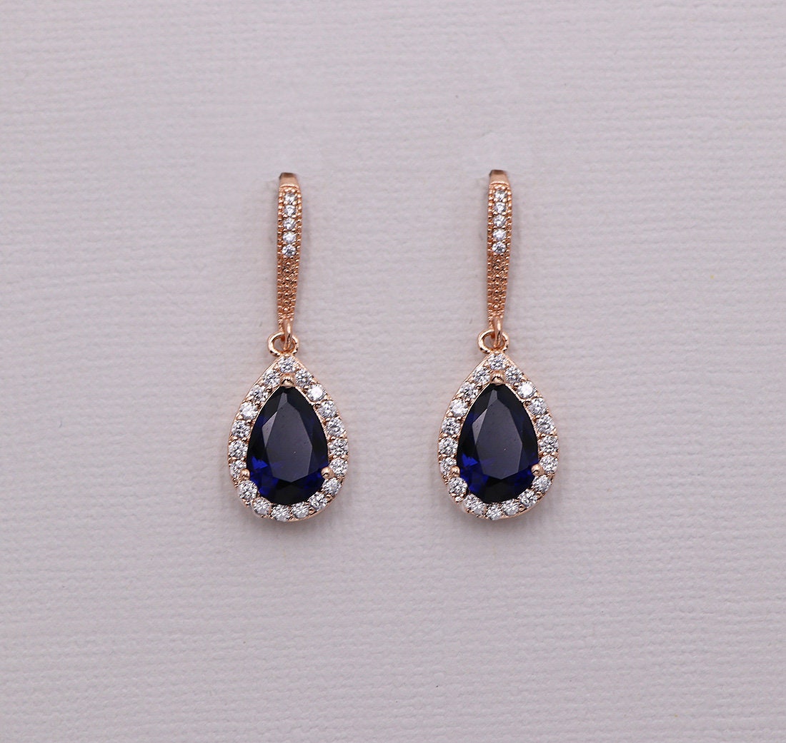 These classically designed earrings features a framed cubic zirconia teardrop dangling from a CZ encrusted French hooks set in brilliant rose gold for a unique look. Measuring 1 1/2", these brilliant earrings are perfect for the bride who wants a sparkling and classic style earring. These earrings are also perfect for bridesmaids, parties, or any special occasion! Matching (optional) necklace is adjustable from 16"-18" and bracelet measures 7" long. Choose from silver, gold or rose gold.