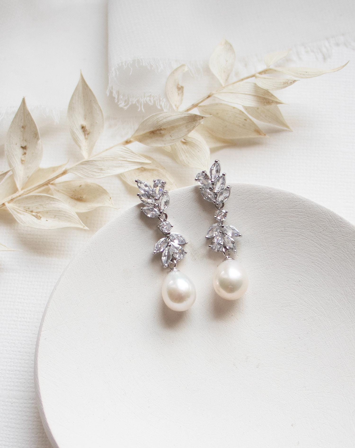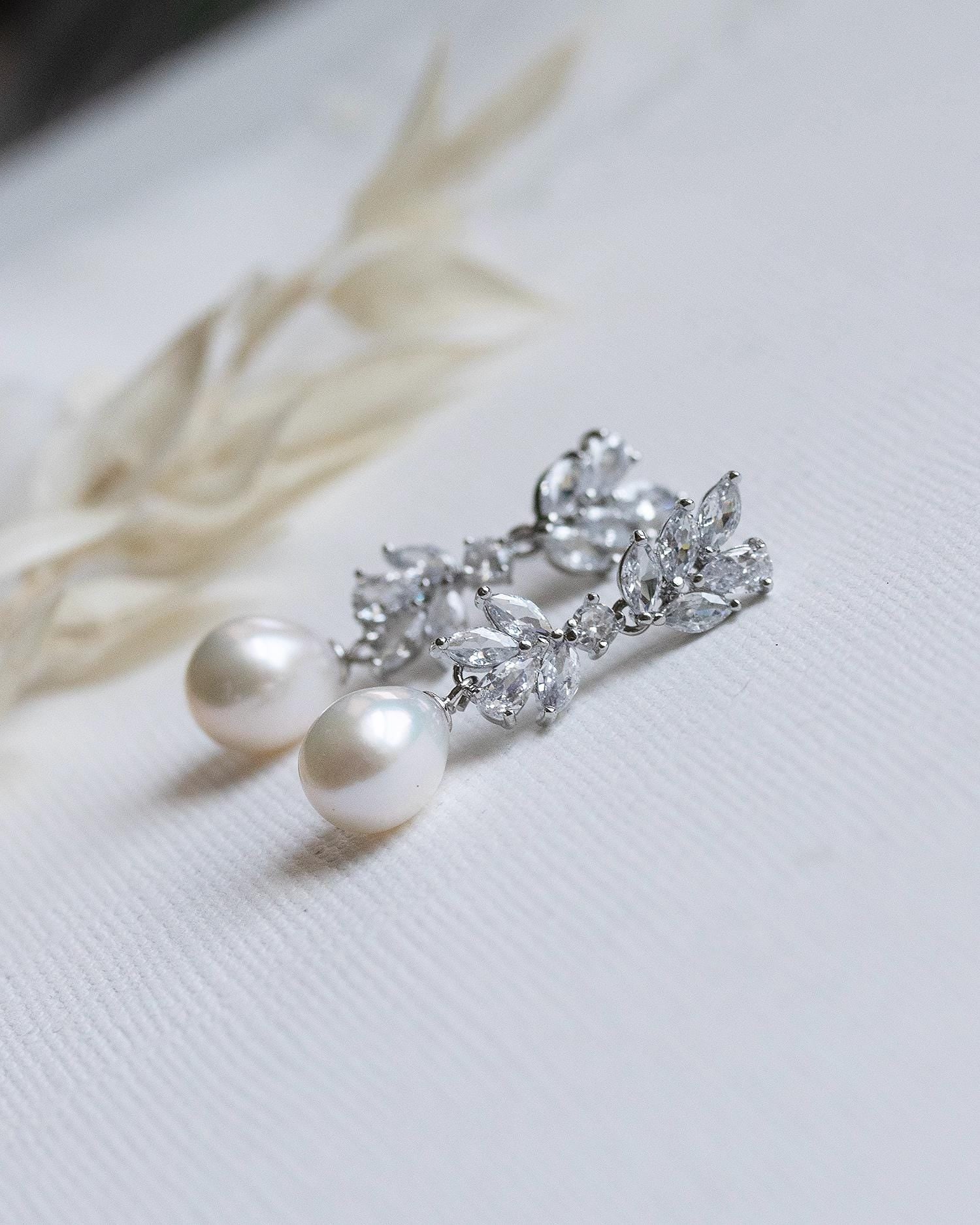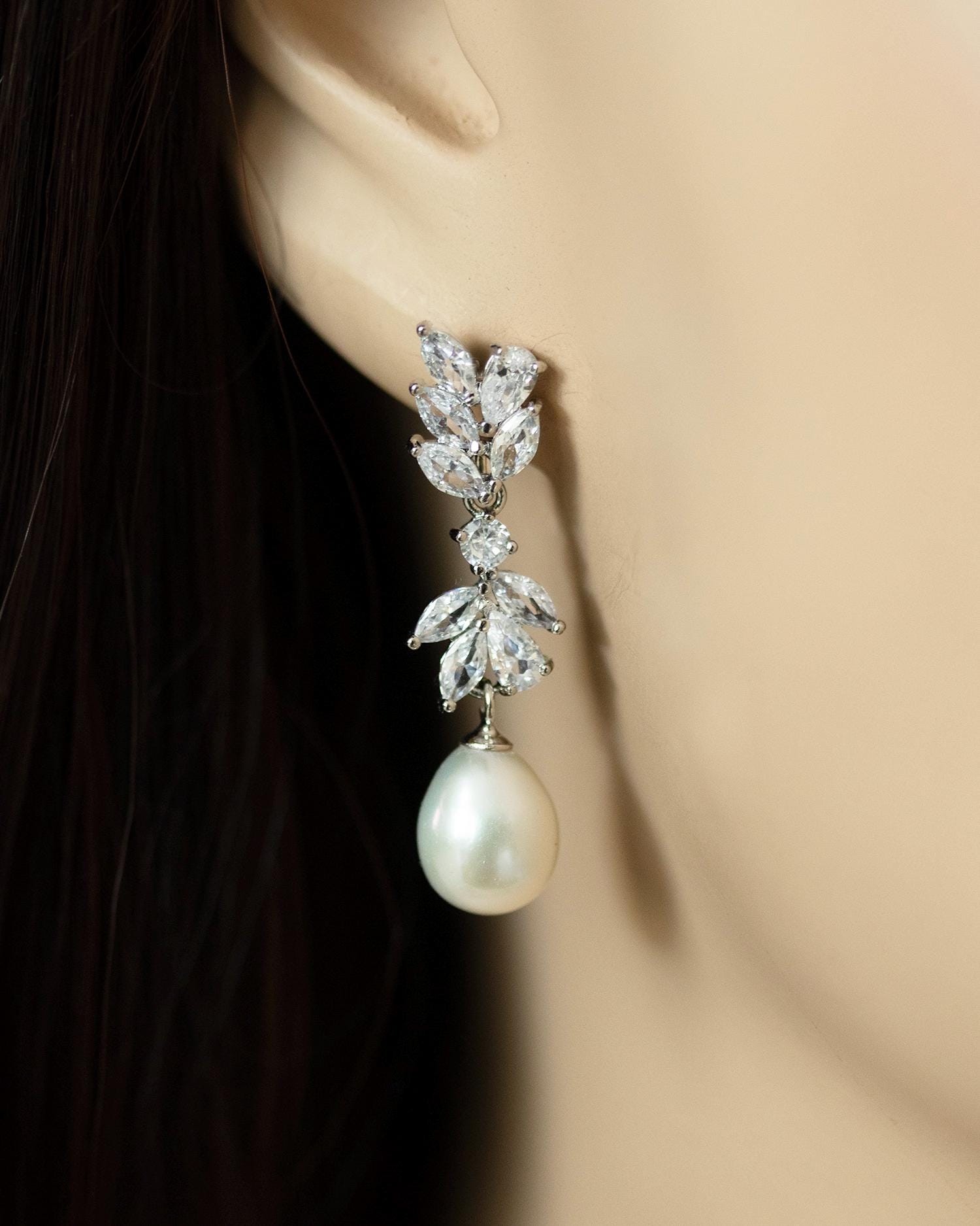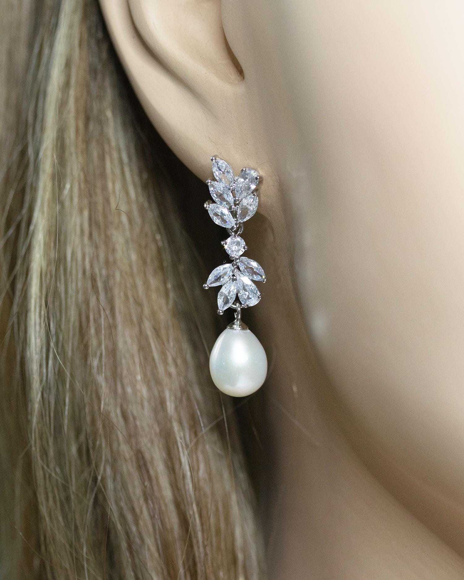 These dangle freshwater pearl wedding earrings are elegantly designed with top grade cubic zirconia stones with dangling freshwater pearls. These lustrous earrings are perfect for a wedding, jewelry gift, bridesmaids, or any occasion!
