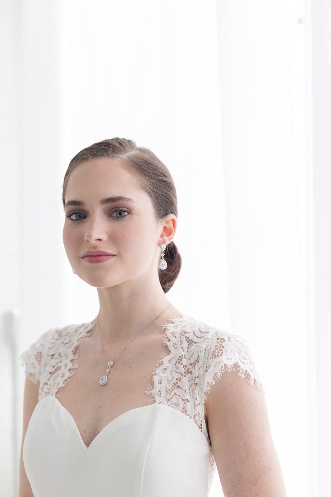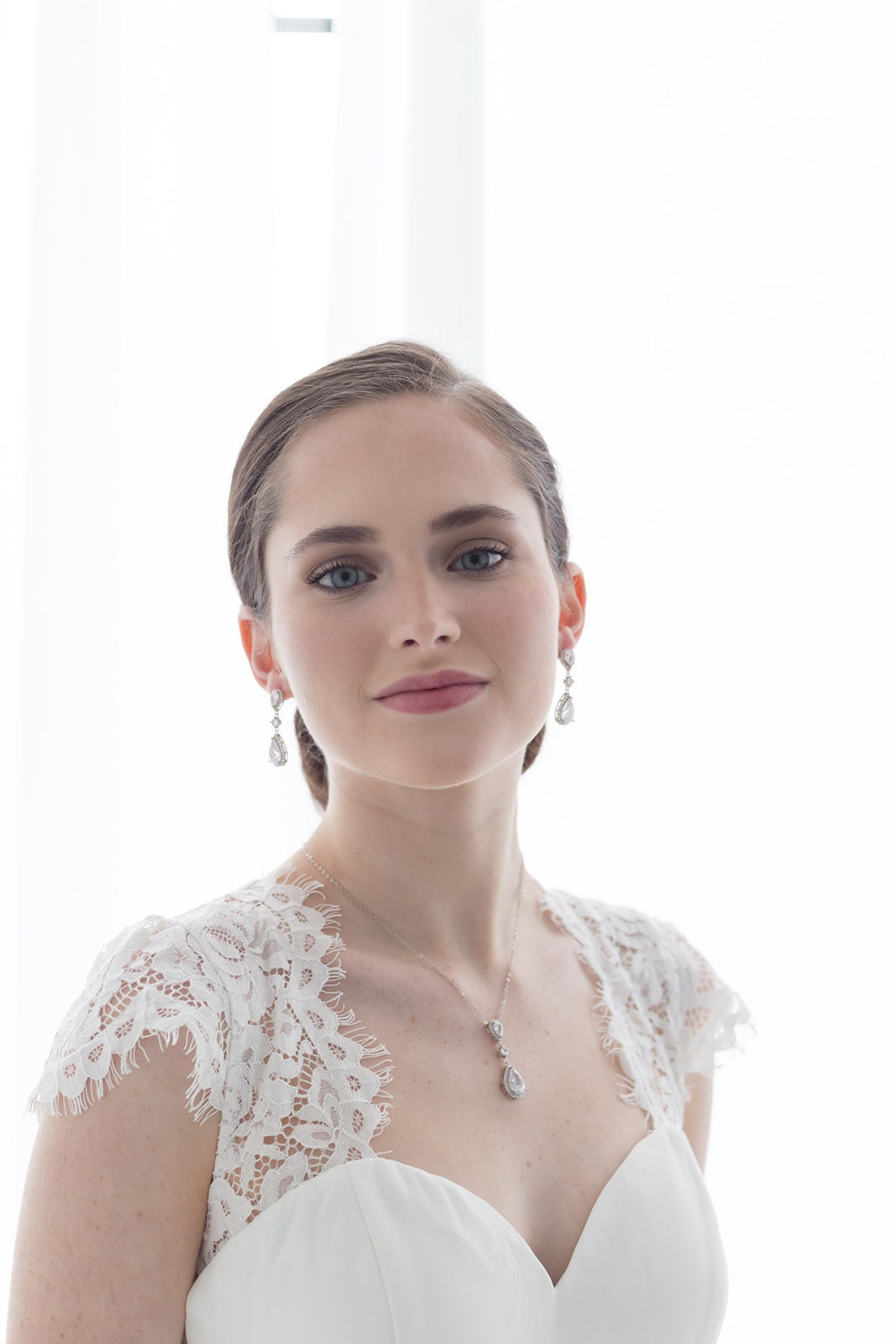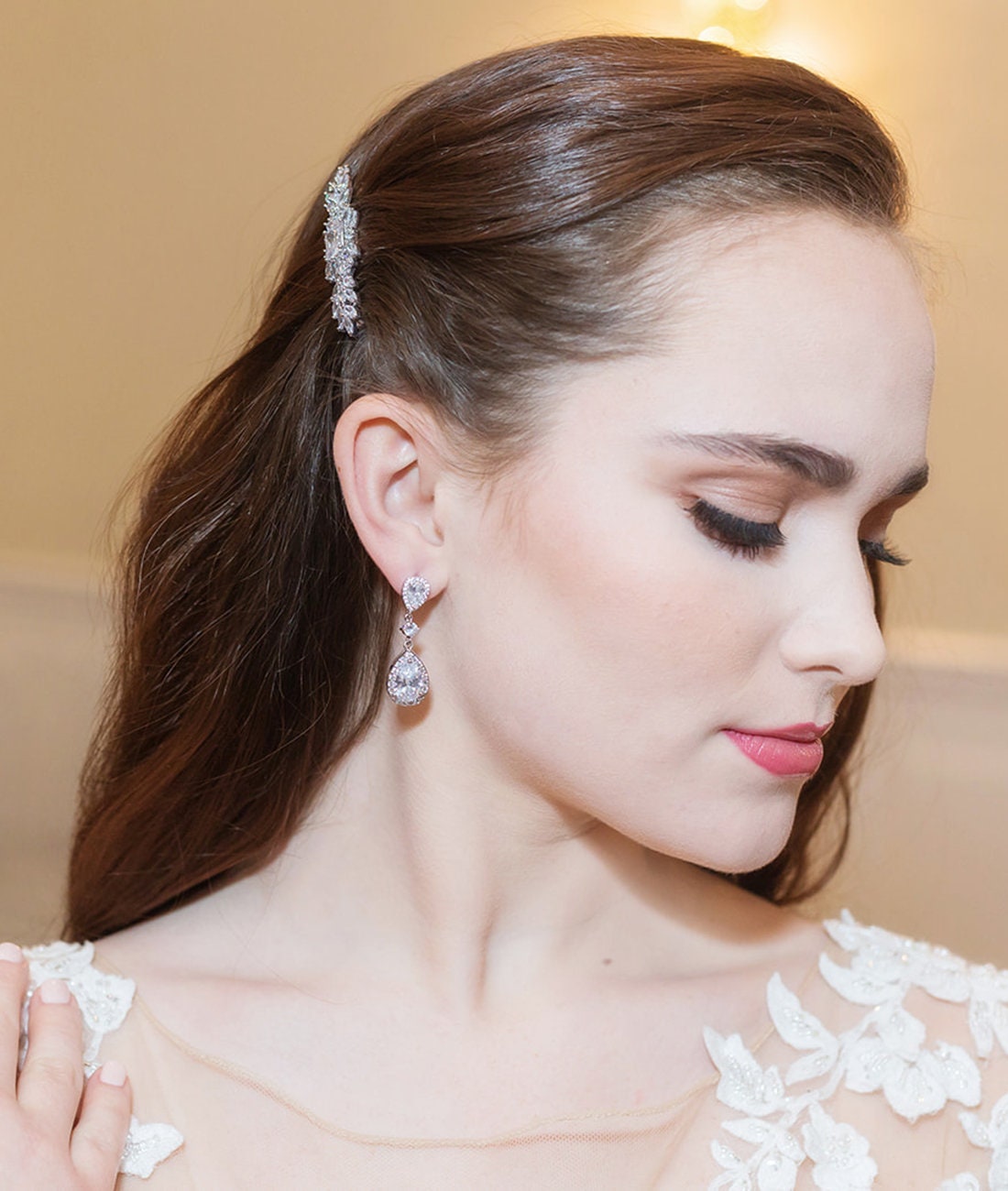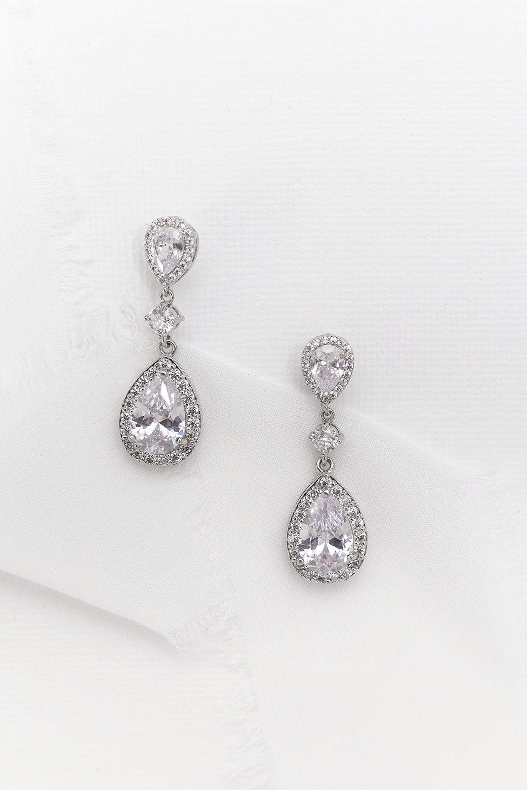 These classically designed earrings are sure to make a statement with framed pear cubic zirconia stones set in shiny rhodium plating. These earrings are perfect medium sized dangle earring design. Measuring 1 3/4", these brilliant earrings feature round and teardrop cubic zirconia stones. Matching (optional) necklace measures 16"-18" (adjustable), optional bracelet measures 7". Choose from silver, gold or rose gold.