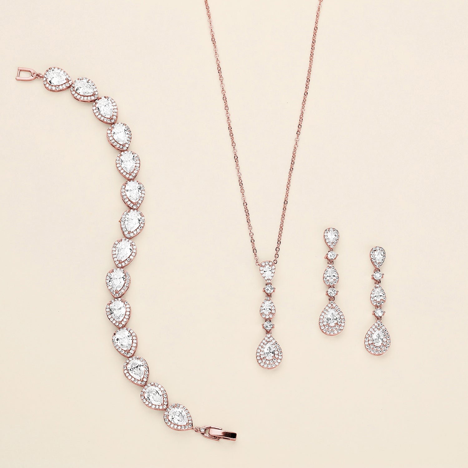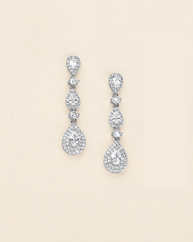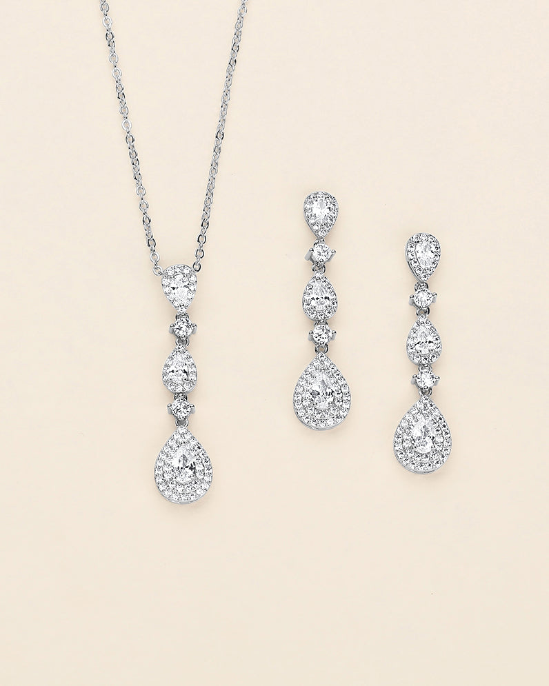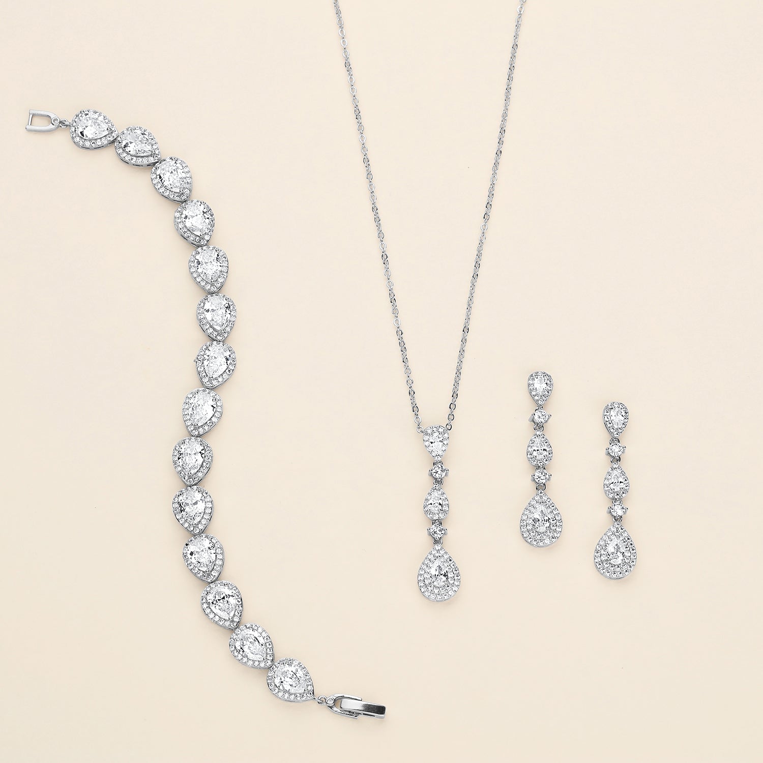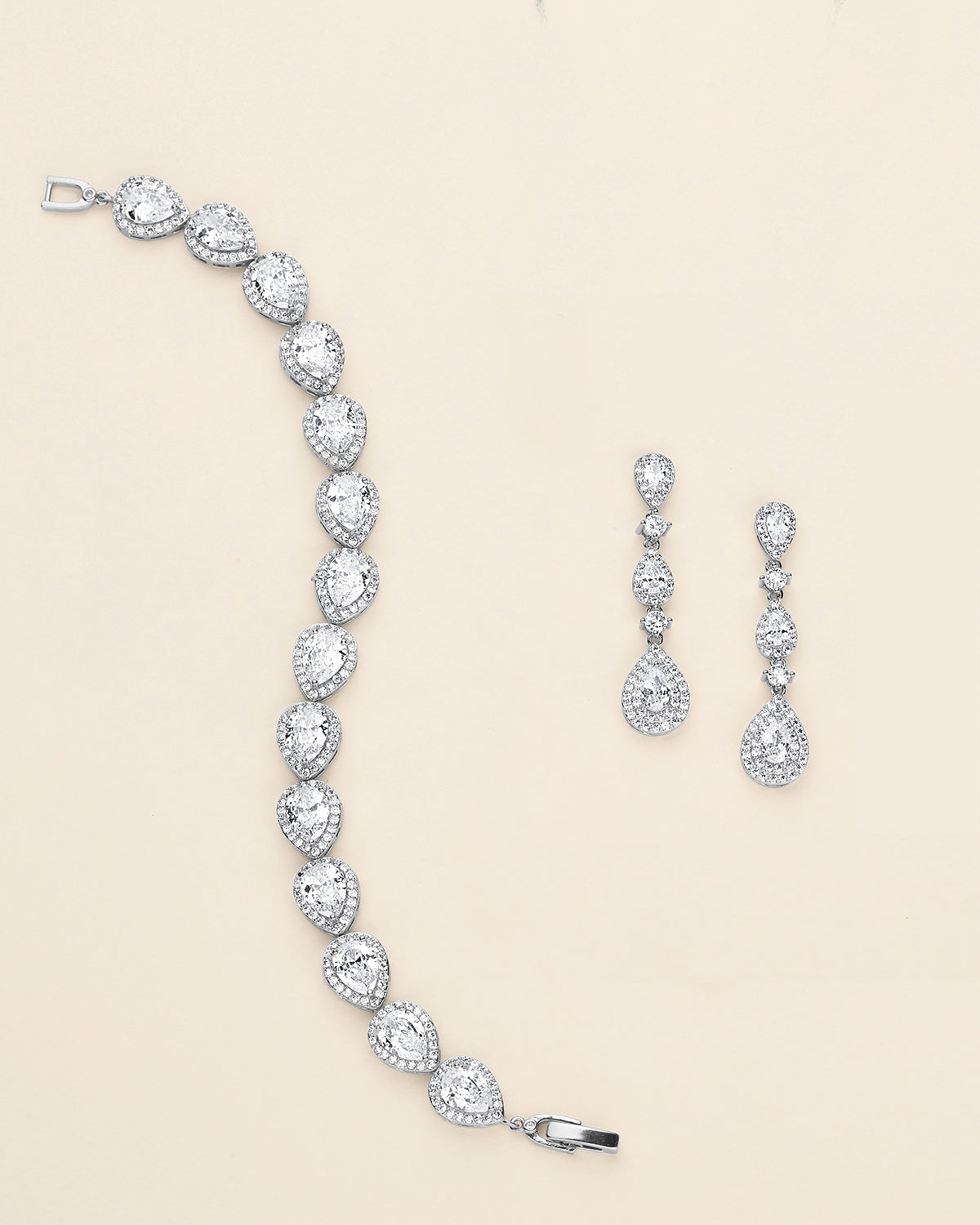 These brilliant earrings will surely add sparkle on your special day! Boasting brilliant cubic zirconia in a medium length dangle earring of pear and round stones. Earrings measure 1 1/2". Matching optional bracelet available measuring 7". Optional necklace necklace measures I adjustable from 16"-18". Available in silver, gold or rose gold!