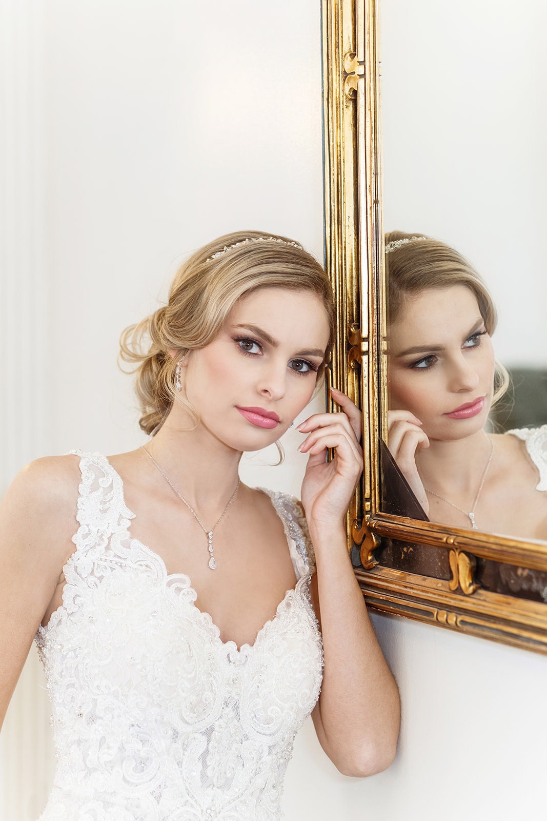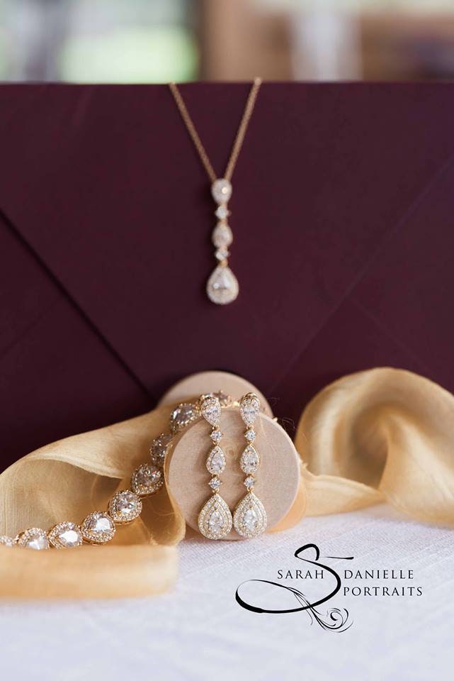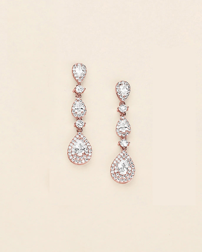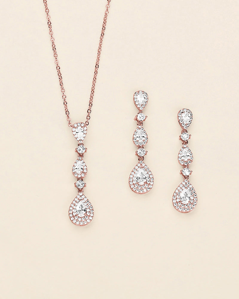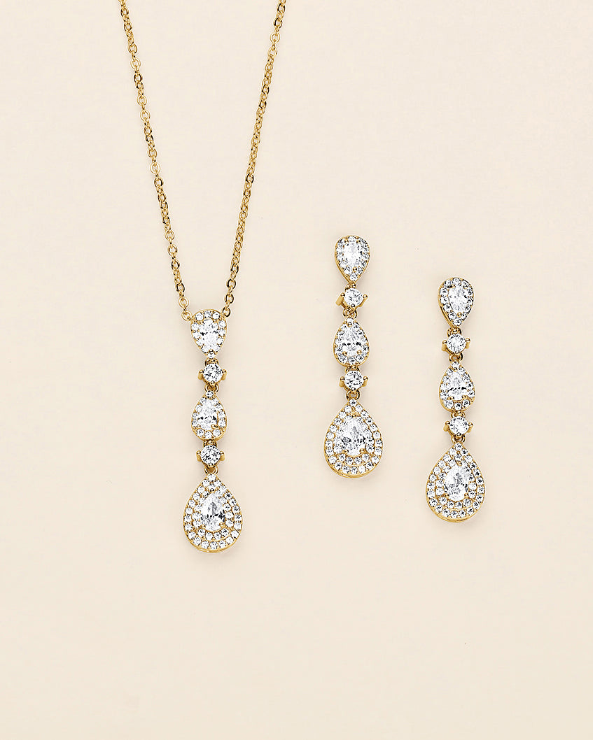 These brilliant earrings will surely add sparkle on your special day! Boasting brilliant cubic zirconia in a medium length dangle earring of pear and round stones. Earrings measure 1 1/2". Matching optional bracelet available measuring 7". Optional necklace necklace measures I adjustable from 16"-18". Available in silver, gold or rose gold!