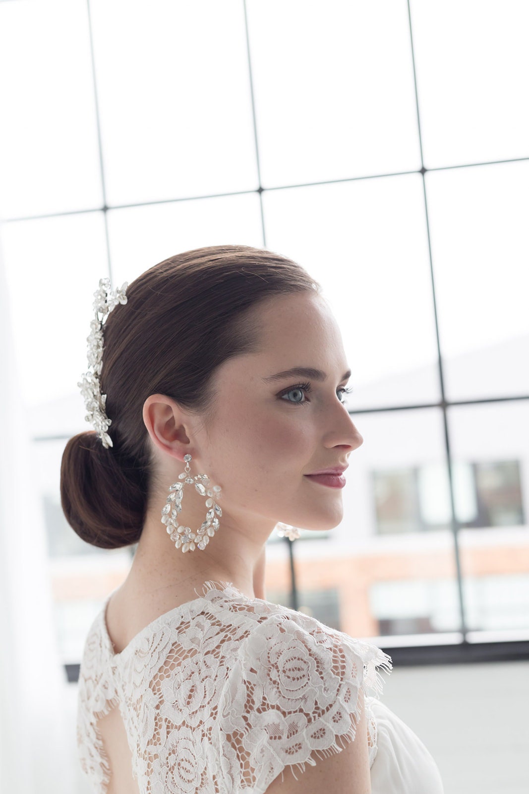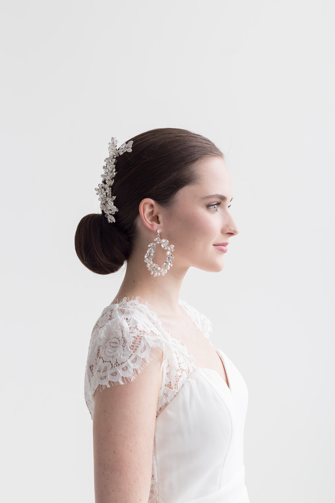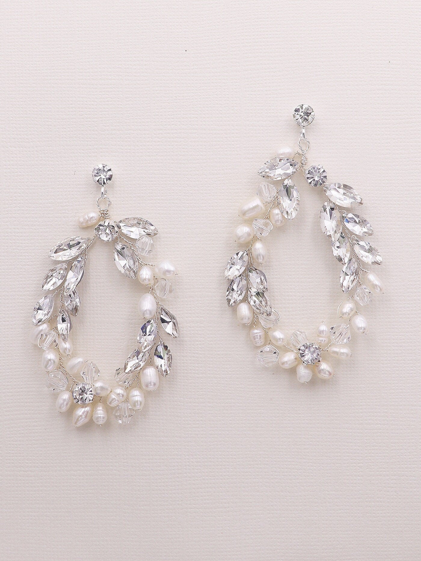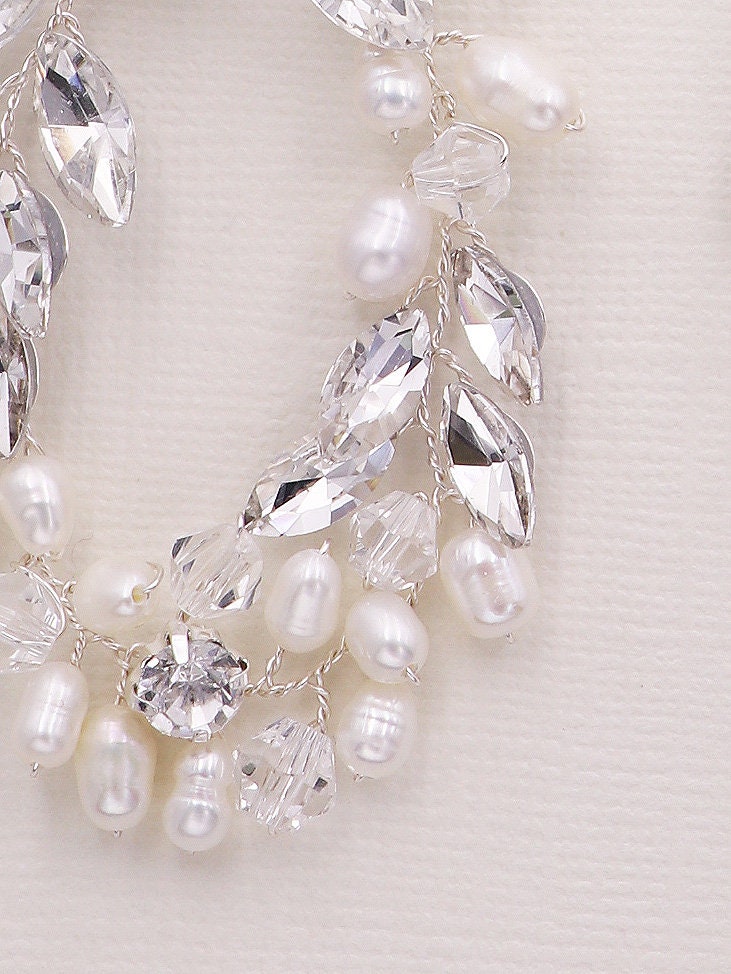 Make a statement with these handmade pearl and crystal wedding earrings! These classic and beautiful earrings will surely add elegance and beauty on your special day! Earrings feature sparkling crystals, rhinestones, and freshwater pearls measuring 3" long and 2" wide. This design is perfect for the bride, prom or any special occasion!
