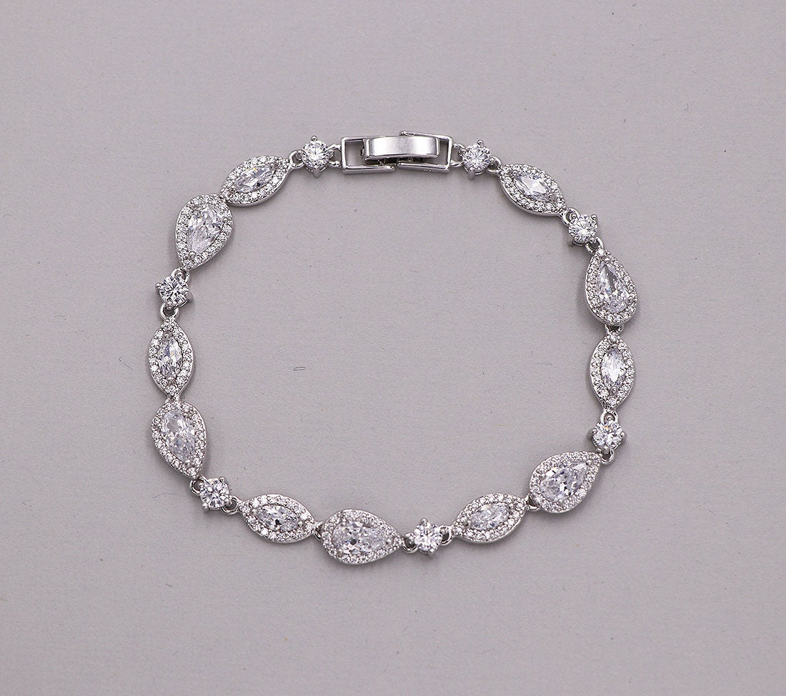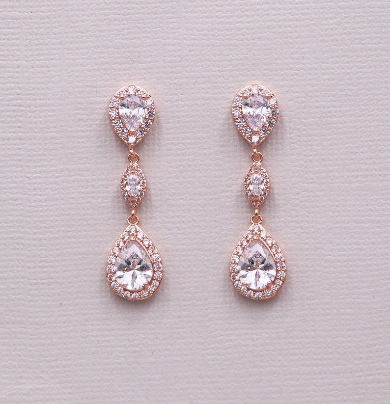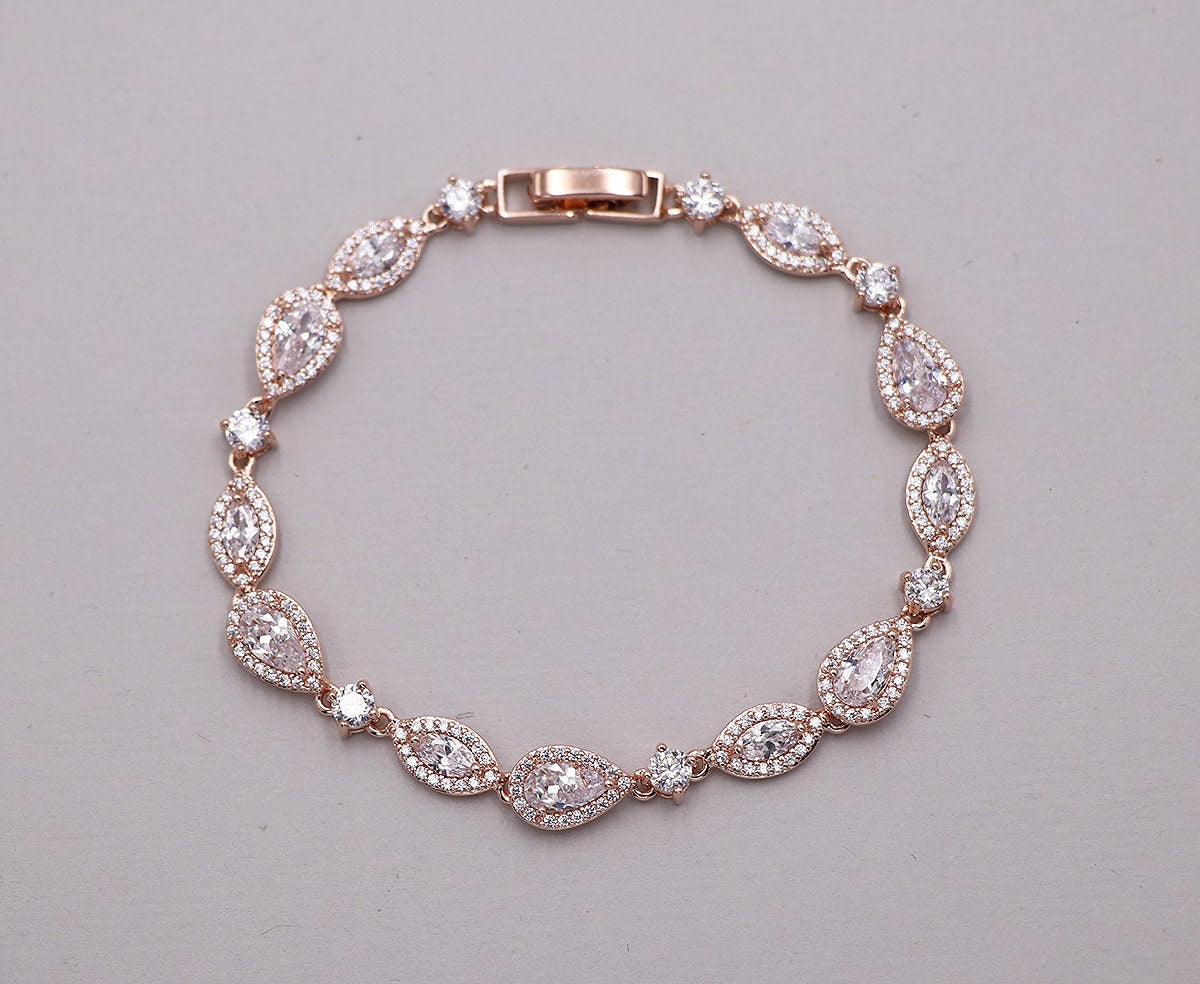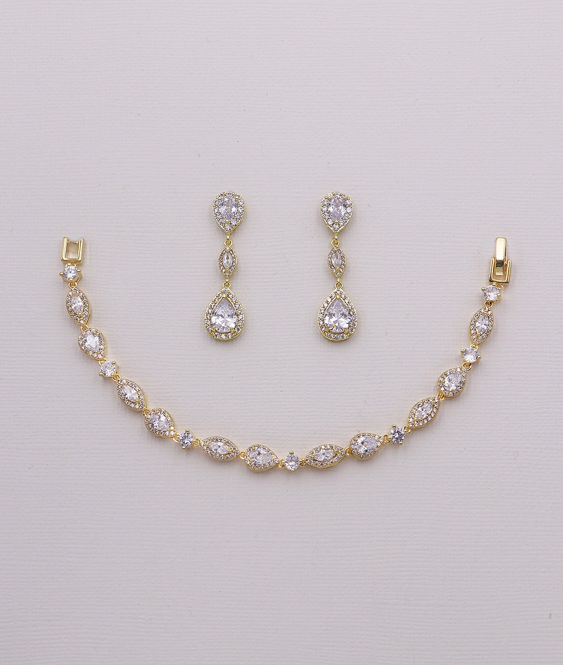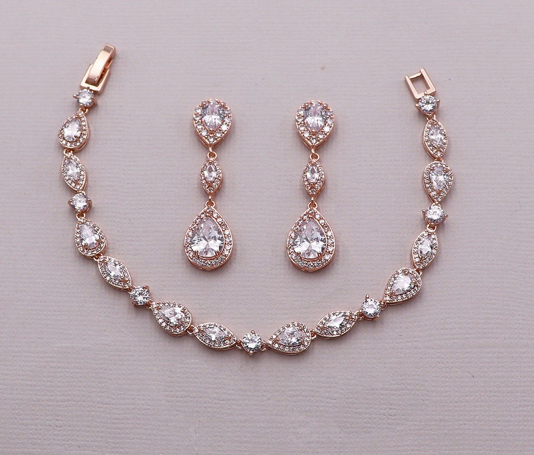 Add sparkling elegance with these exquisitely designed pave framed cubic zirconia teardrop wedding earrings. Earrings measure 1 1/2" long and feature a pear top portion, a halo marquise piece ending in a dangling tear drop pear accents set in brilliant rose gold. Available in silver, gold or rose gold finish. Optional matching bracelet measures 7" long.