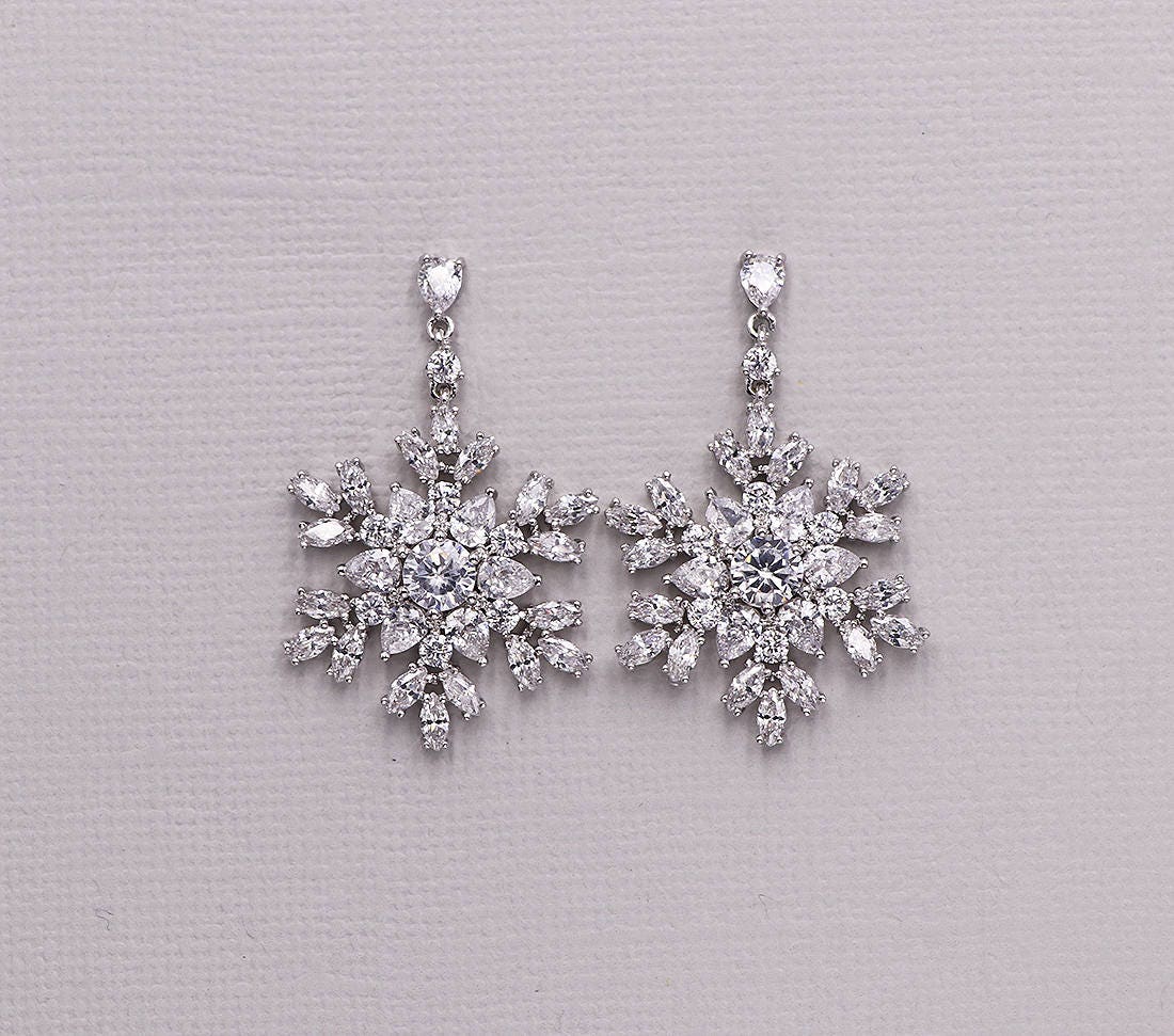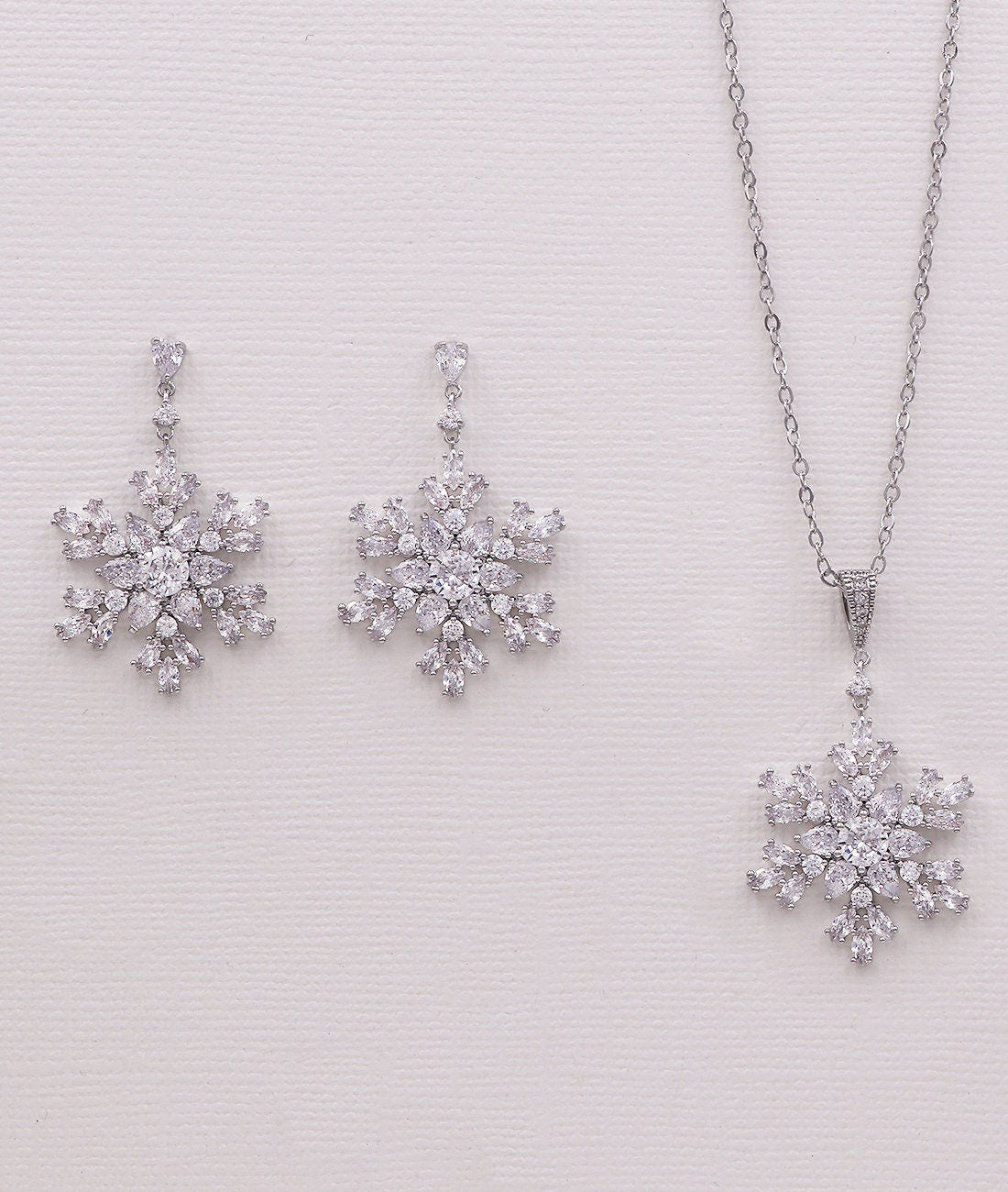 These shimmering stud earrings boasts AAA grade cubic zirconia stones in a clustered snowflake design. Earrings measure 1" 1/4 long and are perfect as a gift or for the winter wedding! Matching necklace is adjustable from 16"-18" long.