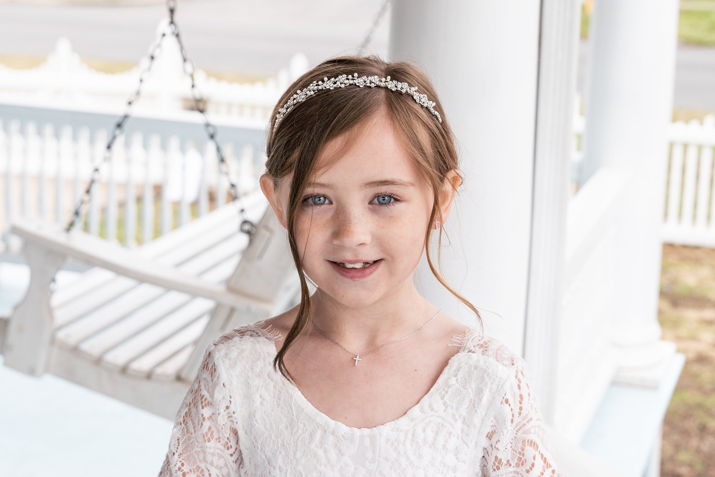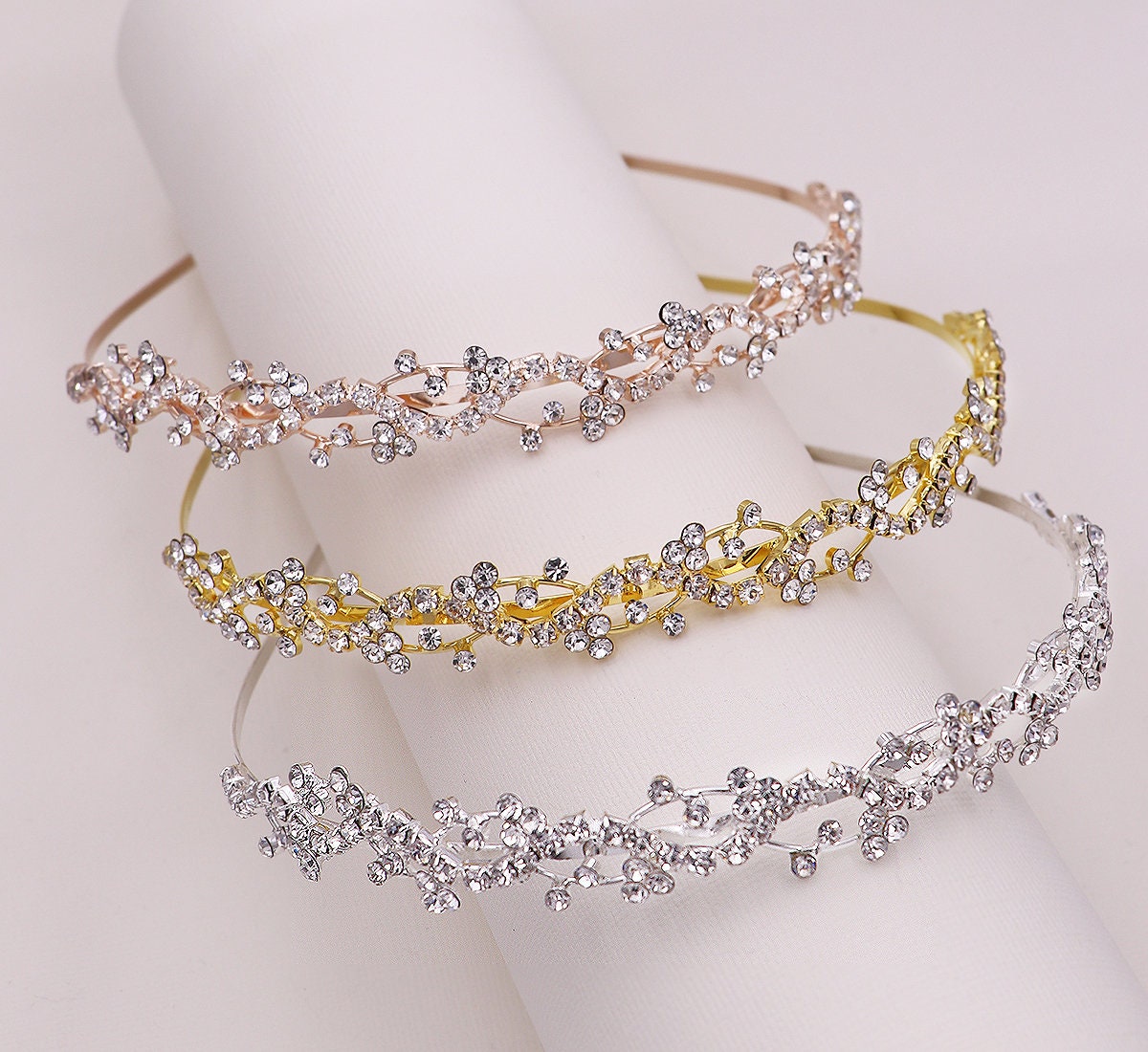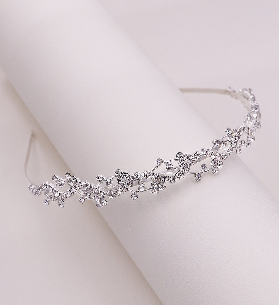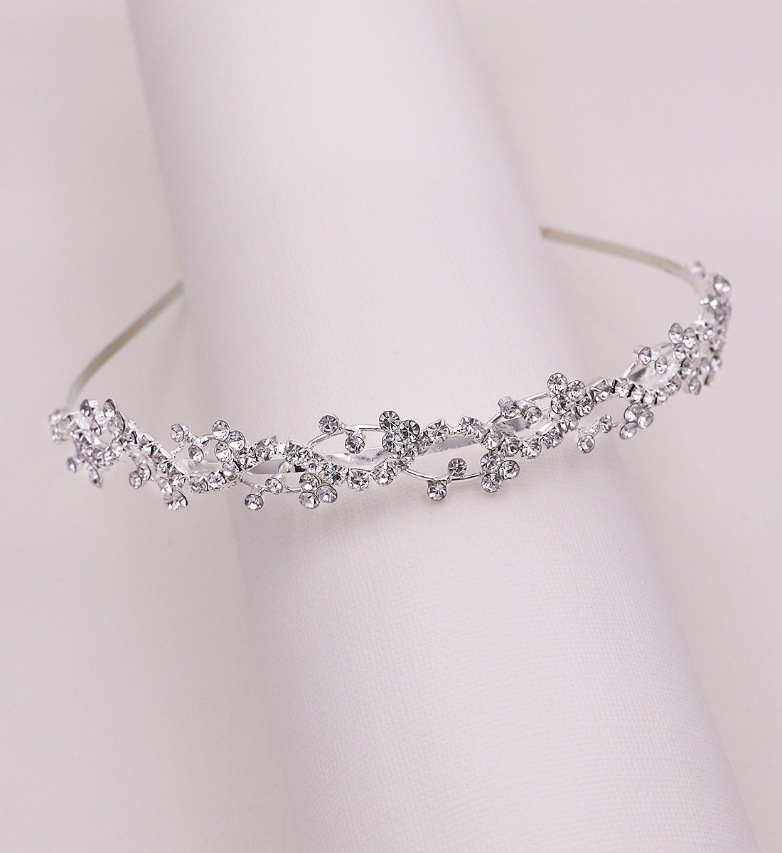 This sparkling flower girl headband features brilliant rhinestones in a wavy, vine like pattern. This headpiece is perfect for the flower girl, first communion or birthday party! Measuring 1" high, this sparkling headpiece is sure to add sparkle to your special day! Available in silver, gold and rose gold.