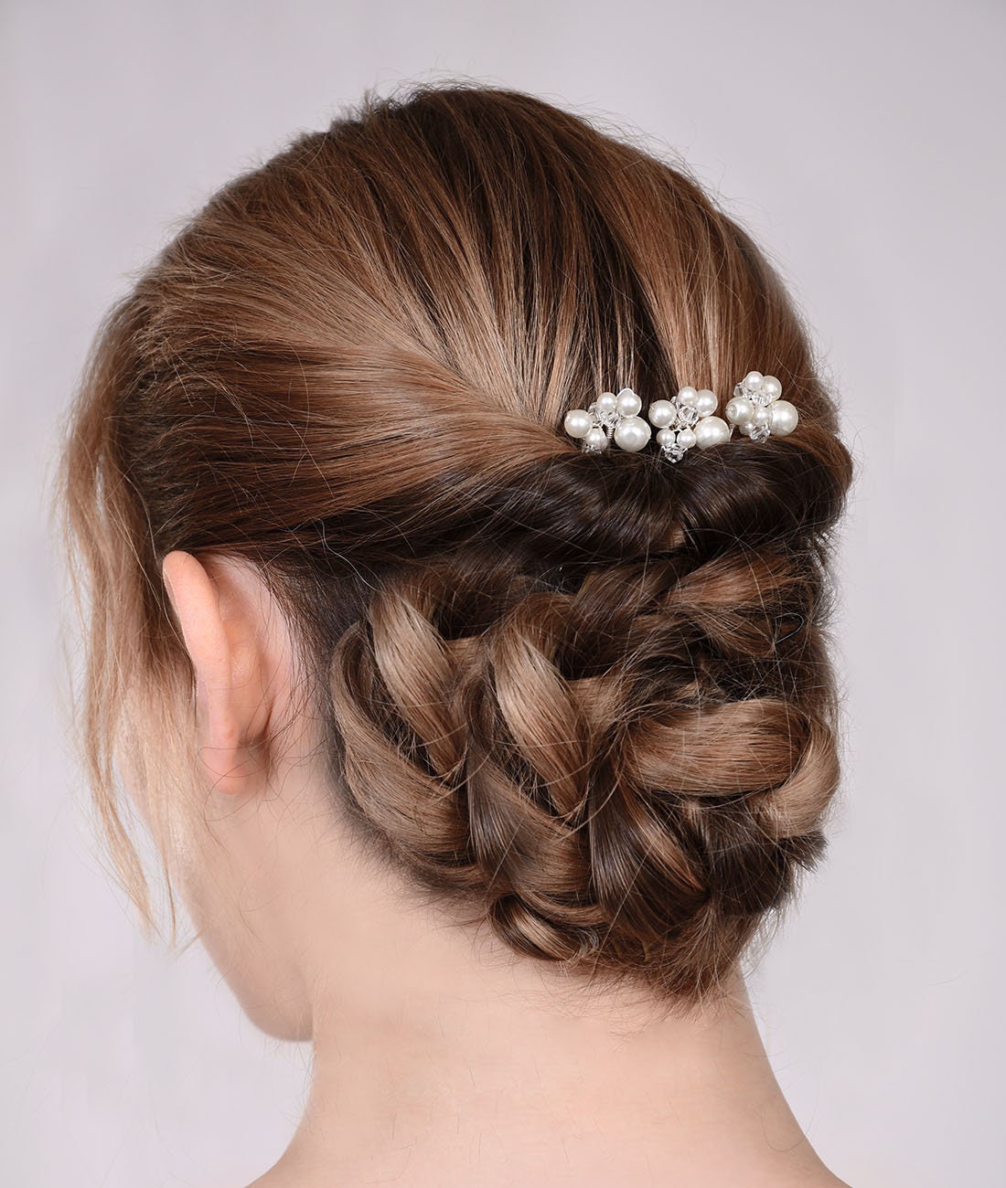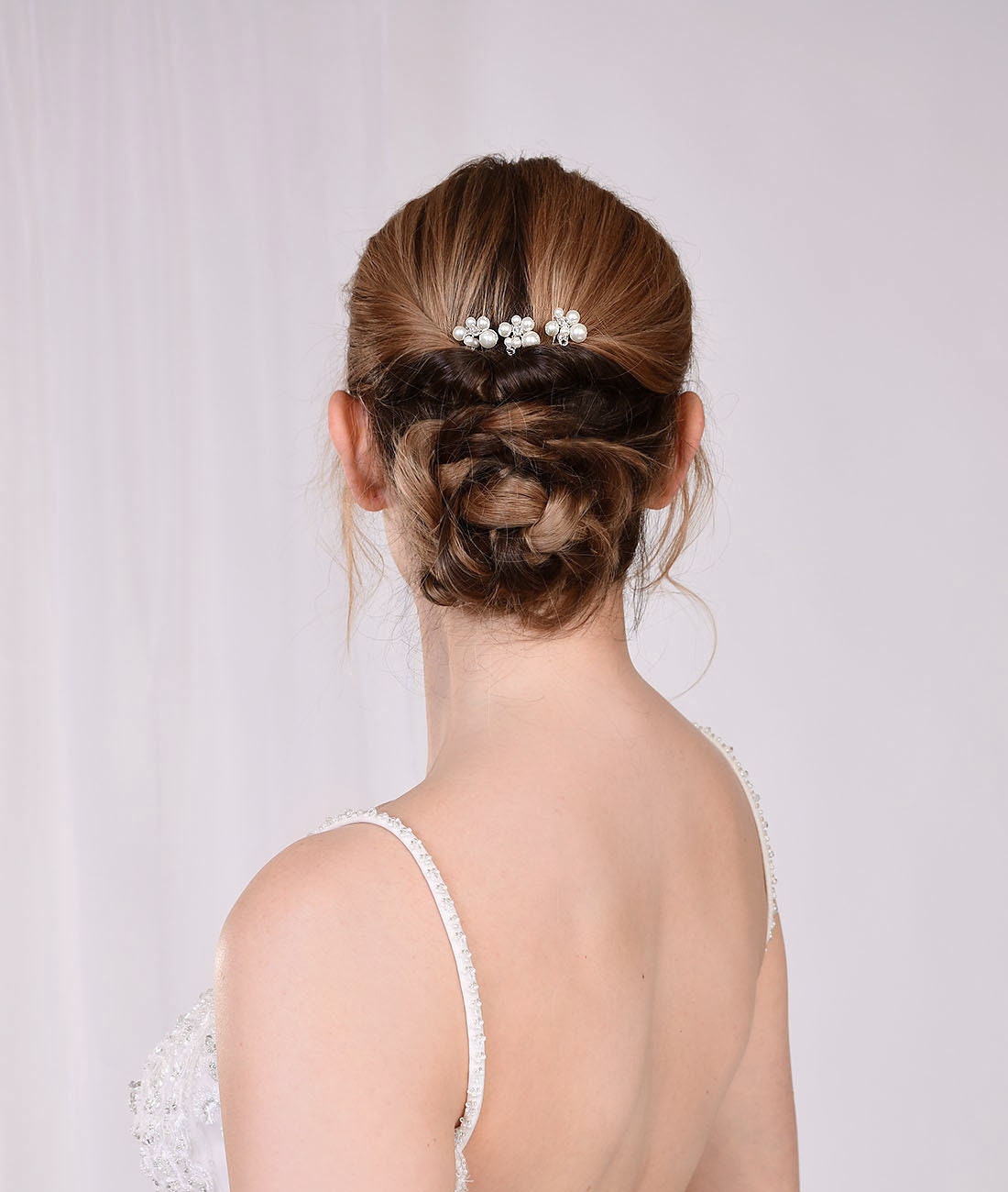 This sparkling, cluster hair pin will add brilliance and luster to your special day! Features top quality crystals and pearls hand-wired in a cluster pattern. Measures 1/2" wide and can be worn alone or clustered with more in your hair. Choose from silver, gold or rose gold finish. Sold in set of two pins.
