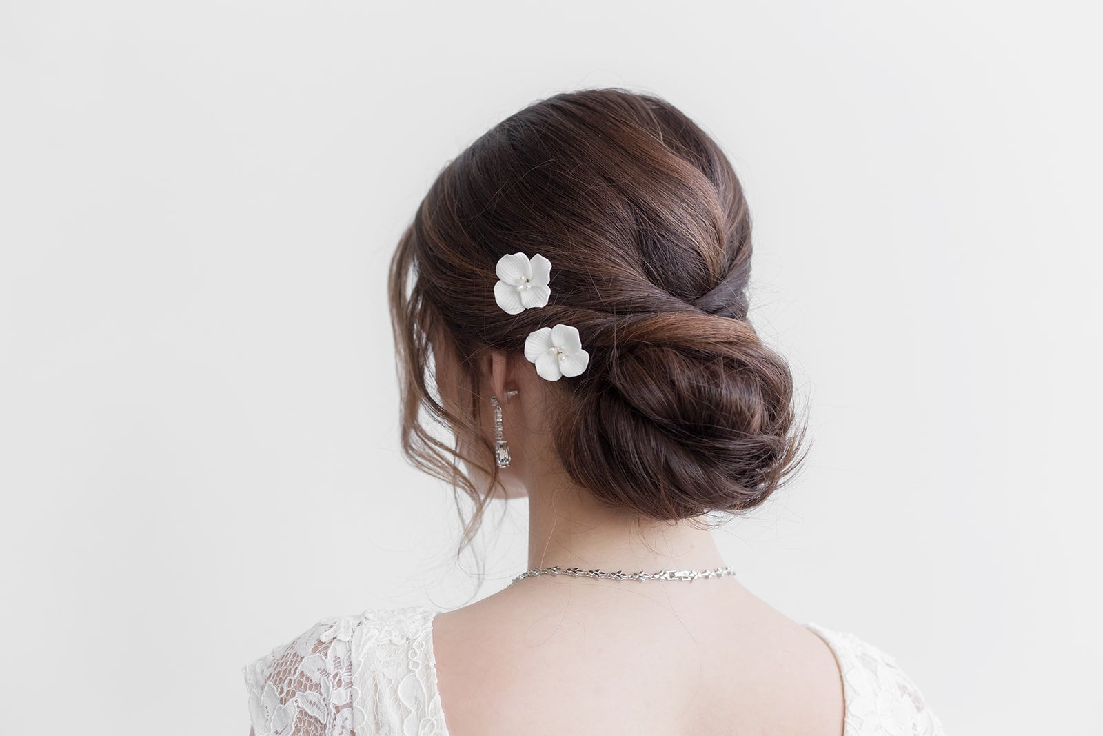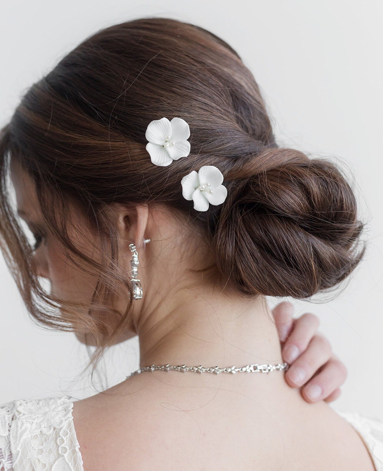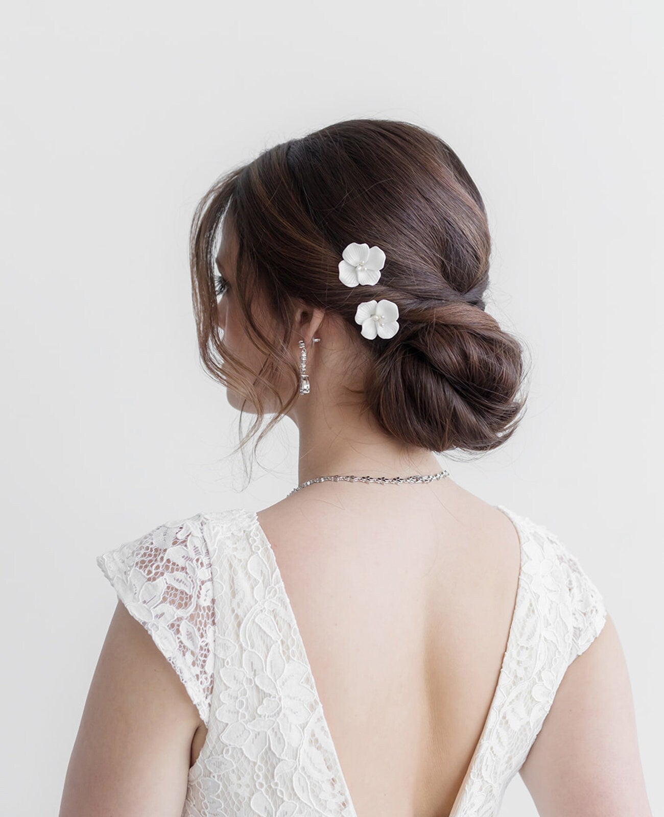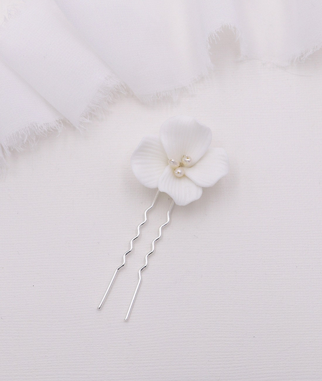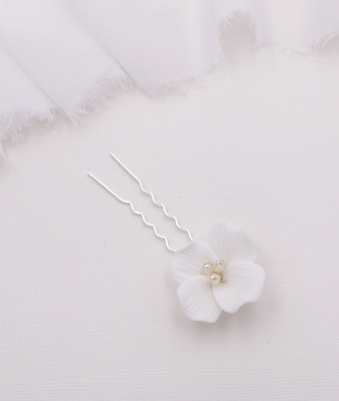 This elegant hair pin is sure to add an organic floral look to your special day! Features a handmade and molded polymer clay off-white flower with petite genuine freshwater pearls in the center. Flower portion measures 1 1/4" and can be worn alone or as a cluster in your hair.