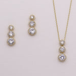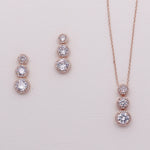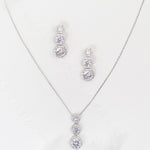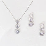 Add a touch of sparkle and these classically designed framed round cubic zirconia wedding earrings and necklace set, with stones that gradually get larger as they dangle with sparkle. Measuring 1 1/2" long, these are perfect for any special occasion. Matching necklace is adjustable and measures 16-18" long. Choose from earrings and necklace or with coordinating bracelet measuring 7" long. Available in silver, gold or rose gold.