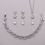 Add dainty elegance with these cascading cubic zirconia teardrop wedding earrings, featuring marquise and pear clusters ending in elongated teardrops. Earrings measure 1 3/4" long (available in pierced and clip ons), these are perfect for any special occasion. Choose from silver or rose gold! Matching optional necklace measuring 16"-18" (adjustable), matching bracelet completes the look measuring 7".