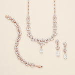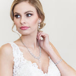 Add dainty elegance with these cascading cubic zirconia teardrop wedding earrings and necklace set, featuring marquise and pear clusters ending in elongated teardrops set in brilliant rose gold. Standard necklace measures 17" with an additional 2" adjustable clasp. Full CZ necklace option is available in 17" and 19" with an additional 2" adjustable clasp. Full CZ option that has the cubic zirconia stones all the way to the clasp (see images for example). Earrings measure 1 3/4" long (available in pierced or clip ons), these are perfect for any special occasion. To perfectly compliment these sparkling dangle earrings, the Camilla bracelet (optional) is available measuring 7" long. Choose from silver, gold or rose gold!