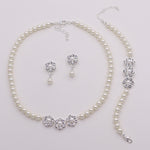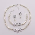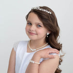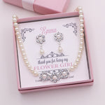 Perfect for that adorable little girl, this necklace, bracelet and earrings set is sure to add that finishing touch! Jewelry features high quality ivory glass pearls accented with brilliant crystal daisies. Necklace is child-sized and adjustable measuring 14 1/2"-16 1/2" long. This jewelry set is perfect paired with matching pearl dangle earrings measuring 1". Matching (optional) bracelet measuring 5 1/2"-7 1/4" is also adjustable. This set is perfect for flower girls, junior bridesmaids, first communions and more! Each set comes on a custom, personalized jewelry card featuring your choice for the name, title, font color and box color. Please put this information into the notes section in the cart when ordering.