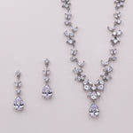 This brilliant jewelry set will surely make a statement on your special day! Boasting AAA grade cubic zirconia stones in a mosaic design ending in pear teardrops. Necklace measures 17" long, earrings measure 1 3/4".