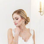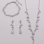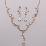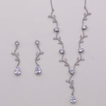 This brilliant jewelry set will surely add sparkle on your special day! Boasting brilliant cubic zirconia in a floral like vine design. Necklace measures 16" long and has an extender for additional length, earrings measure 1 3/4". This set is perfect for the bride, bridesmaids, or any special occasion! Can be ordered with matching bracelet that is adjustable from 7"-9" long. Choose from silver or rose gold.