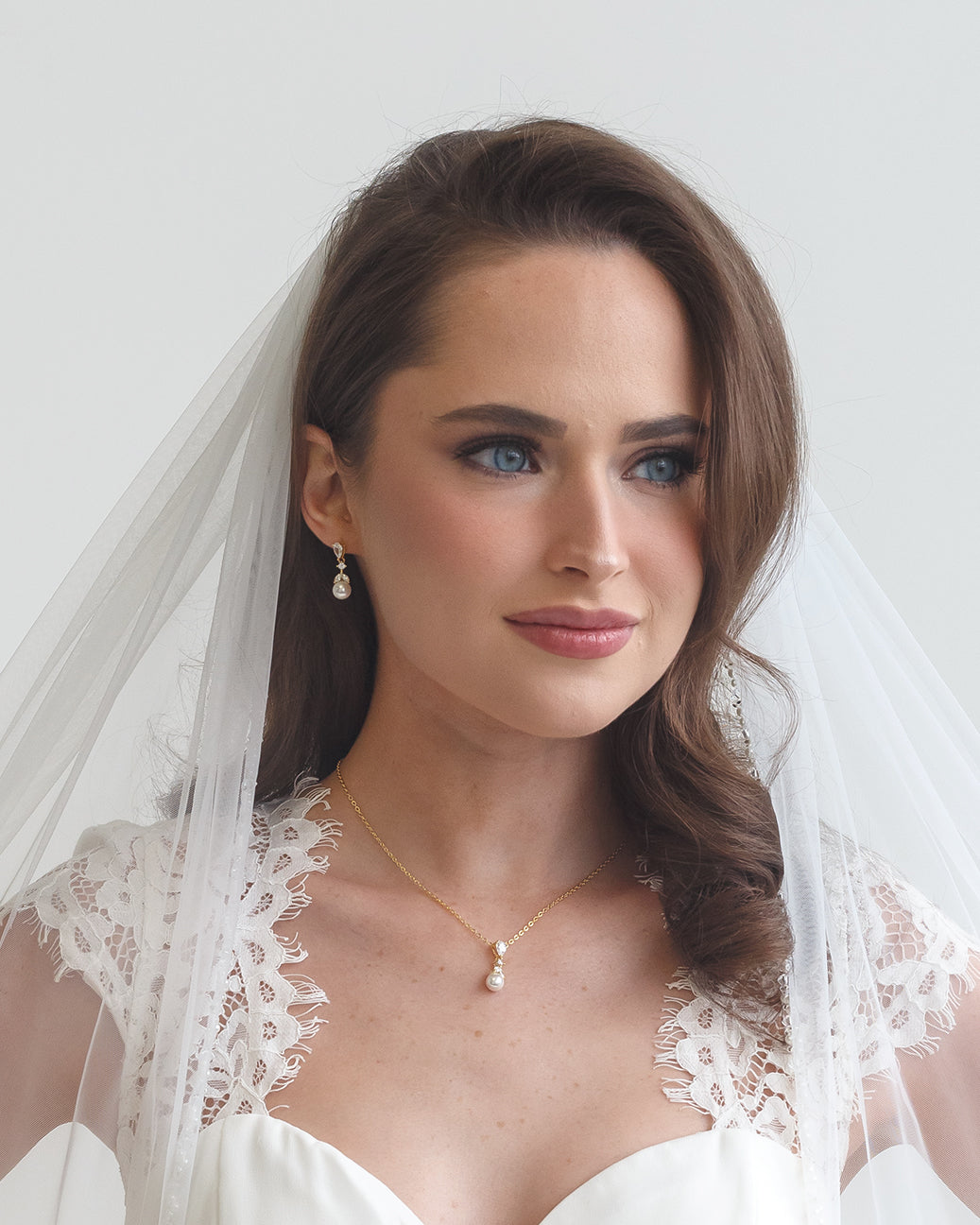 This earrings, necklace and bracelet set are elegantly designed with AAA grade cubic zirconia stones with a dangling 6mm creamy ivory glass pearl. Measuring 1", these lustrous earrings are perfect for a wedding, jewelry gift, bridesmaids, or any occasion! Matching necklace measures 16"-18" long (adjustable) and optional bracelet measures 7".