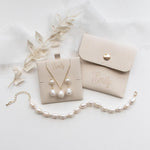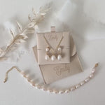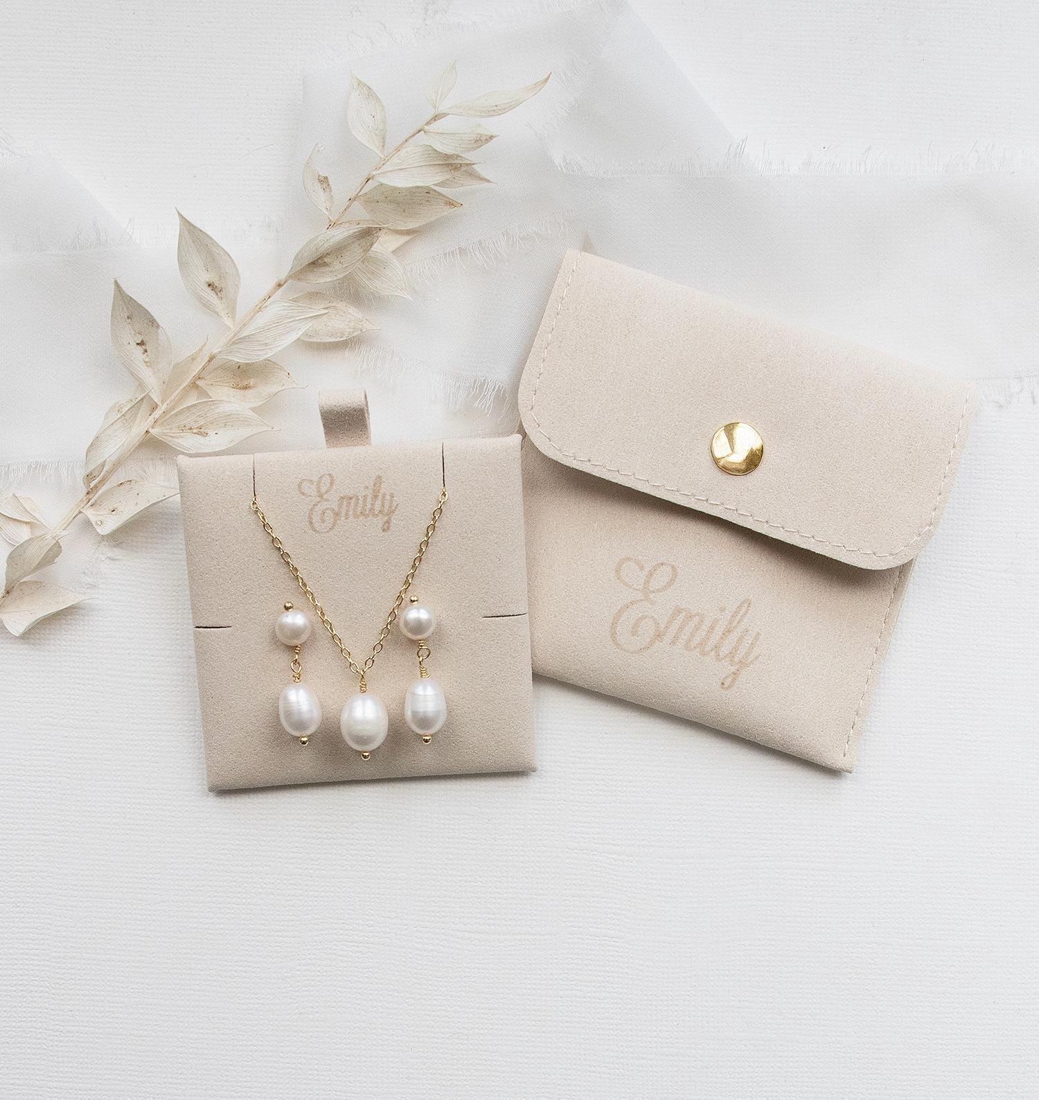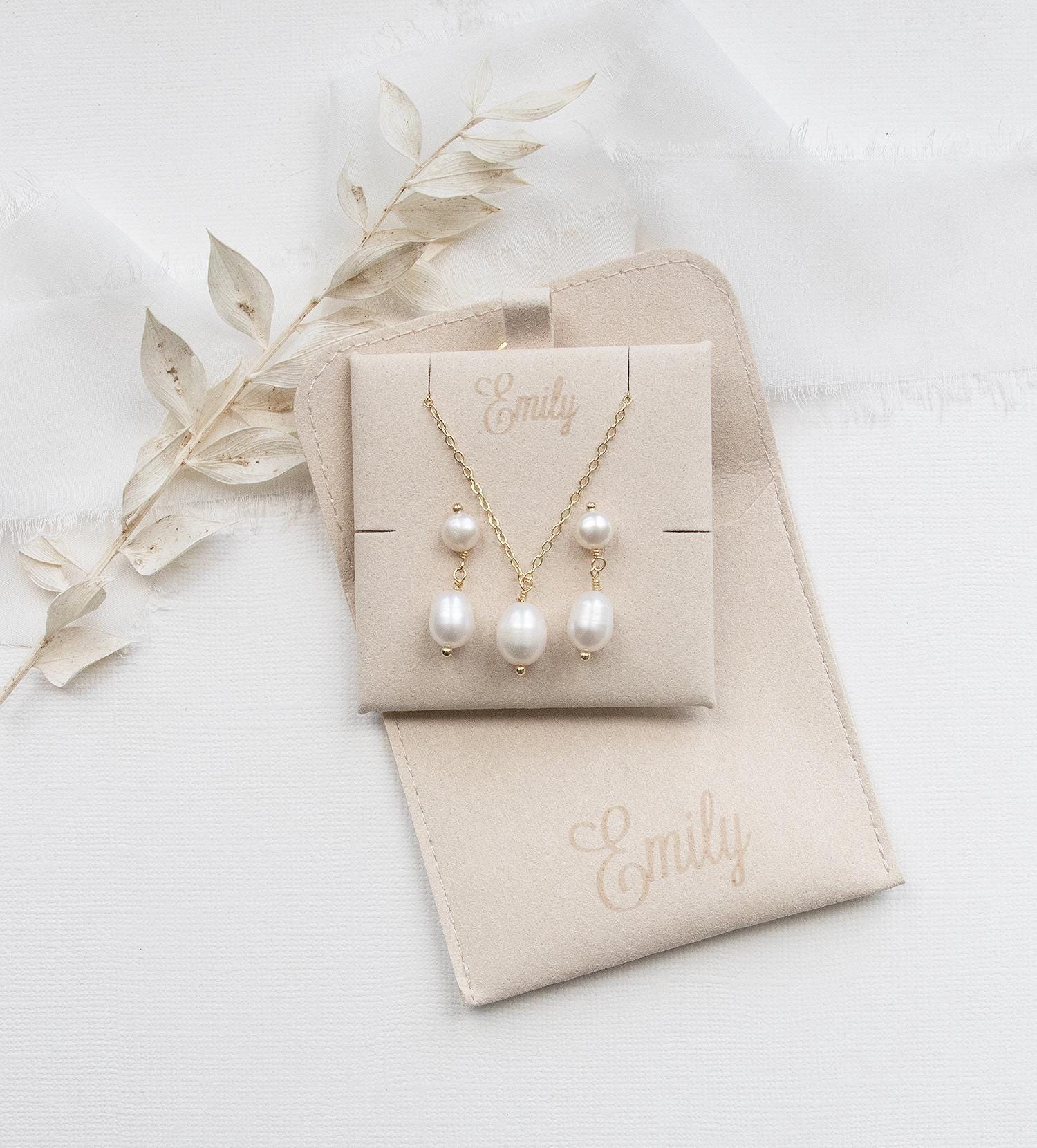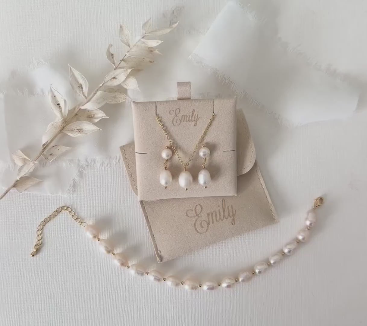 Each piece is crafted with dainty freshwater pearls and a high-quality gold finish for a classic, feminine look that she can wear every day. The optional personalized pouch adds a thoughtful detail she’ll cherish long after the jewelry is worn.