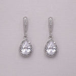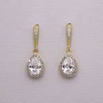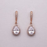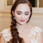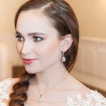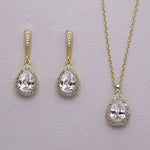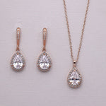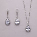 These classically designed earrings and necklace set features a framed cubic zirconia teardrop dangling from a CZ encrusted French hooks. Measuring 1 1/2", these brilliant earrings are perfect for the bride who wants a sparkling and classic style earring. Matching pendant necklace measuring 16"-18" (adjustable). Choose from silver, gold or rose gold finish. This jewelry set is also perfect for the bridesmaids, parties, or any special occasion! Choose from optional and gorgeous bracelet measuring 7".
