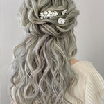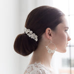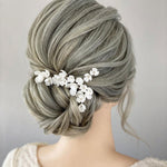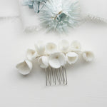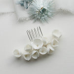 This elegant hair comb is sure to add floral beauty to your special day! Features handmade polymer clay off white flowers with tiny seed bead center. Measures 2 1/2" wide and 1 1/2" tall.