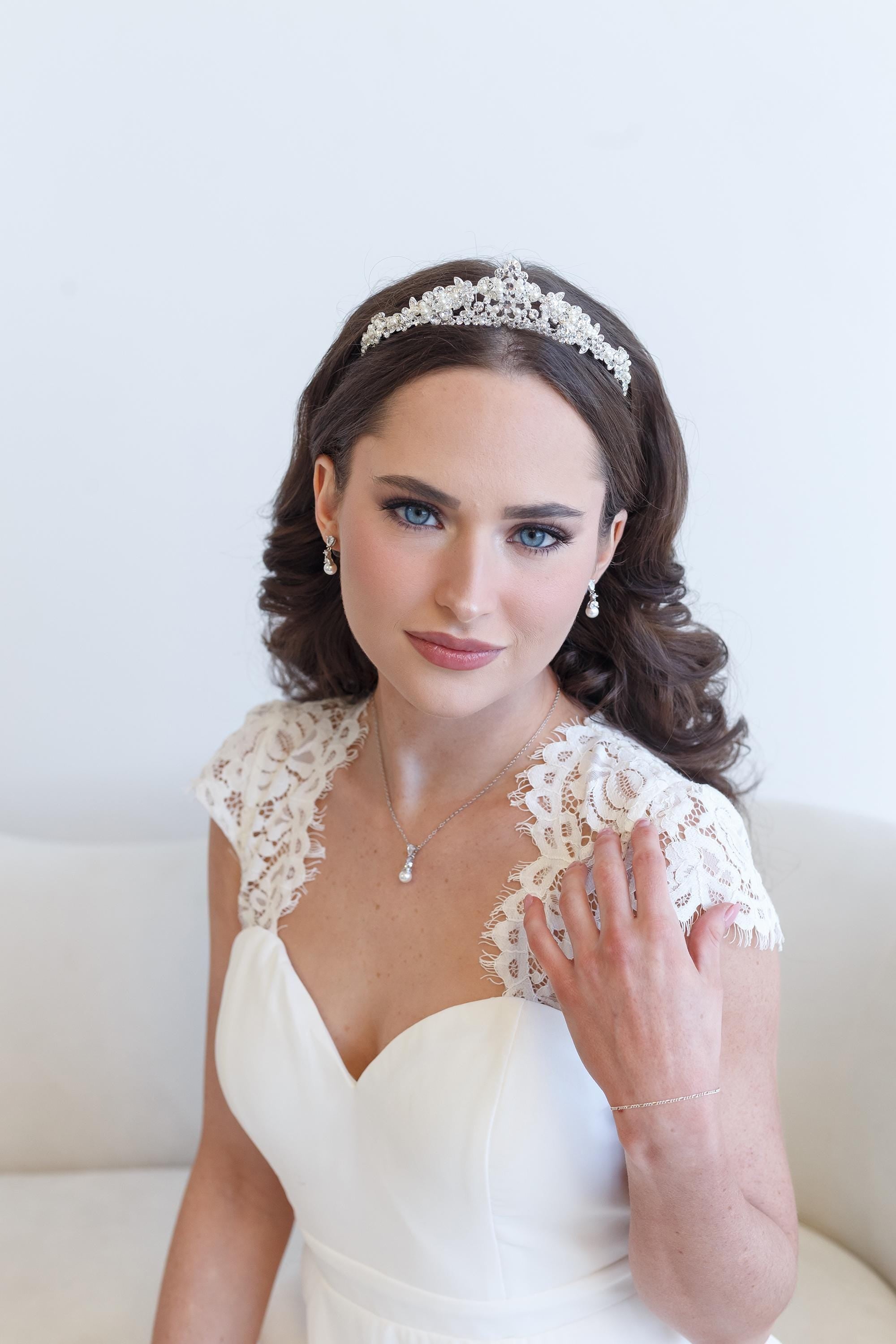 This brilliant wedding tiara for brides is uniquely designed with rhinestone crystals and pearl accents for a sophisticated look. Balancing symmetry and beauty, this wedding tiara measures 1.25" at the highest point, this sparkling headpiece is sure to add beauty and elegance to your special day! This tiara is perfect for weddings, bridesmaids, prom, and special occasions!