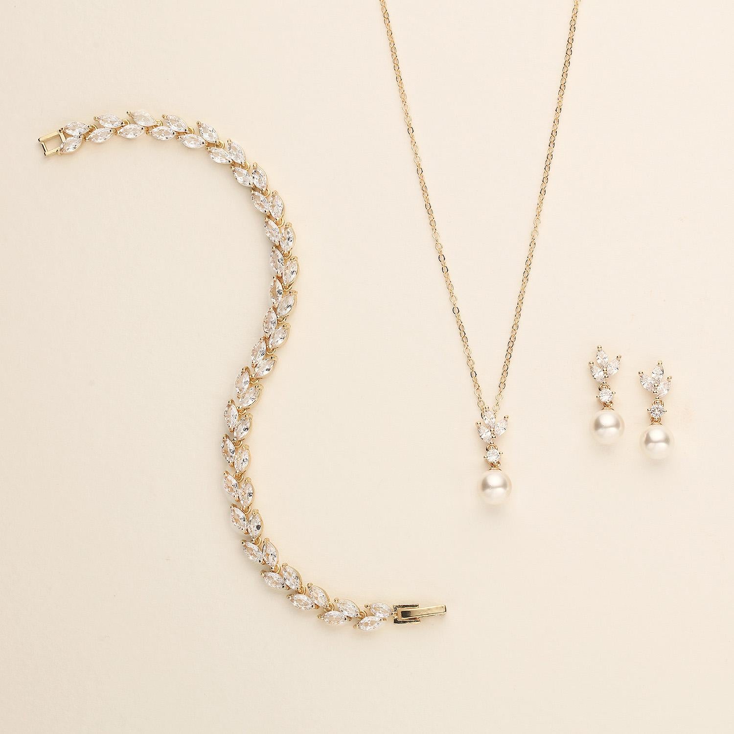 Now available with a custom jewelry pouch ready for gift giving! This sparkling bridesmaid jewelry gift necklace and earrings set will surely add brilliance to your special day! This gorgeous jewelry is perfectly matched with marquise cubic zirconia stones and 7mm off white glass pearls. This stunning set is perfect for the bride or makes a great bridesmaid jewelry gift!