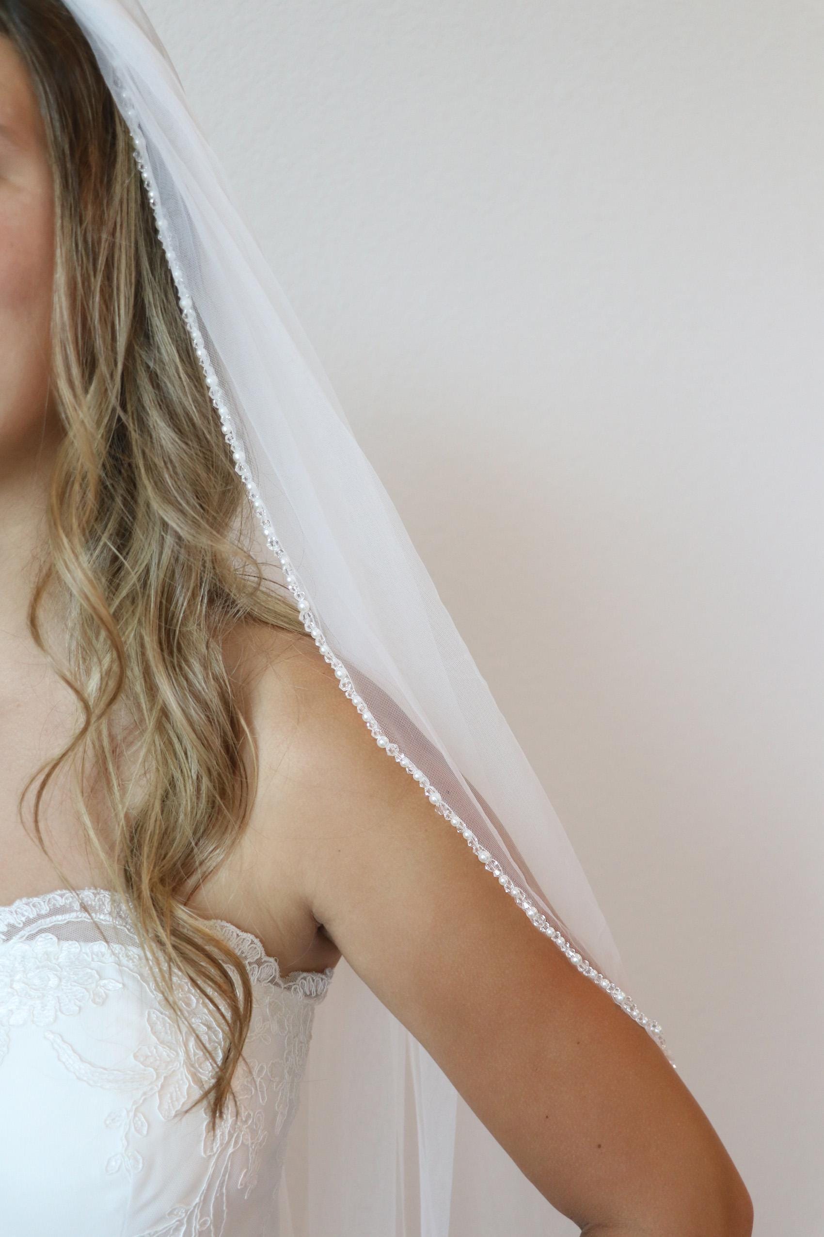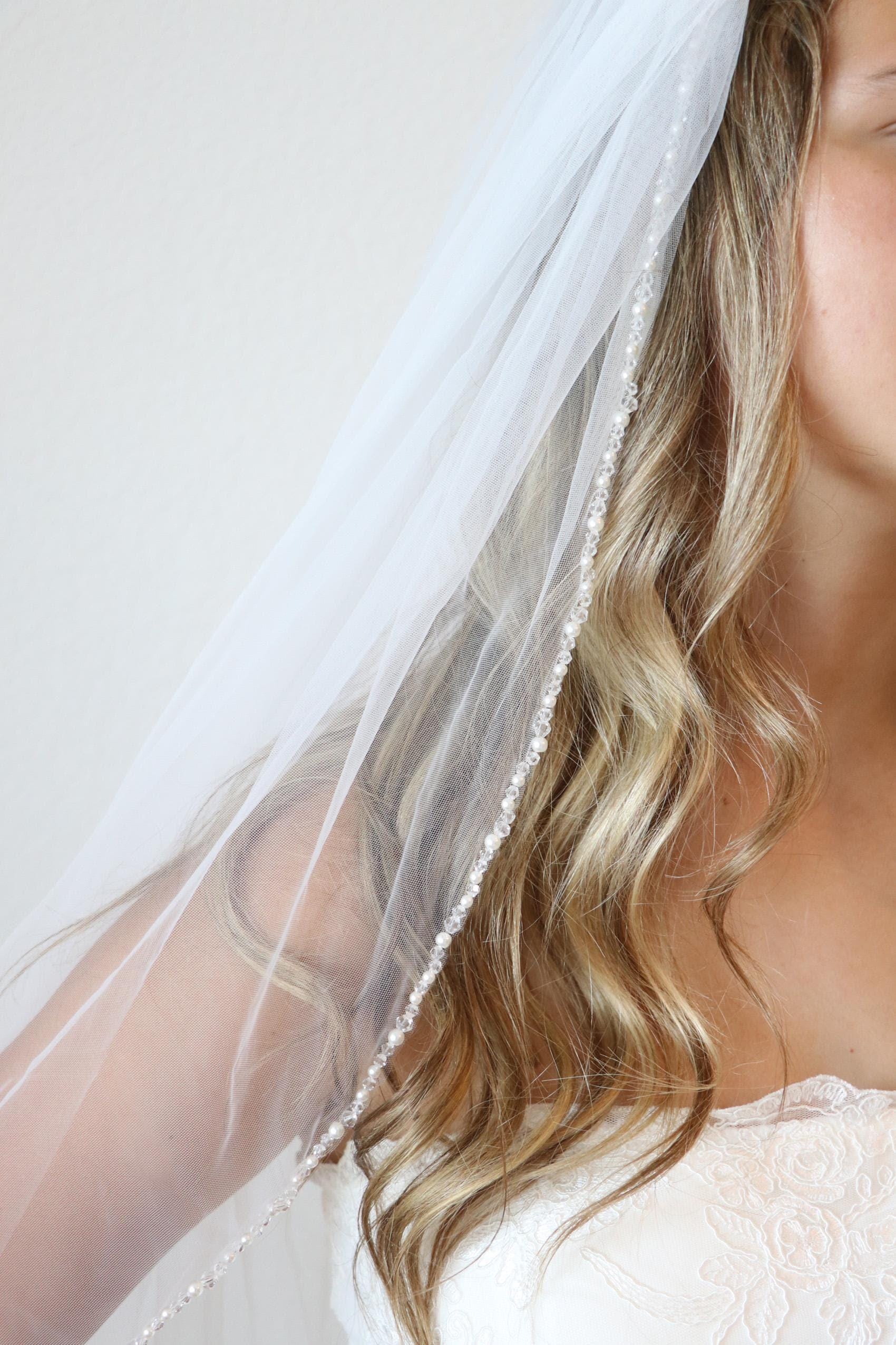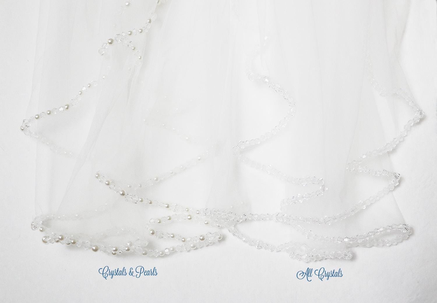 Now available with crystals and pearls or all crystals! Add that extra touch classic beauty with this gorgeous handmade, crystal and pearl beaded edge wedding veil! Each veil is handcrafted to your specifications with your option of pure white or pale ivory made with high quality English illusion tulle. Our tulle drapes beautifully and is very soft for a luxurious look and feel. Veil features a width of 62" and features a beaded edge of pearls and crystals for a sophisticated look. Veil is created on a 3" metal tooth comb.