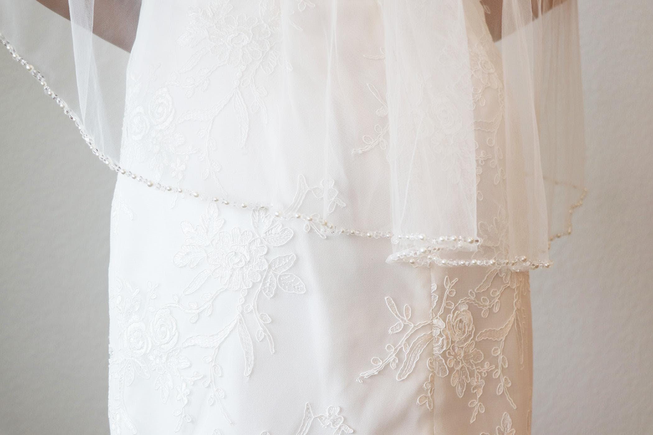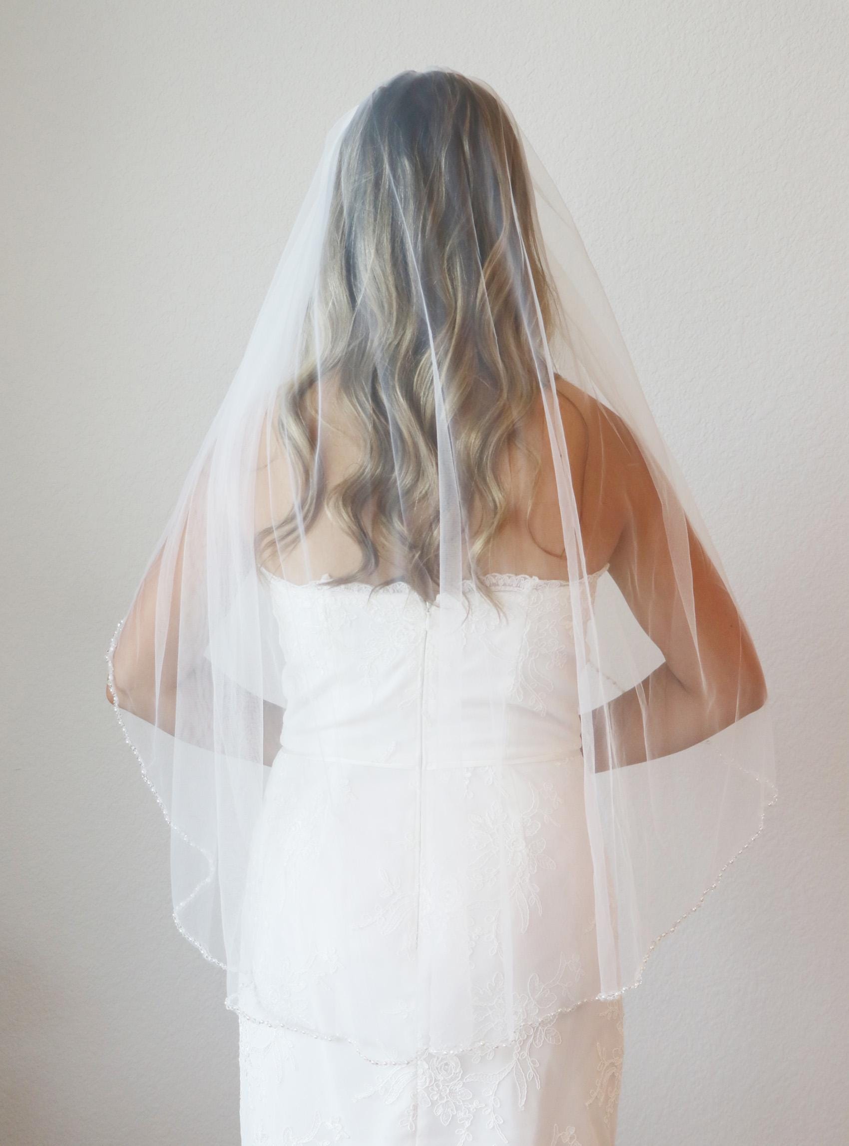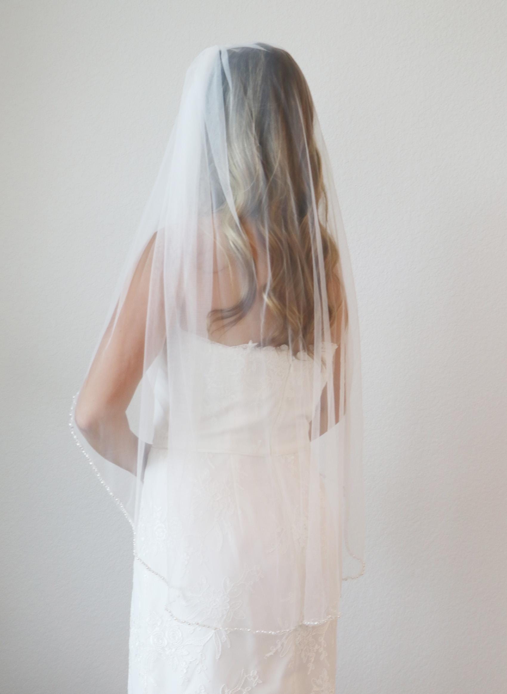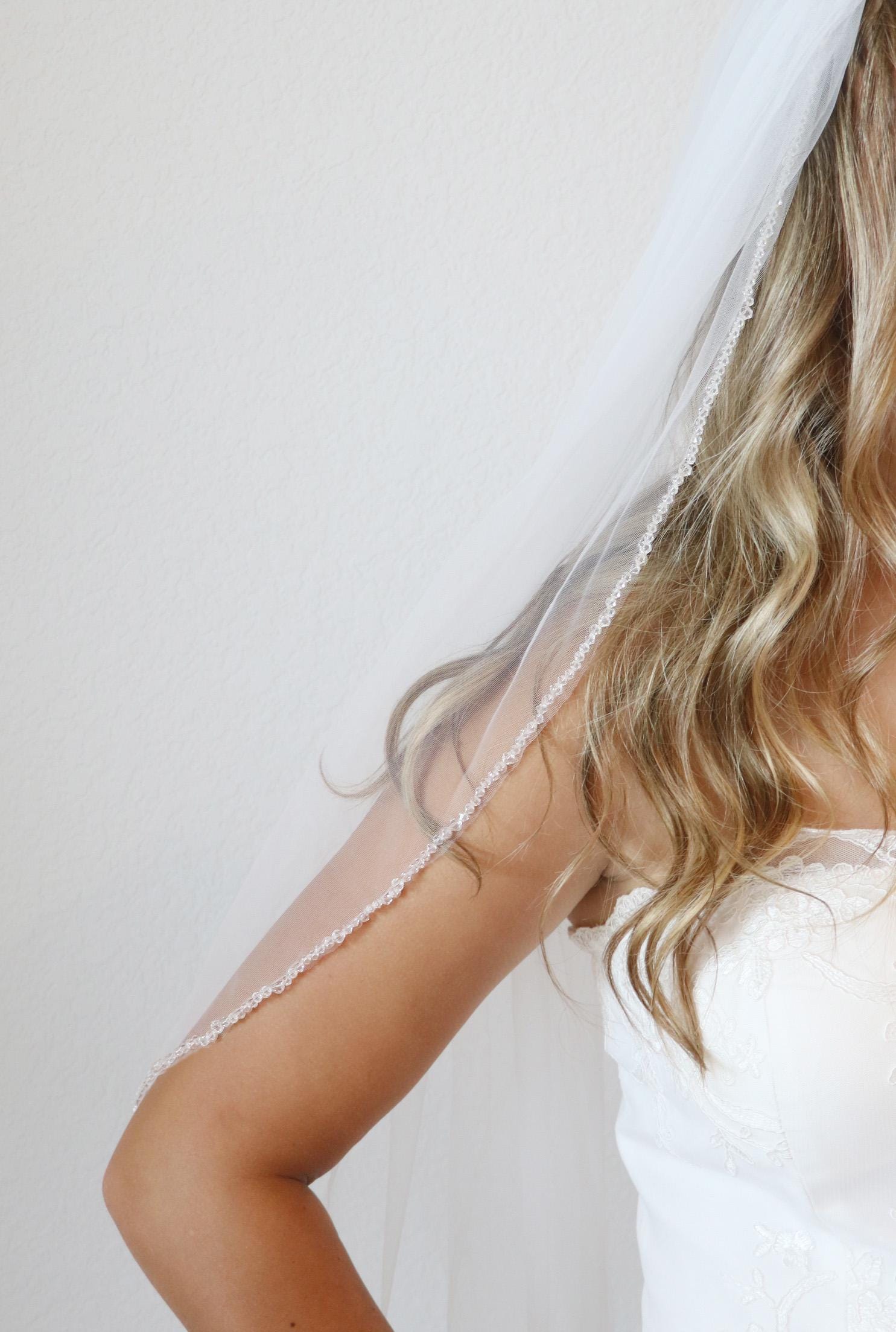 Now available with crystals and pearls or all crystals! Add that extra touch classic beauty with this gorgeous handmade, crystal and pearl beaded edge wedding veil! Each veil is handcrafted to your specifications with your option of pure white or pale ivory made with high quality English illusion tulle. Our tulle drapes beautifully and is very soft for a luxurious look and feel. Veil features a width of 62" and features a beaded edge of pearls and crystals for a sophisticated look. Veil is created on a 3" metal tooth comb.