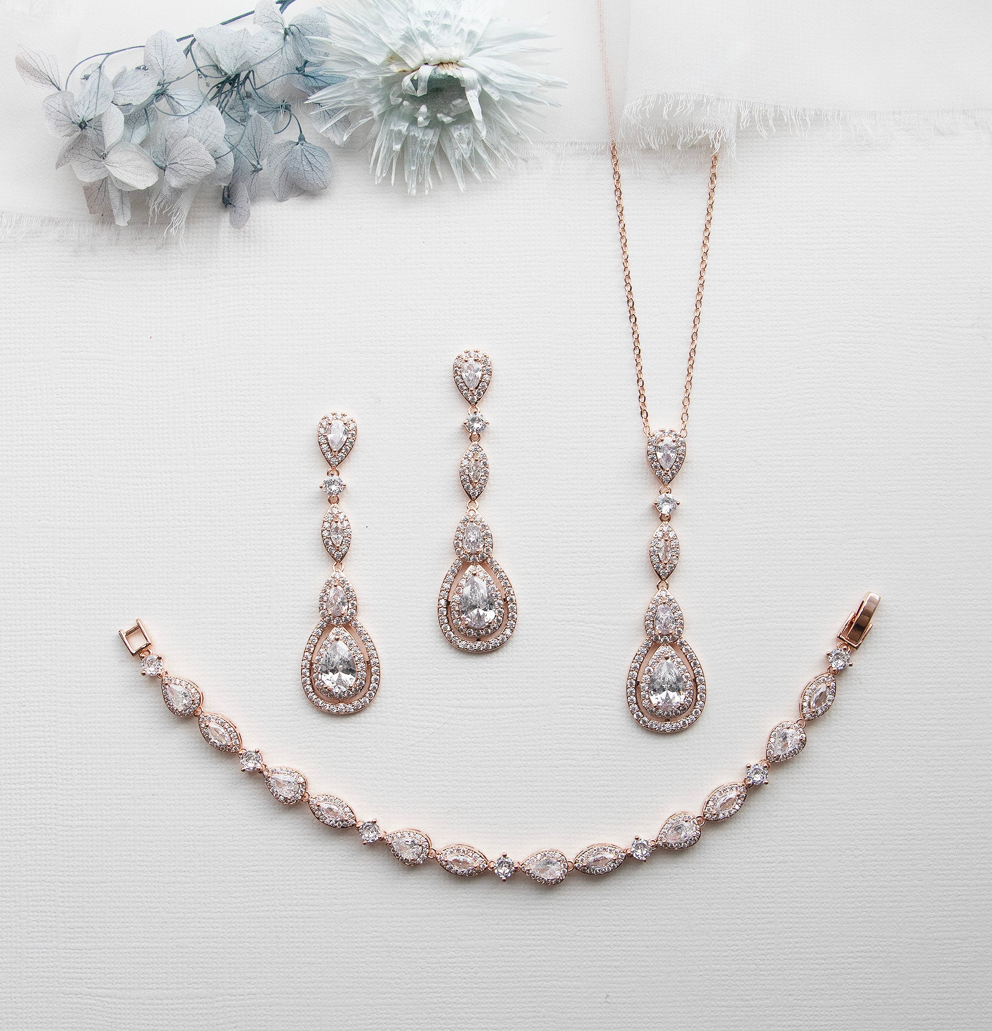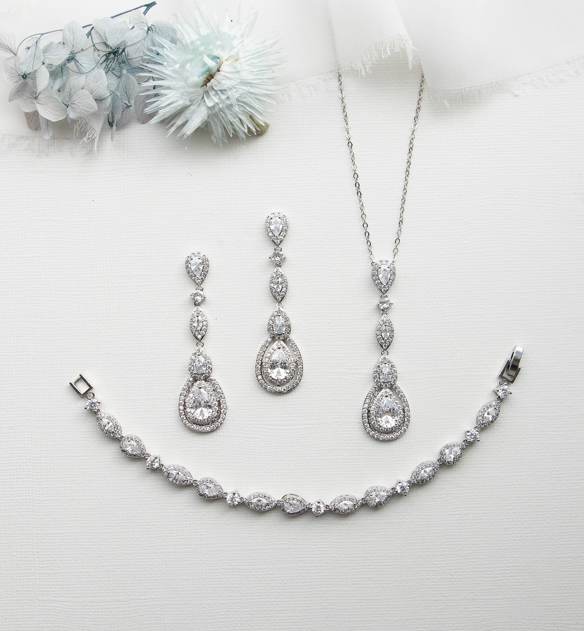 Add bold elegance with these exquisitely designed open framed cubic zirconia teardrop wedding pendant necklace set, featuring a pear top portion, a halo marquise piece ending in a double dangling tear drop pear accents. Design portion measuring 2" long, this is perfect for any special occasion. Necklace measures 16" and is adjustable up to 18" long. Choose from earrings and necklace set or with coordinating bracelet measuring 7". Available in silver, gold or rose gold.