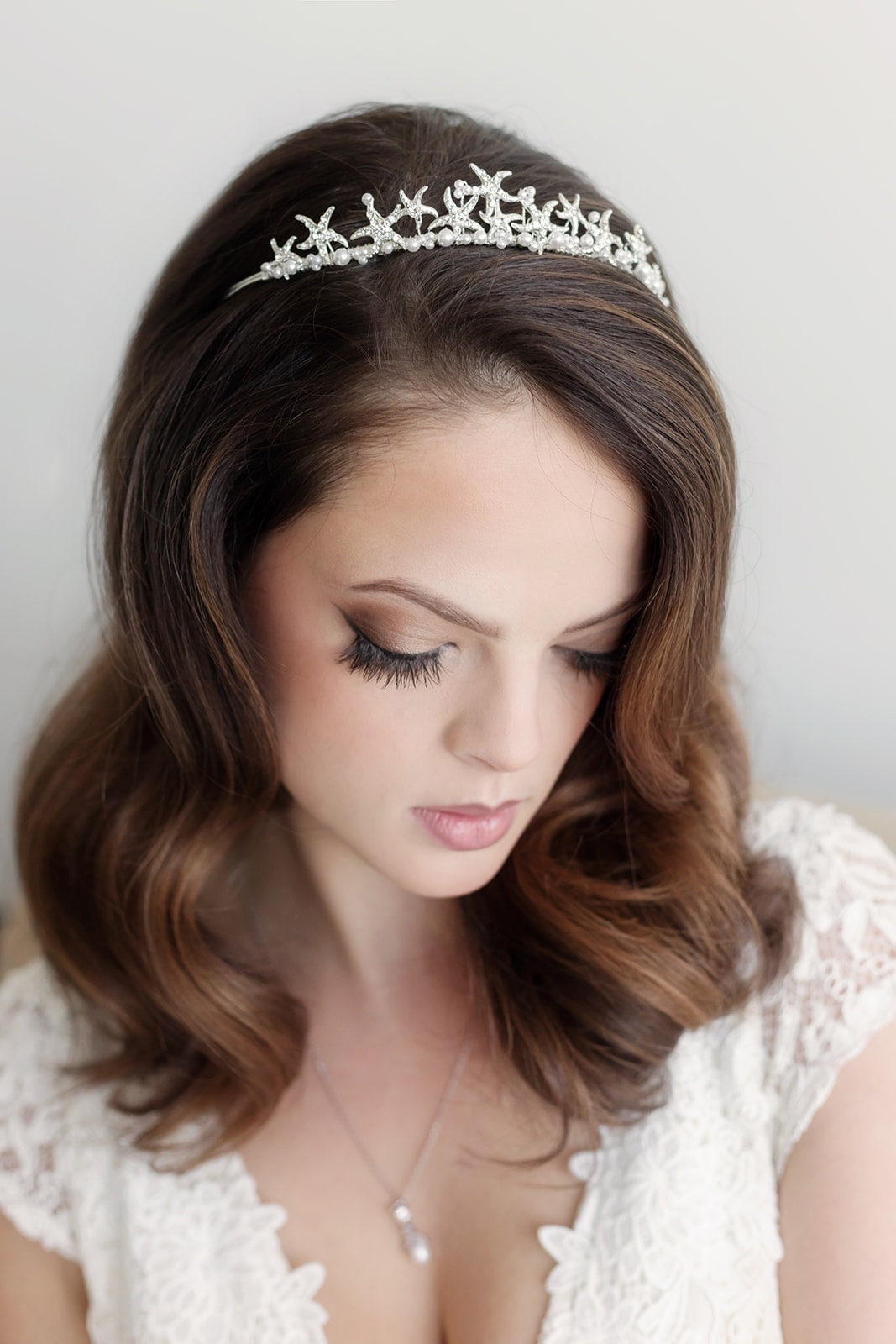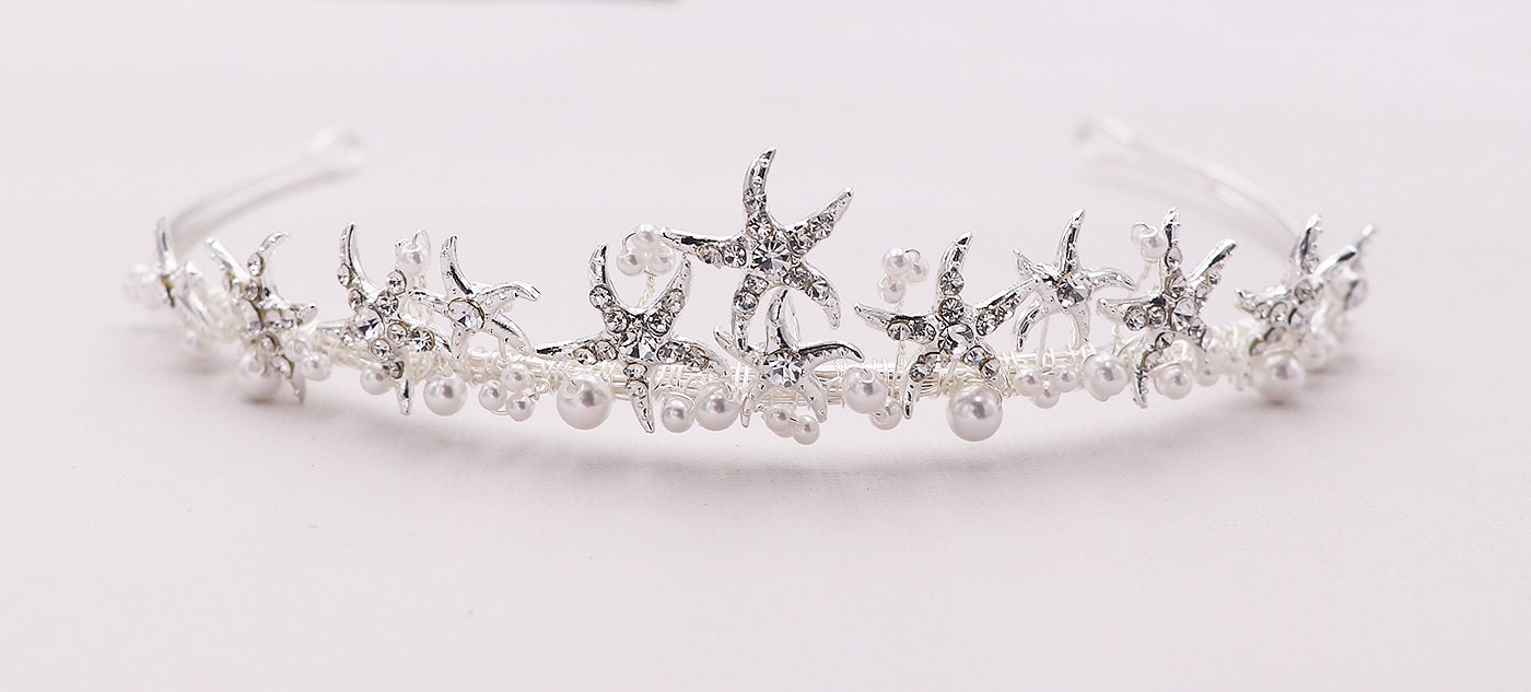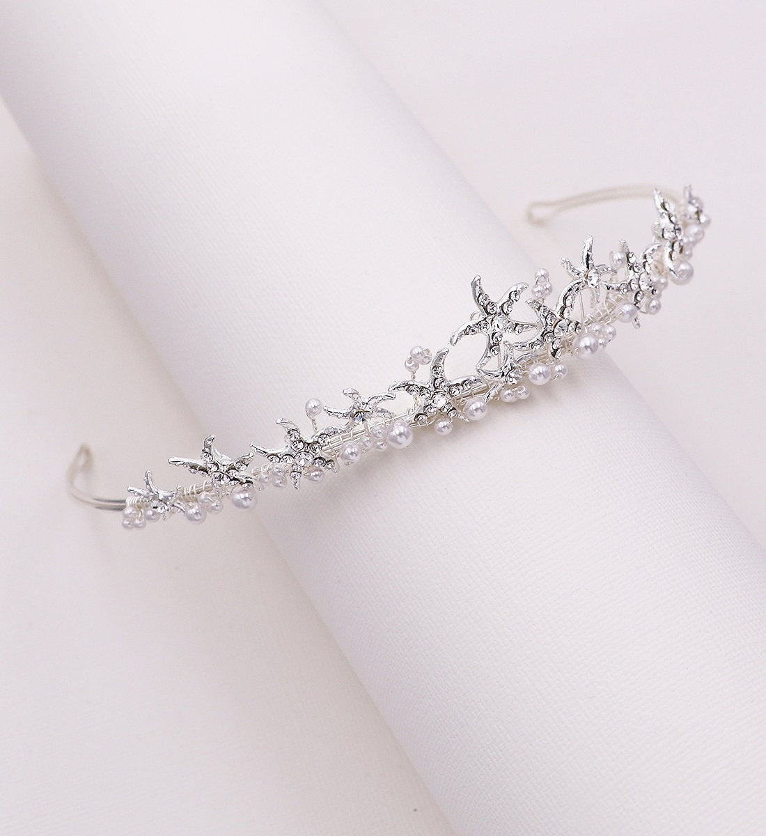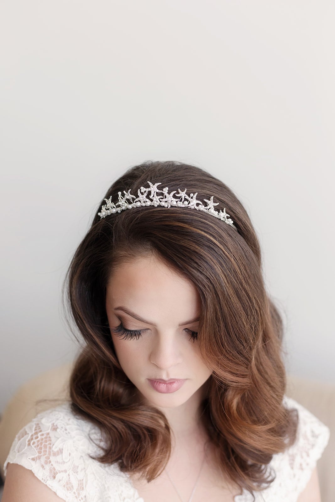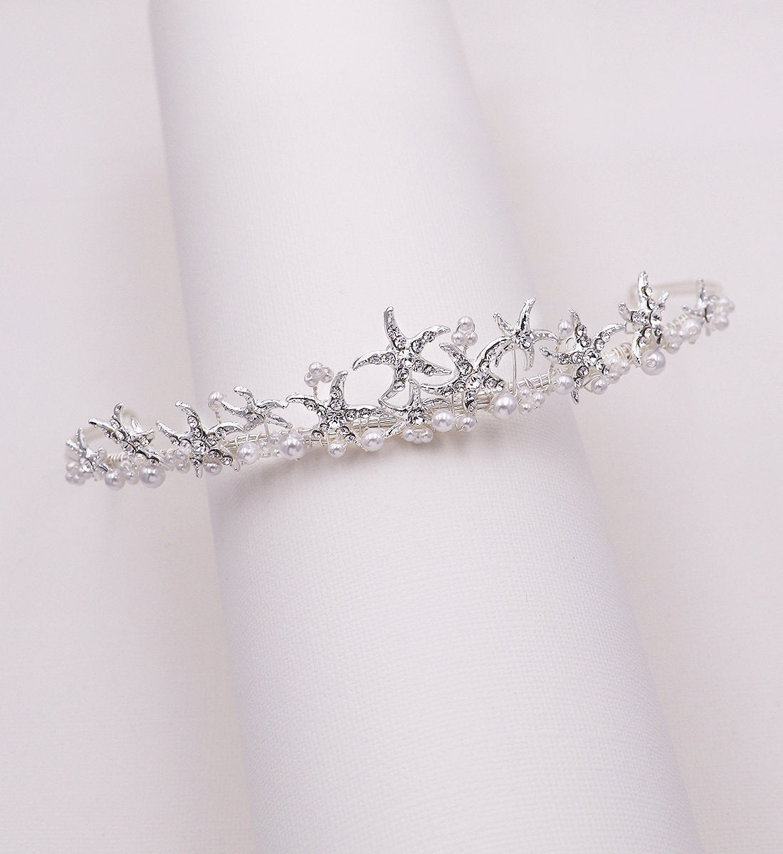 Add a touch of the sea with this unique bridal tiara featuring glass pearls and Swarovski rhinestone encrusted starfish. Plated in bright silver, this tiara measures a subtle 1" tall and would be perfect for the beach bride or any destination event!