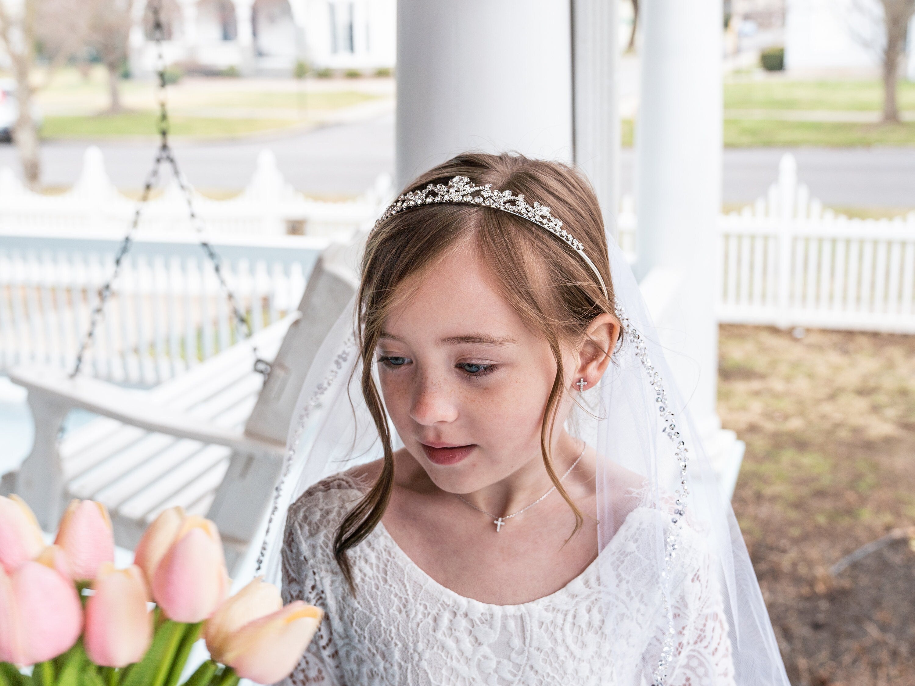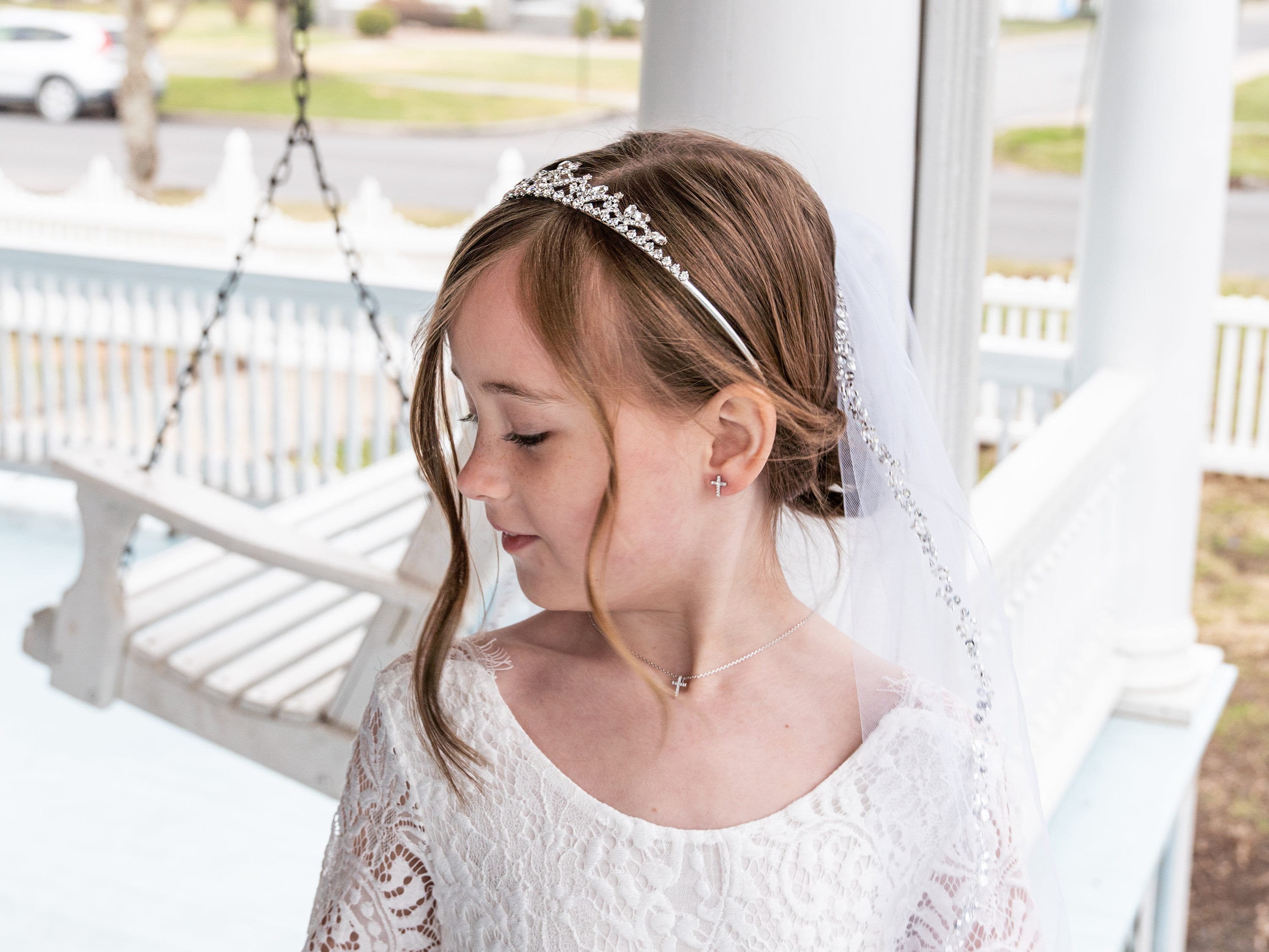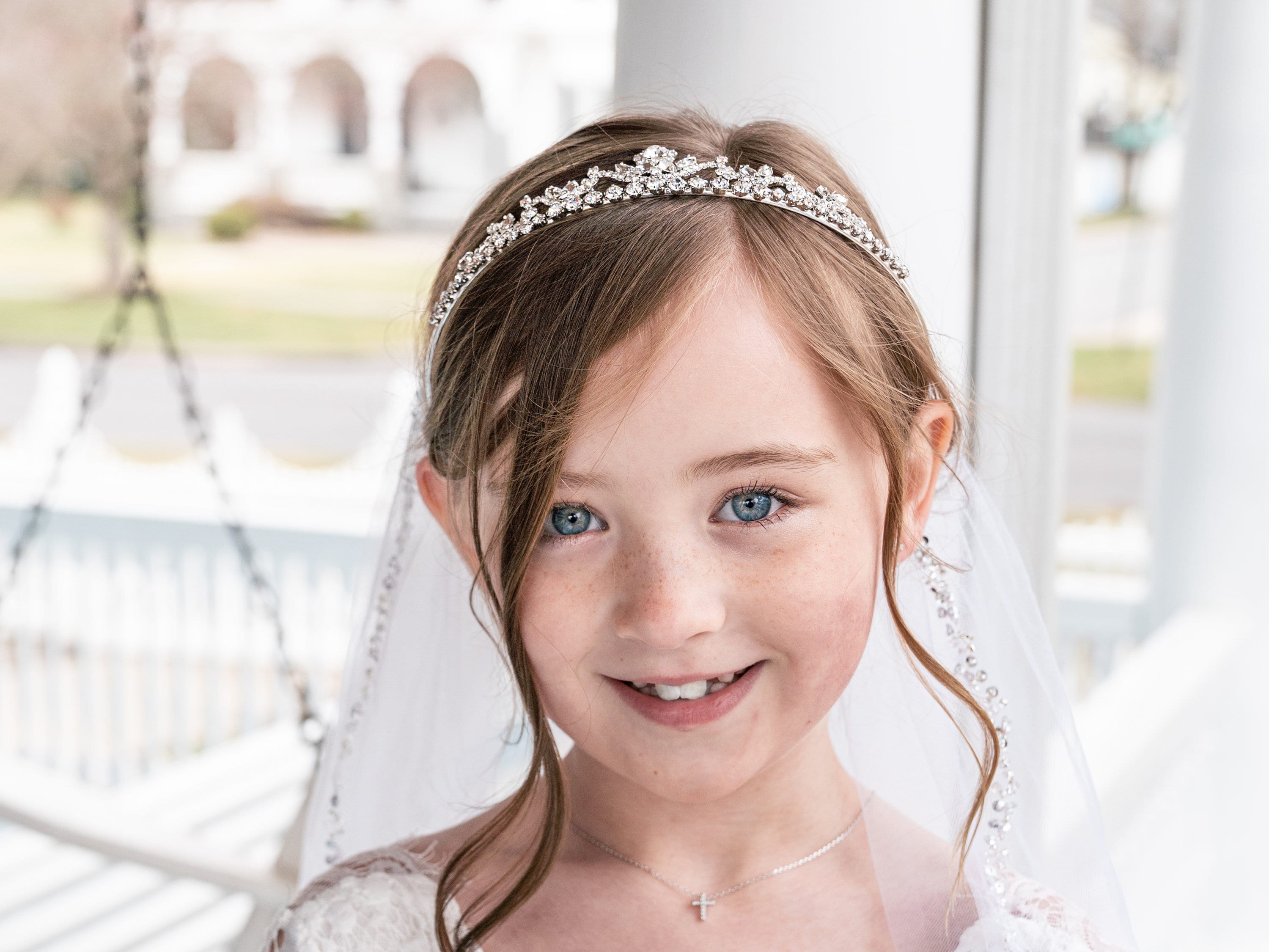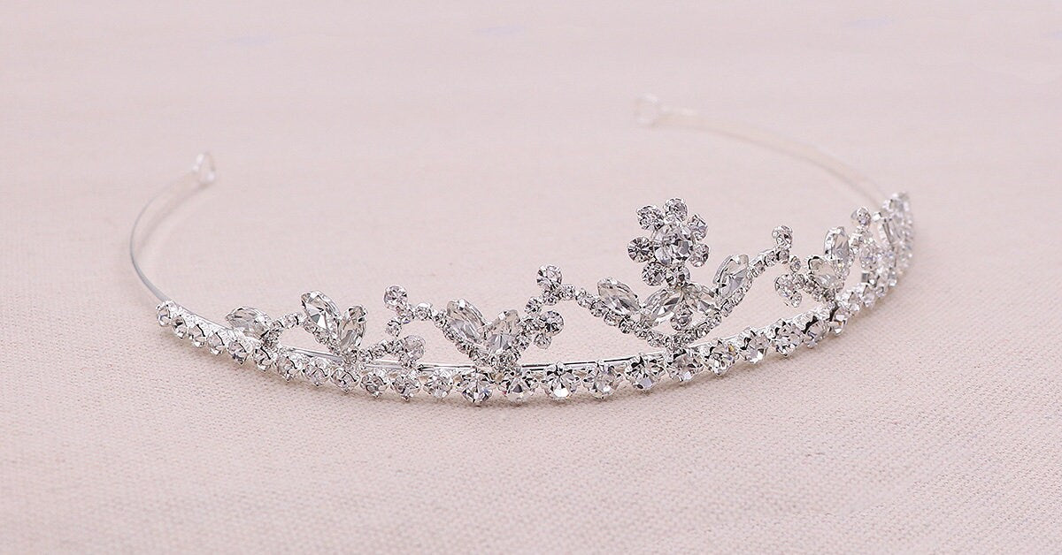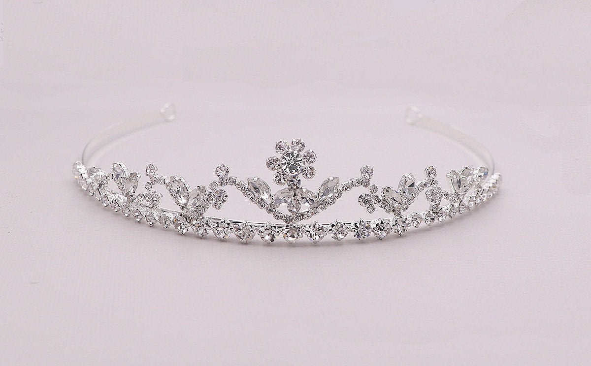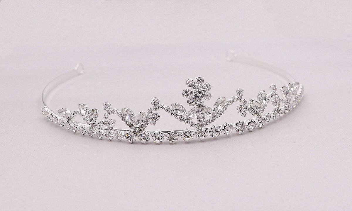 This sparkling flower girl tiara features brilliant rhinestones in shapes of round and marquise. This headpiece is perfect for the flower girl, first communion or birthday party! Measuring 1" high, this sparkling headpiece is sure to add sparkle to your special day! Can be custom made with a colored center stone in the middle of the flower.