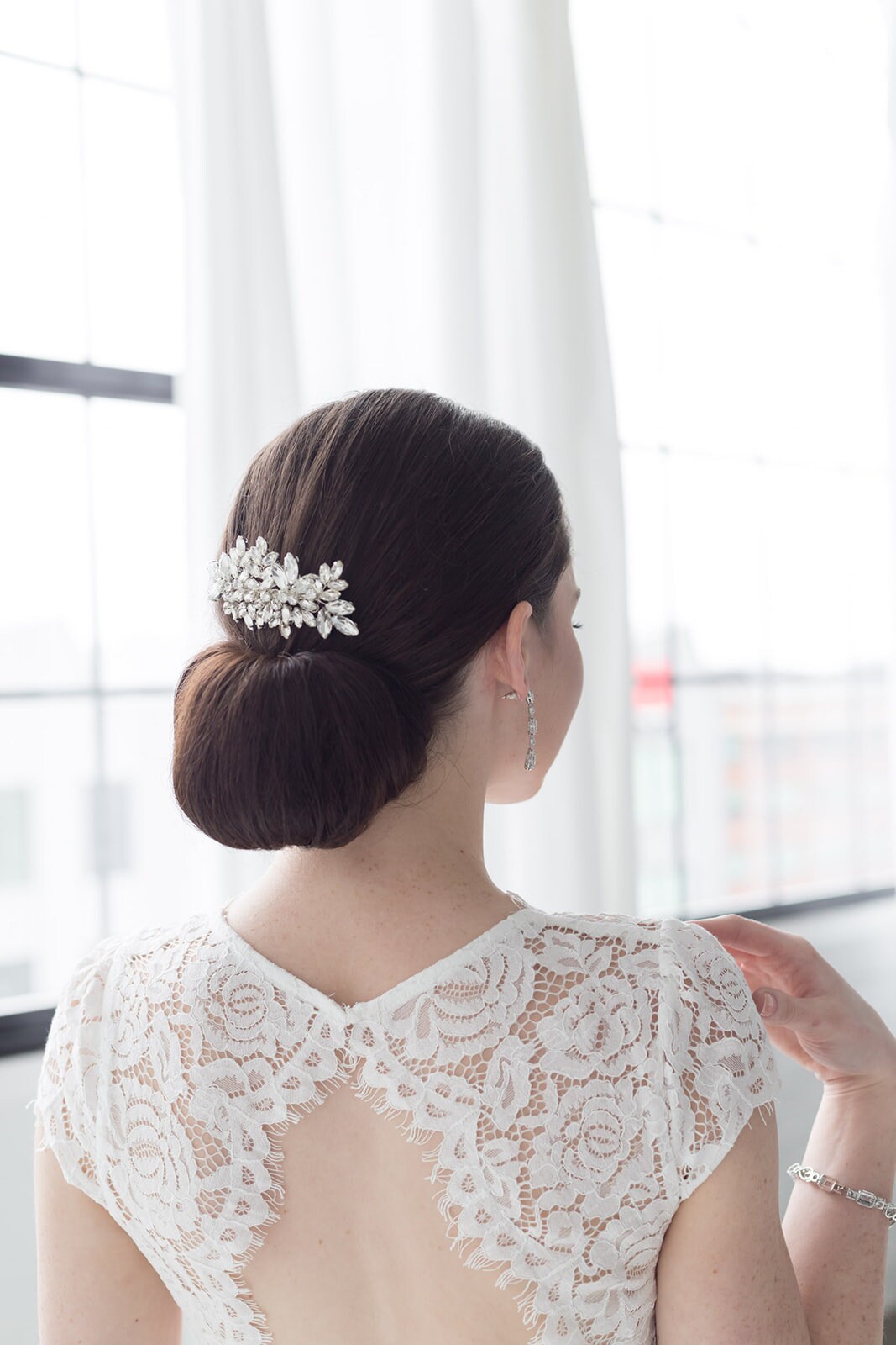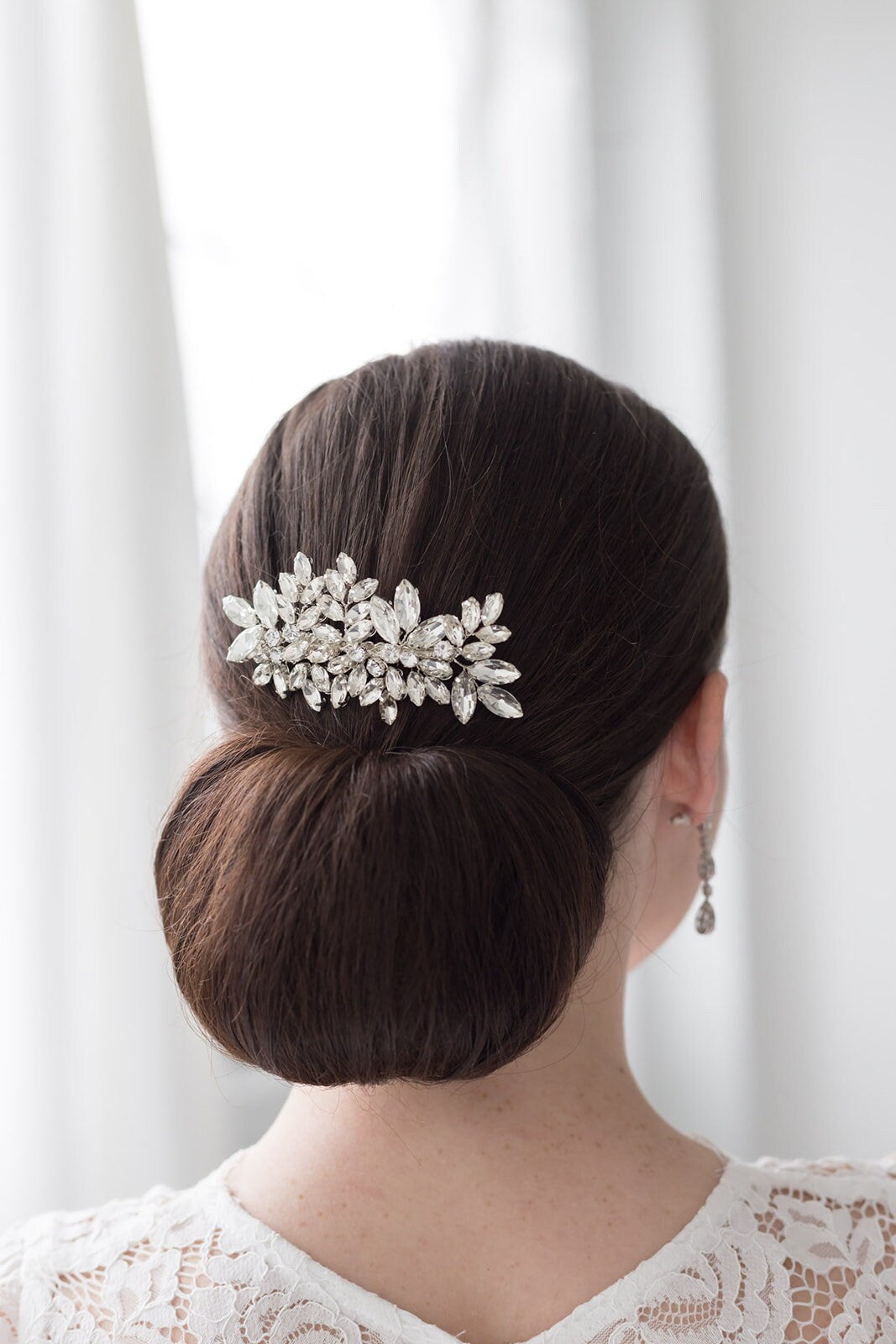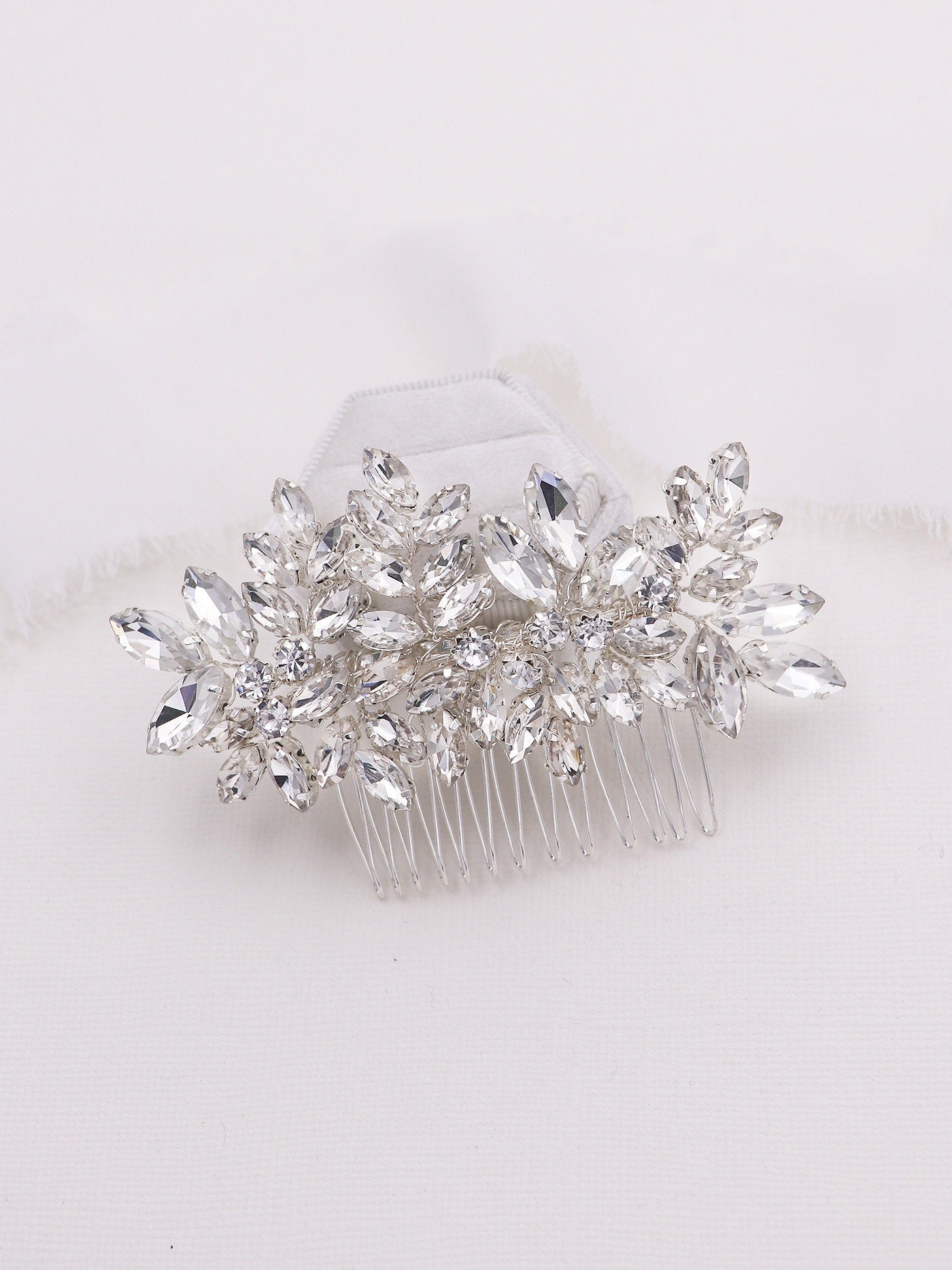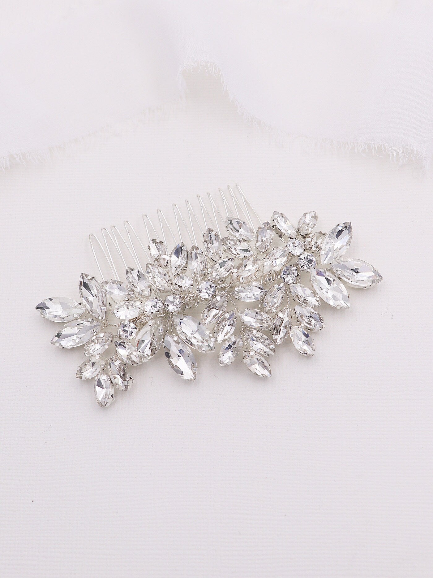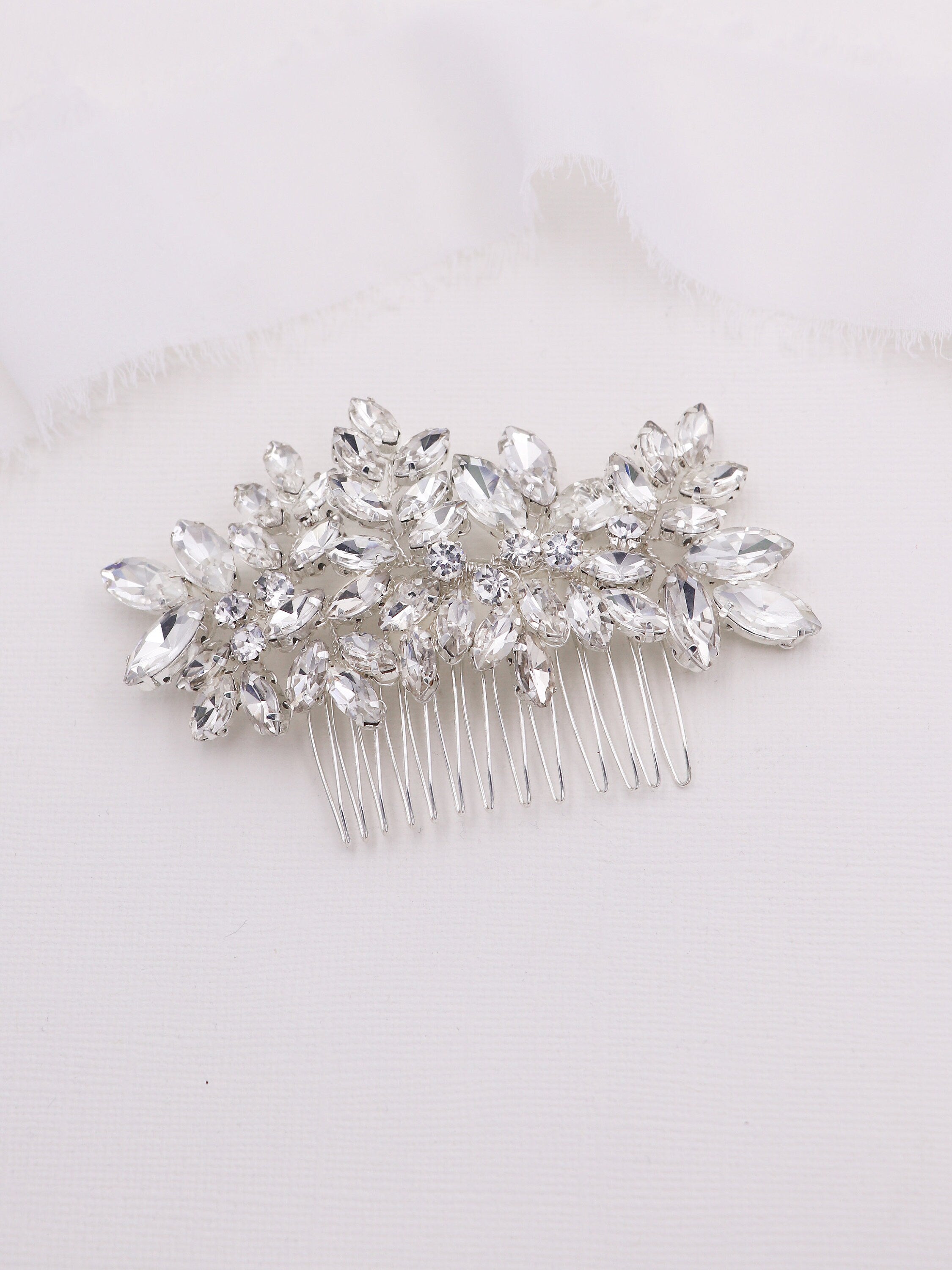 This elegantly designed hair comb features sparkling round and marquise shaped rhinestone crystals that is the perfect accessory for the bride or any special occasion event. Each crystal is hand set and hardwired to create a beautiful cluster of crystals and measures 3" wide and 2" tall.