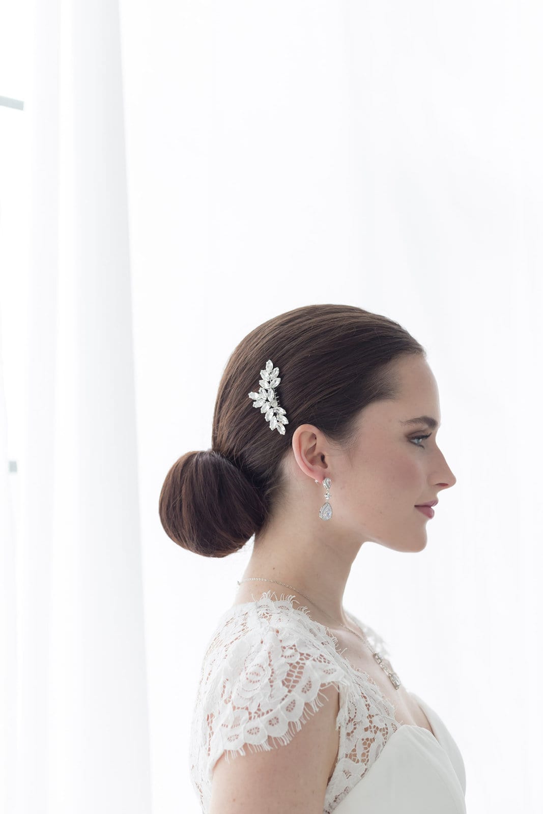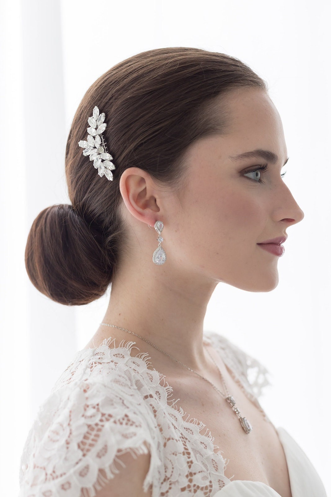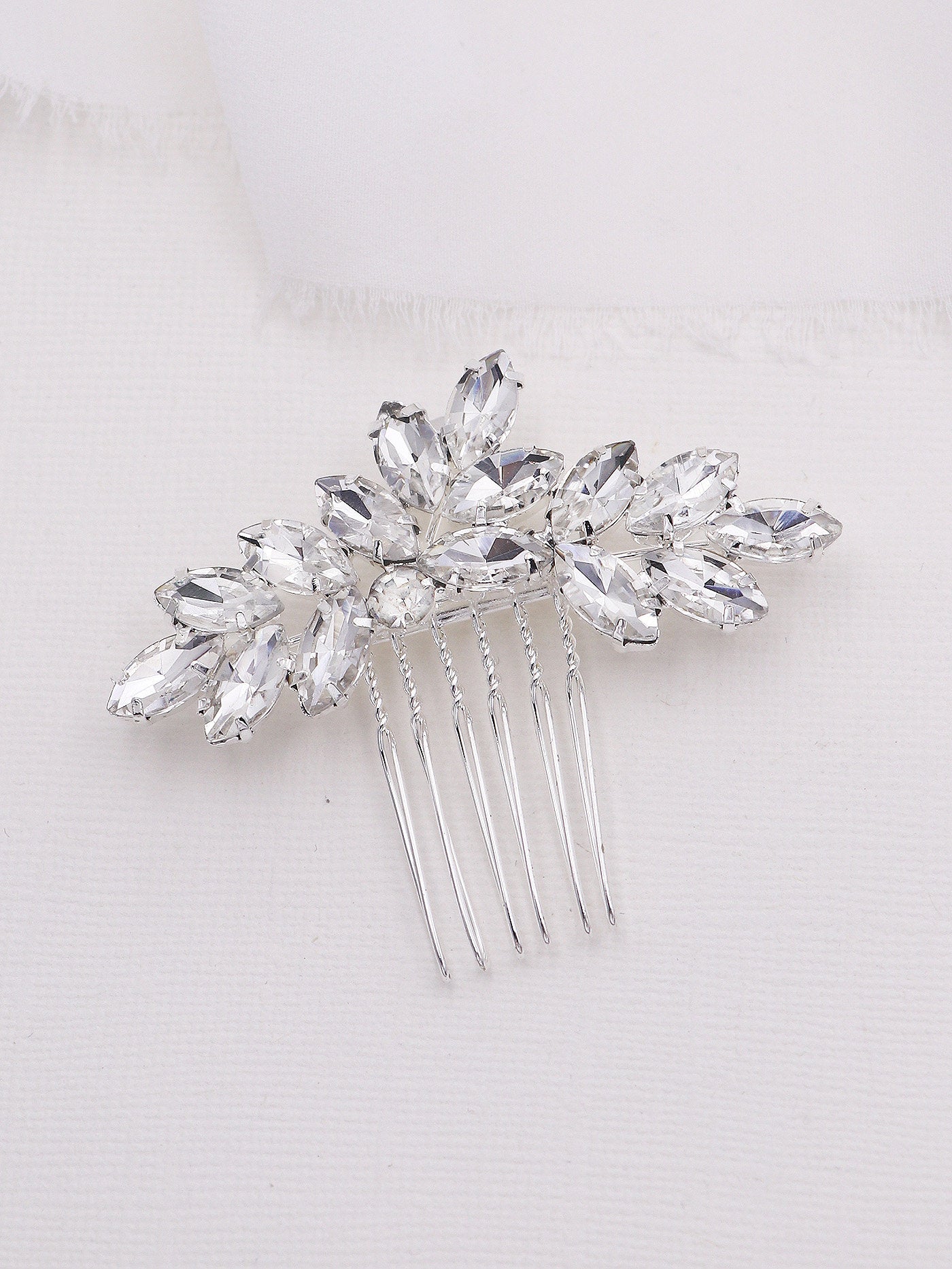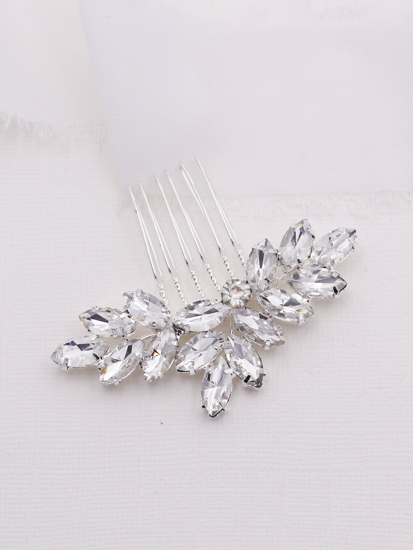This petite hair comb features sparkling round and marquise shaped rhinestone crystals that is the perfect accessory for the bride or any special occasion event. Comb measures 2 1/2" wide by 1 1/2" tall.