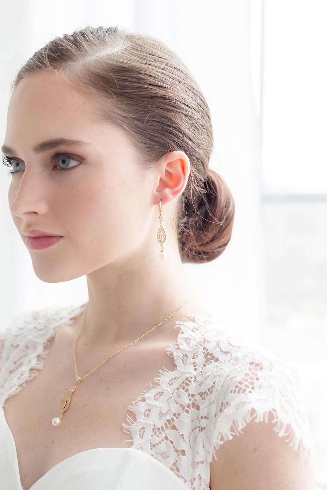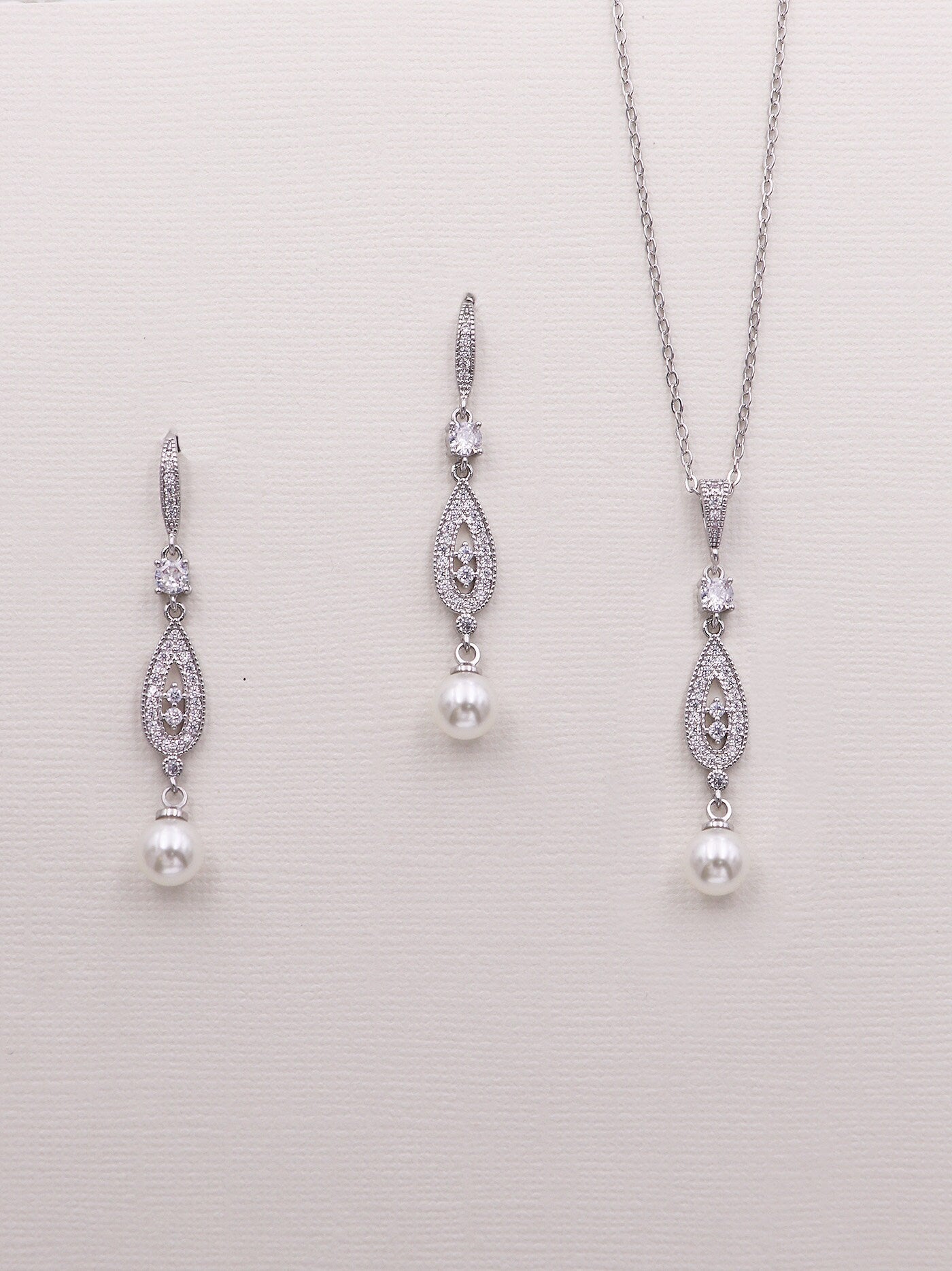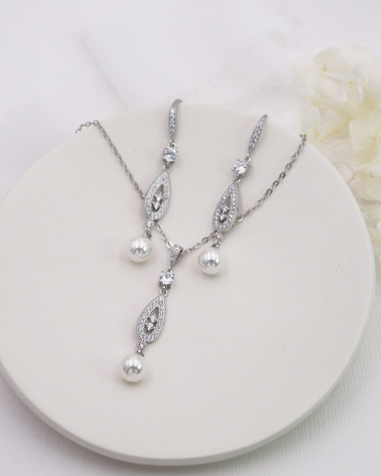 This elegant bride jewelry set comprised of earrings and a necklace is perfect for making a statement on your special day. Crafted with gorgeous cubic zirconia stones and accented with dangling pearl drops. The elegant pearl accents add a touch of classic charm, and is perfect for brides, bridesmaids, prom or any special occasion.