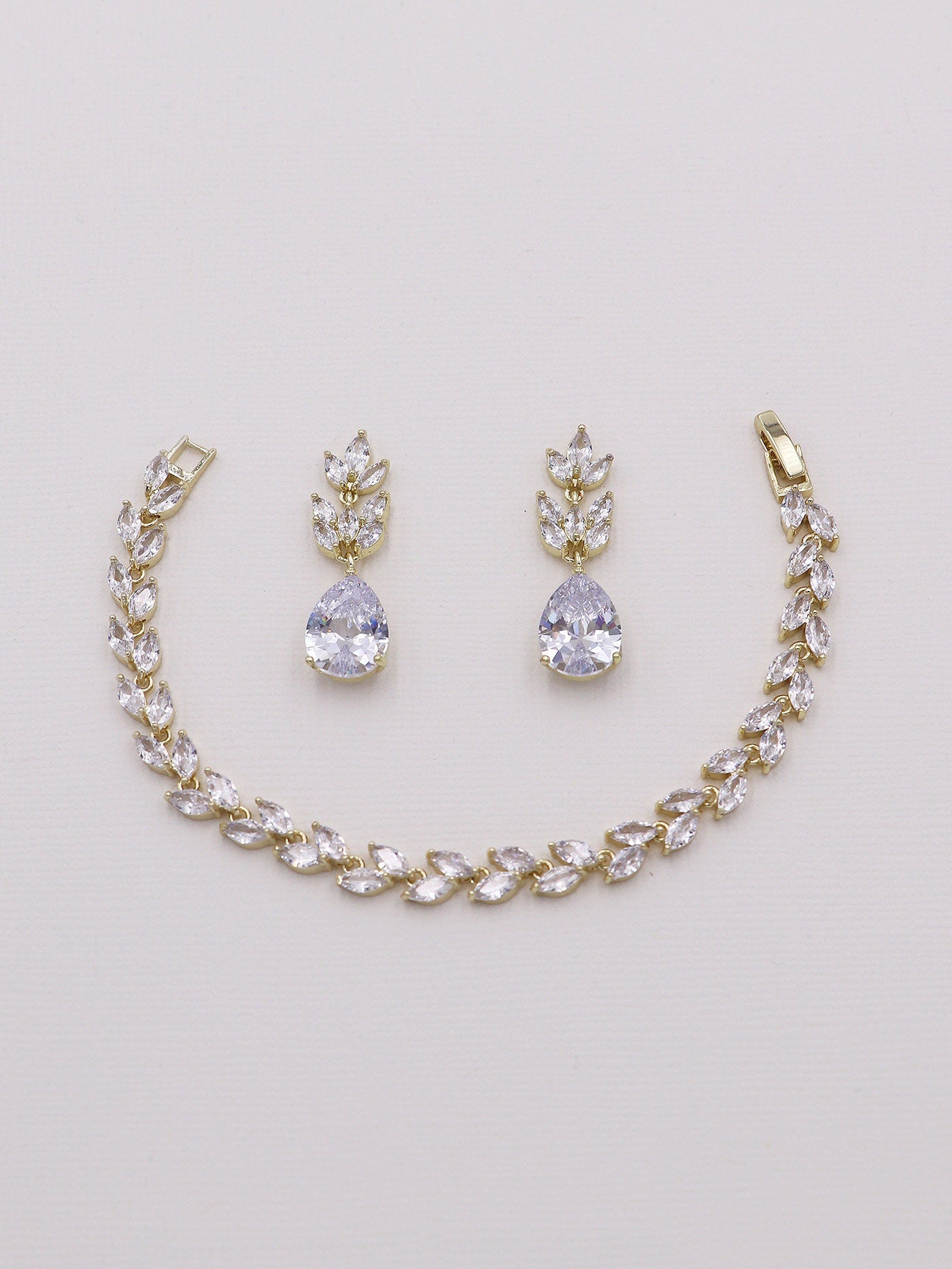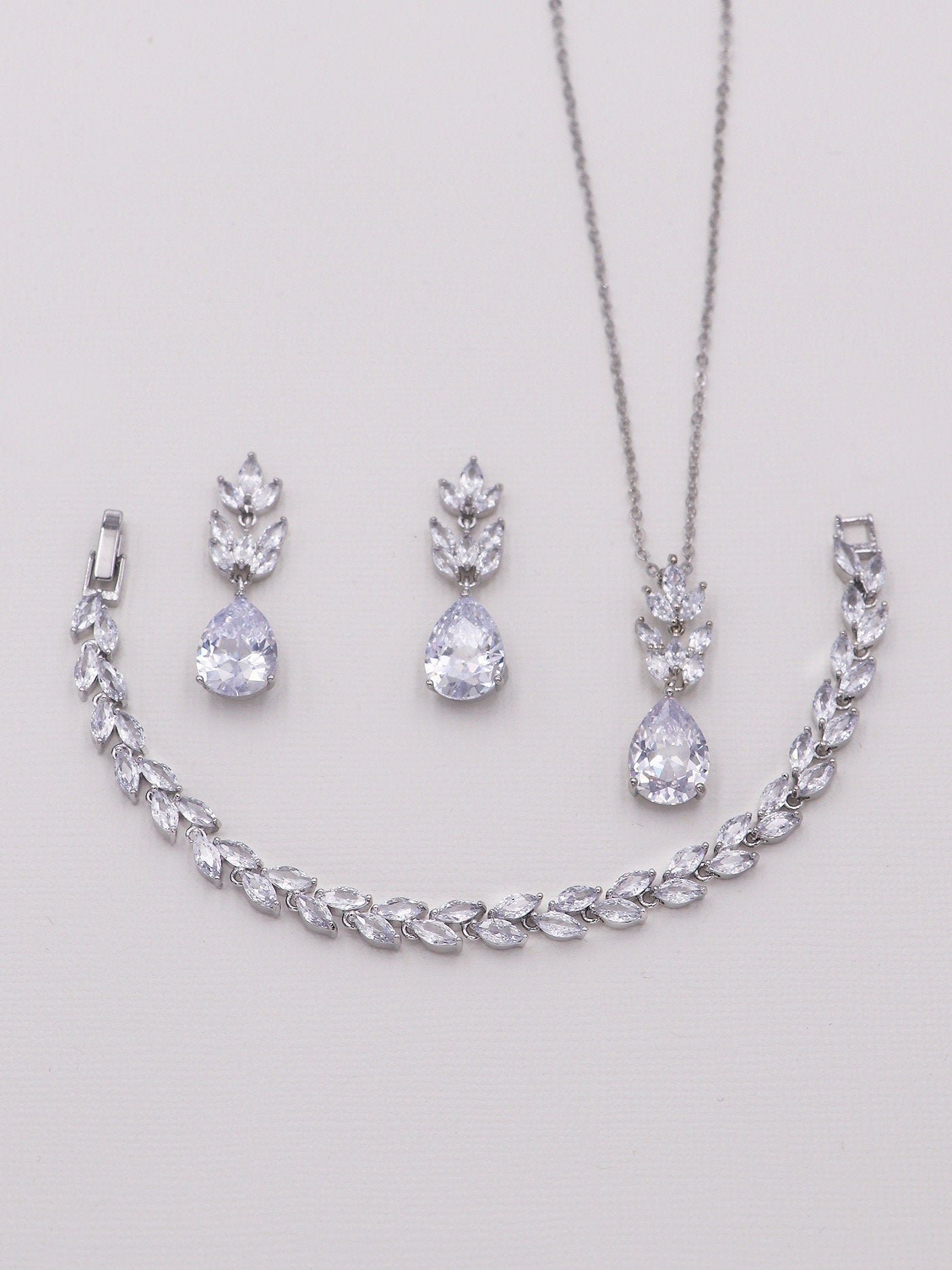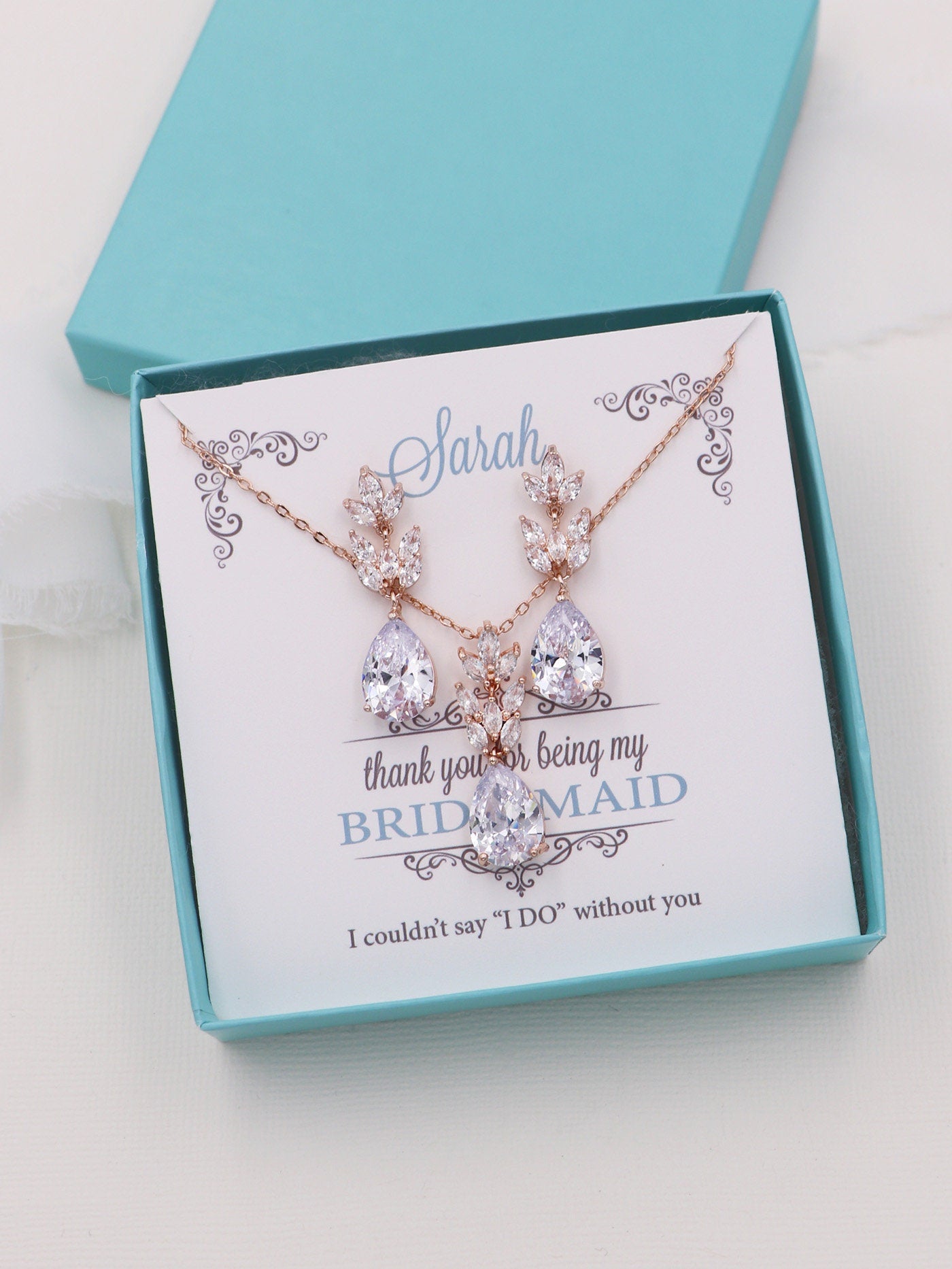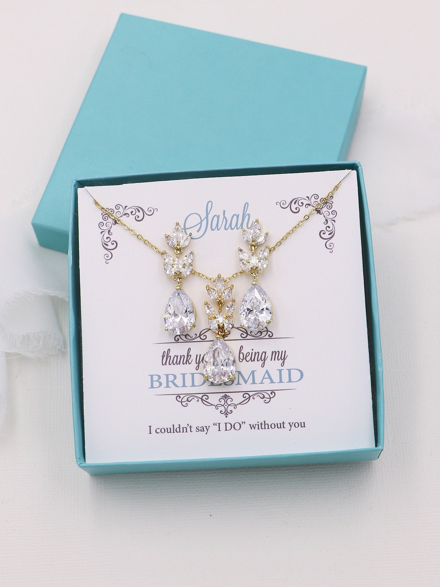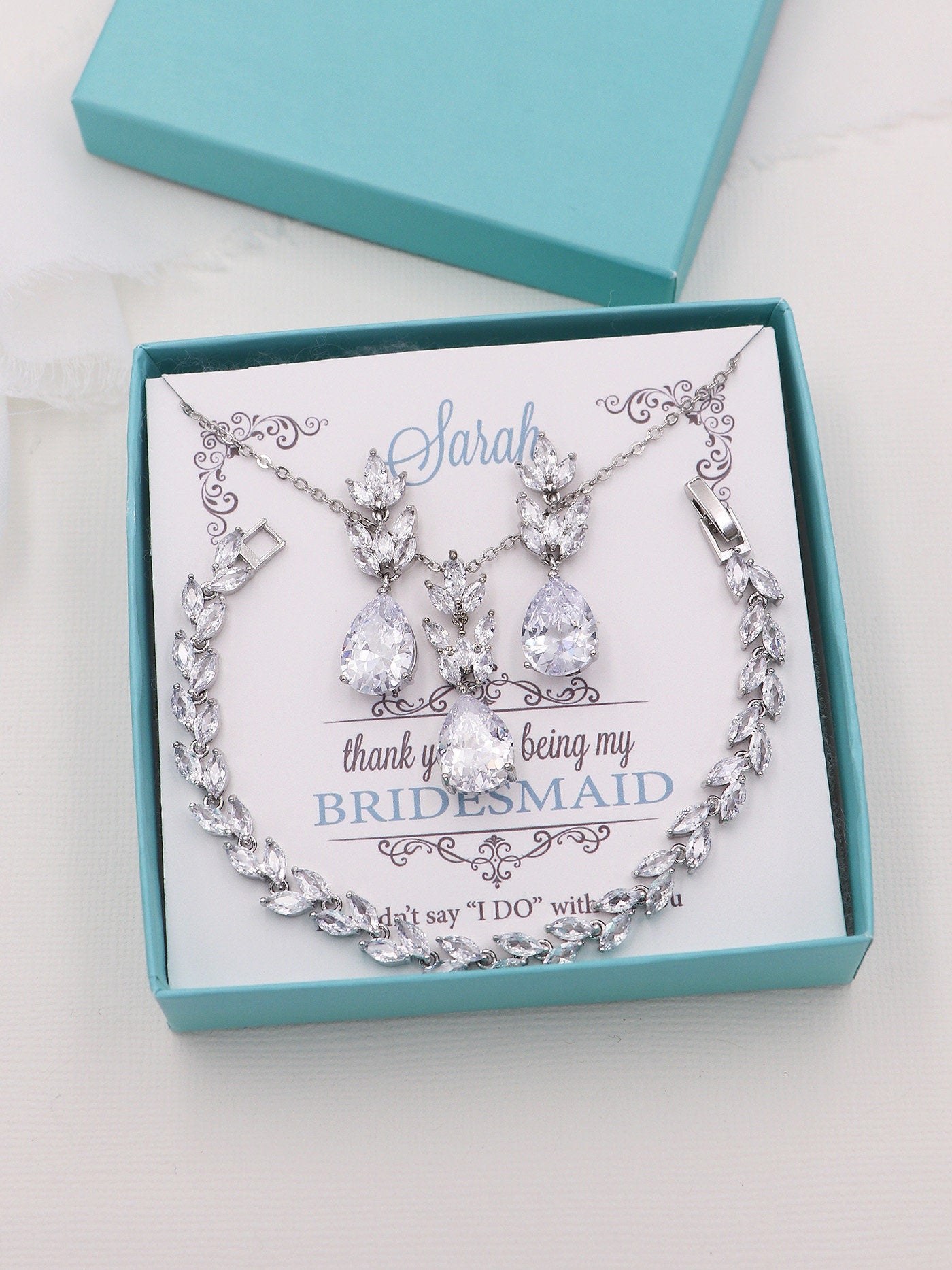 This brilliant bridesmaid jewelry set will surely add sparkle on your special day! Boasting brilliant cubic zirconia in clusters of marquise shapes and teardrops. Earrings measure 1 1/4". Matching necklace is adjustable from 16-18" long. Available in silver, gold and rose gold! Matching (optional) bracelet available measuring 7". Each set comes on a custom, personalized jewelry card featuring your choice for the name, title, font color and box color. Please enter card and box information in the order details text field.