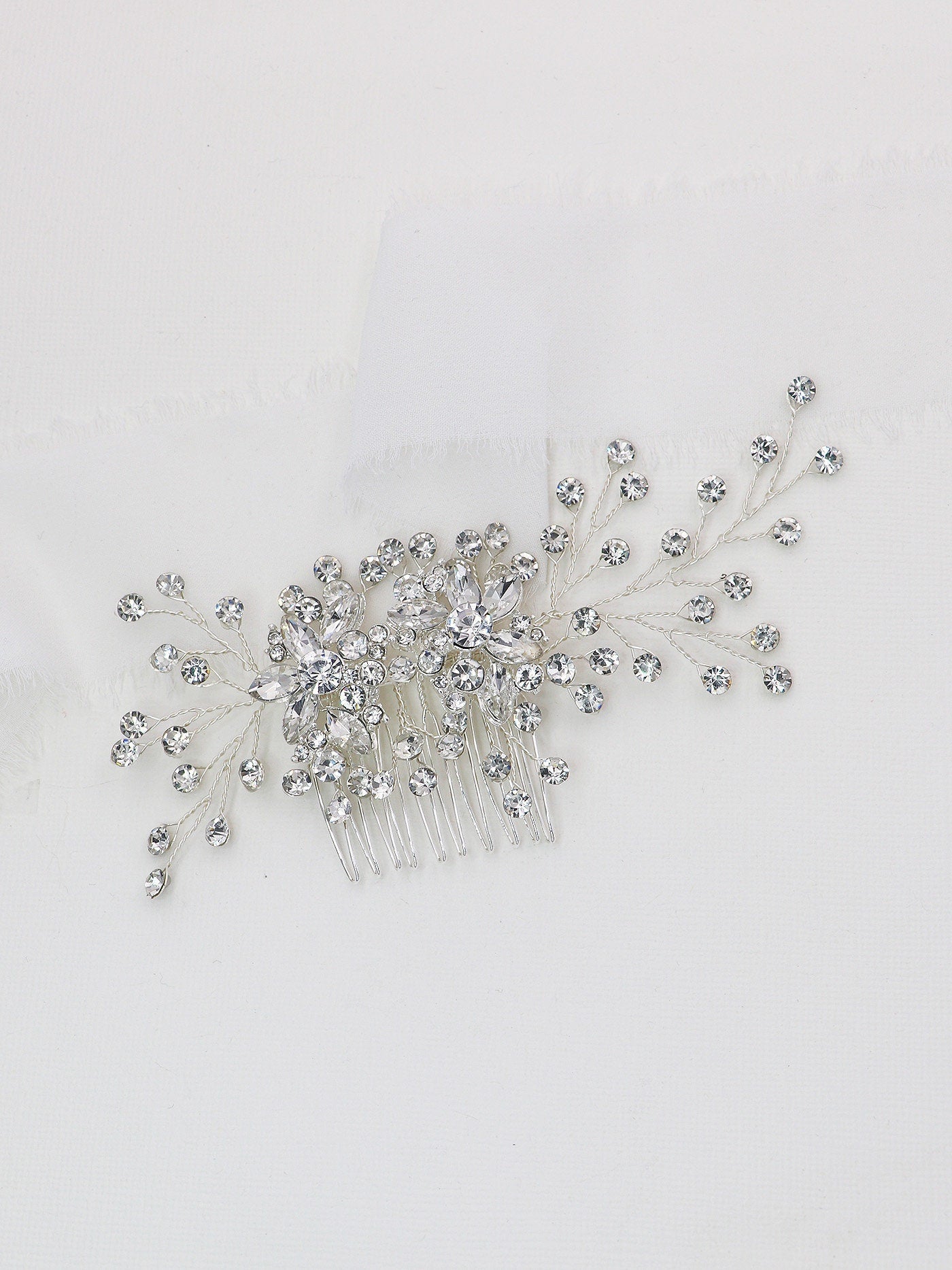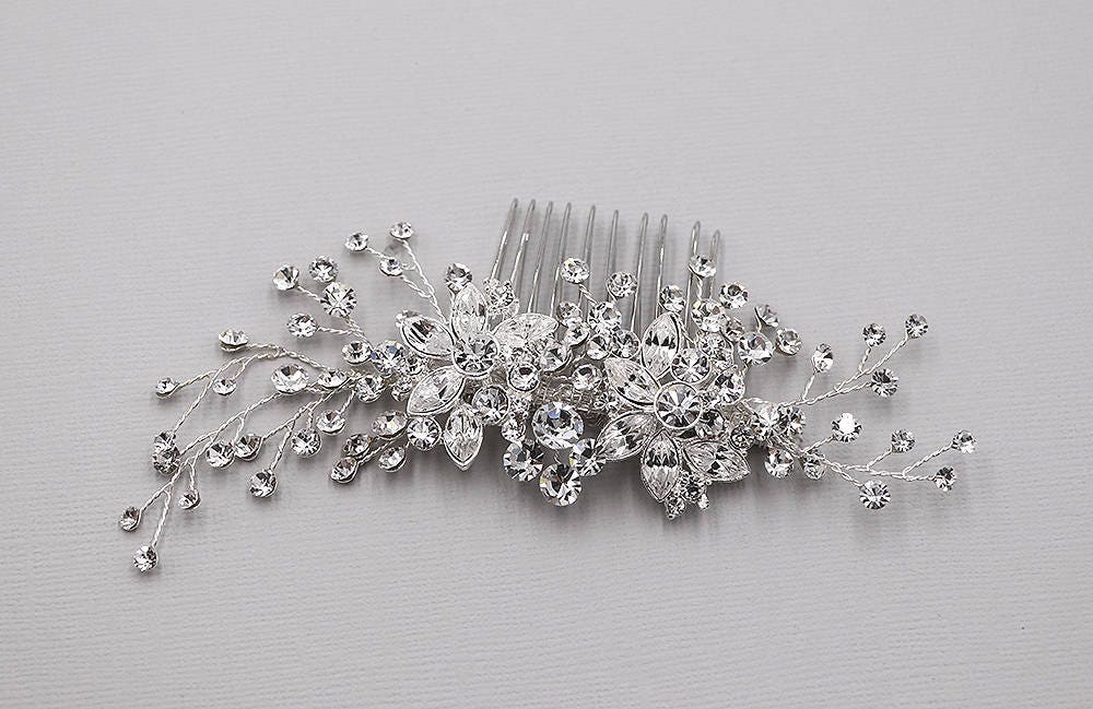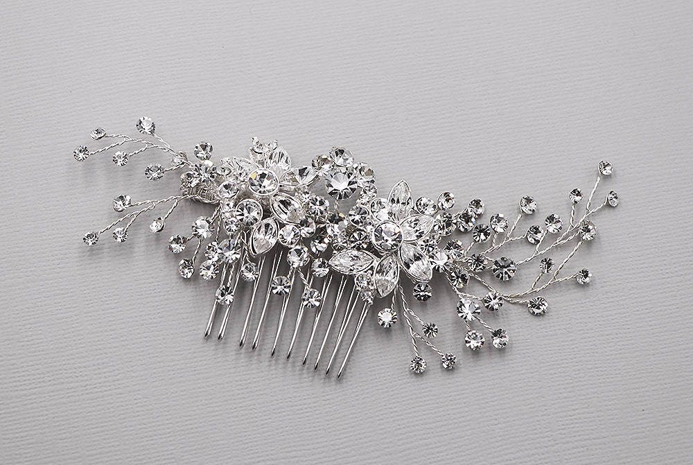 Add a touch of floral beauty with this unique bridal comb featuring high quality crystal rhinestones bursting with sparkle and accenting sprays. Plated in bright silver, this stunning comb measures 5" wide by 1 3/4" tall. This comb would be perfect as a side accent or back comb wedding hair accessory. Now available in silver or rose gold!