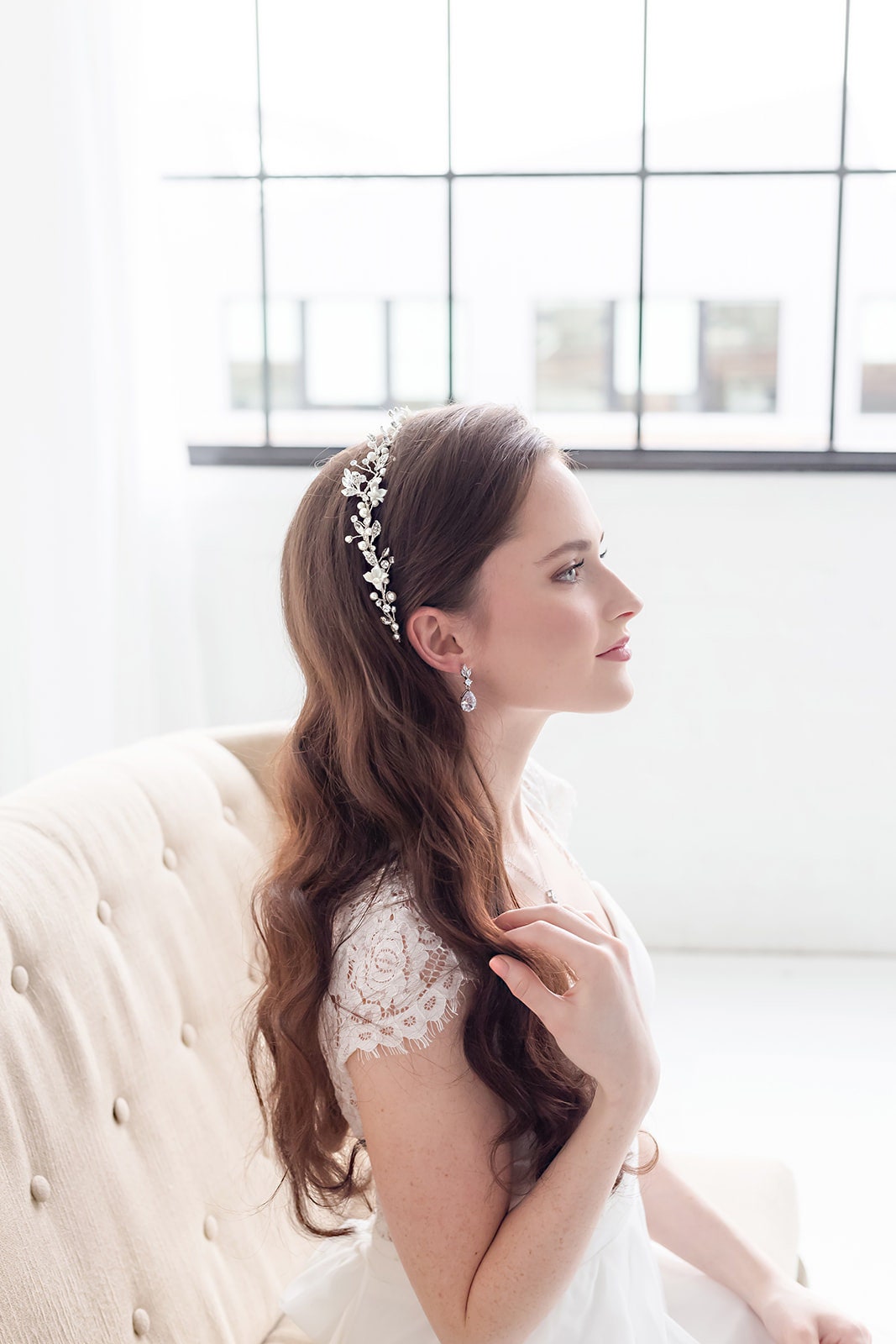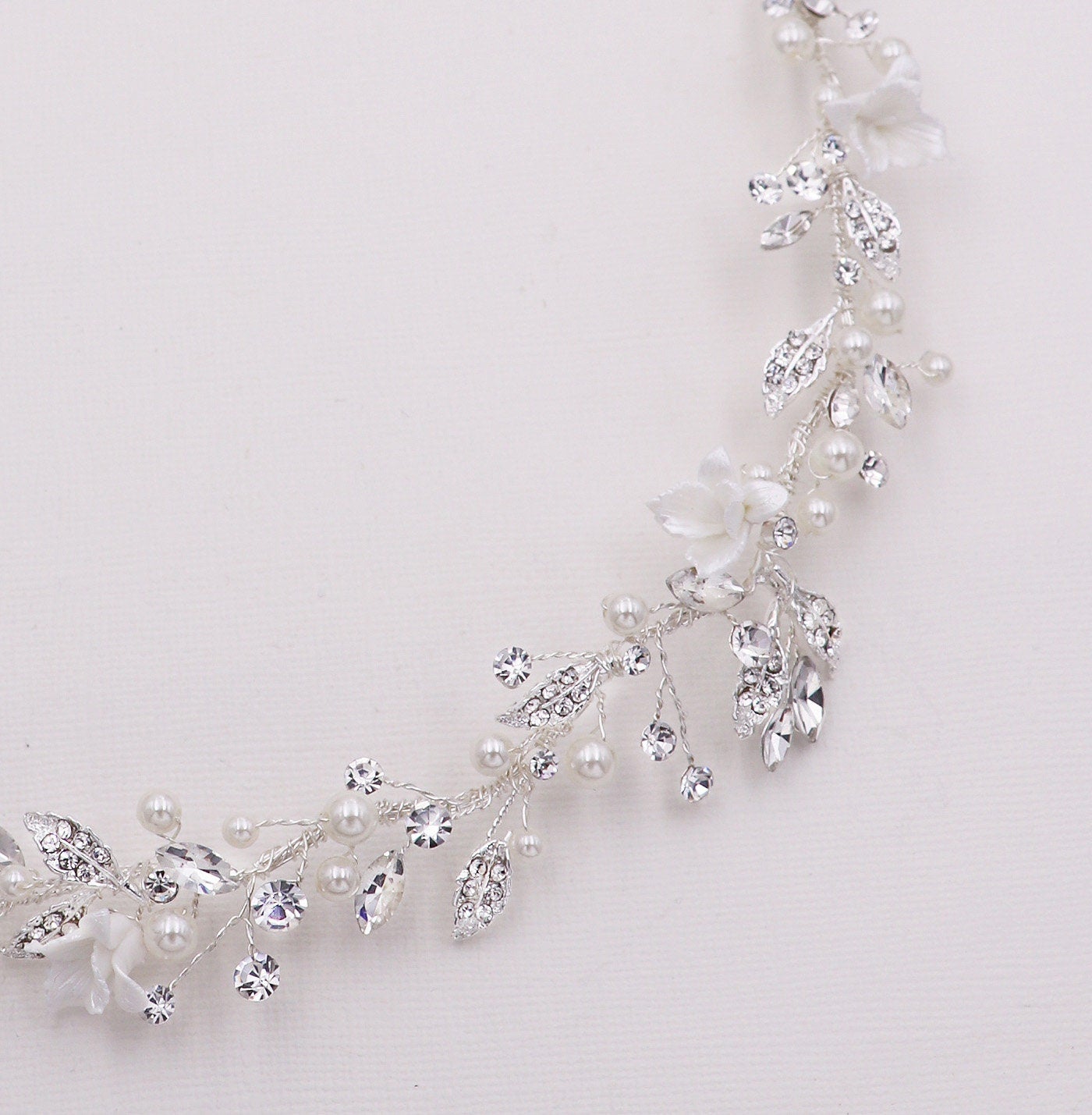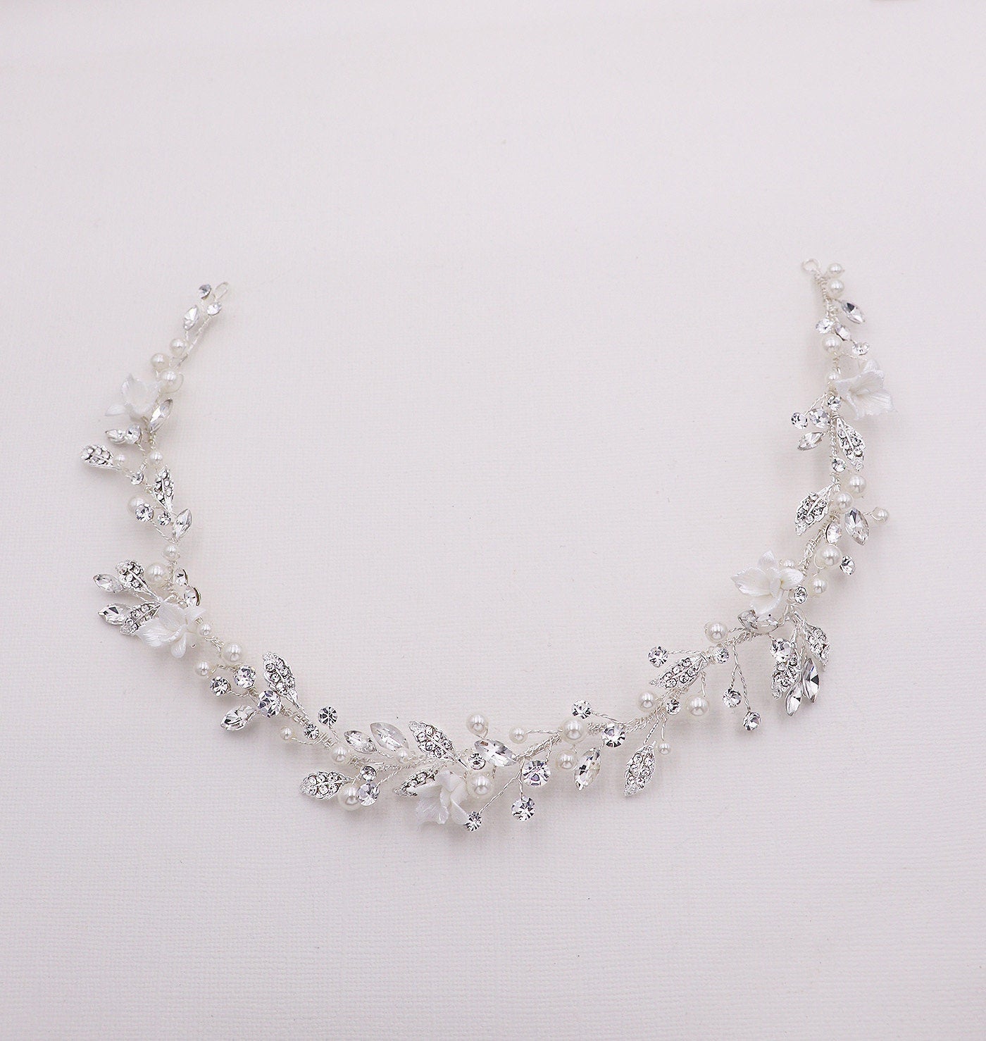 This exquisite wedding hair vine headpiece is designed to add a touch of elegance and floral beauty to your bridal look. This handcrafted and flexible hair accessory is adorned with shimmering crystals, pearlized flowers and lustrous pearls. It beautifully wraps around your hair, making it a perfect choice for any hairstyle. With its 1 inch wide design and versatility, it can be worn as a headband, back headpiece or weaved throughout a braid design. From classic weddings to boho-chic ceremonies, this handmade hair vine is the perfect finishing touch to complete your bridal ensemble.