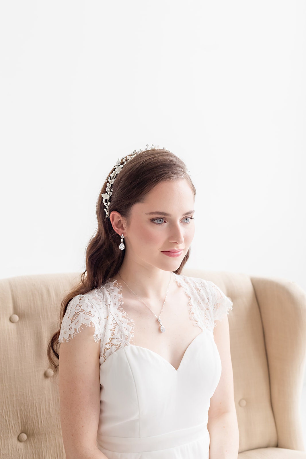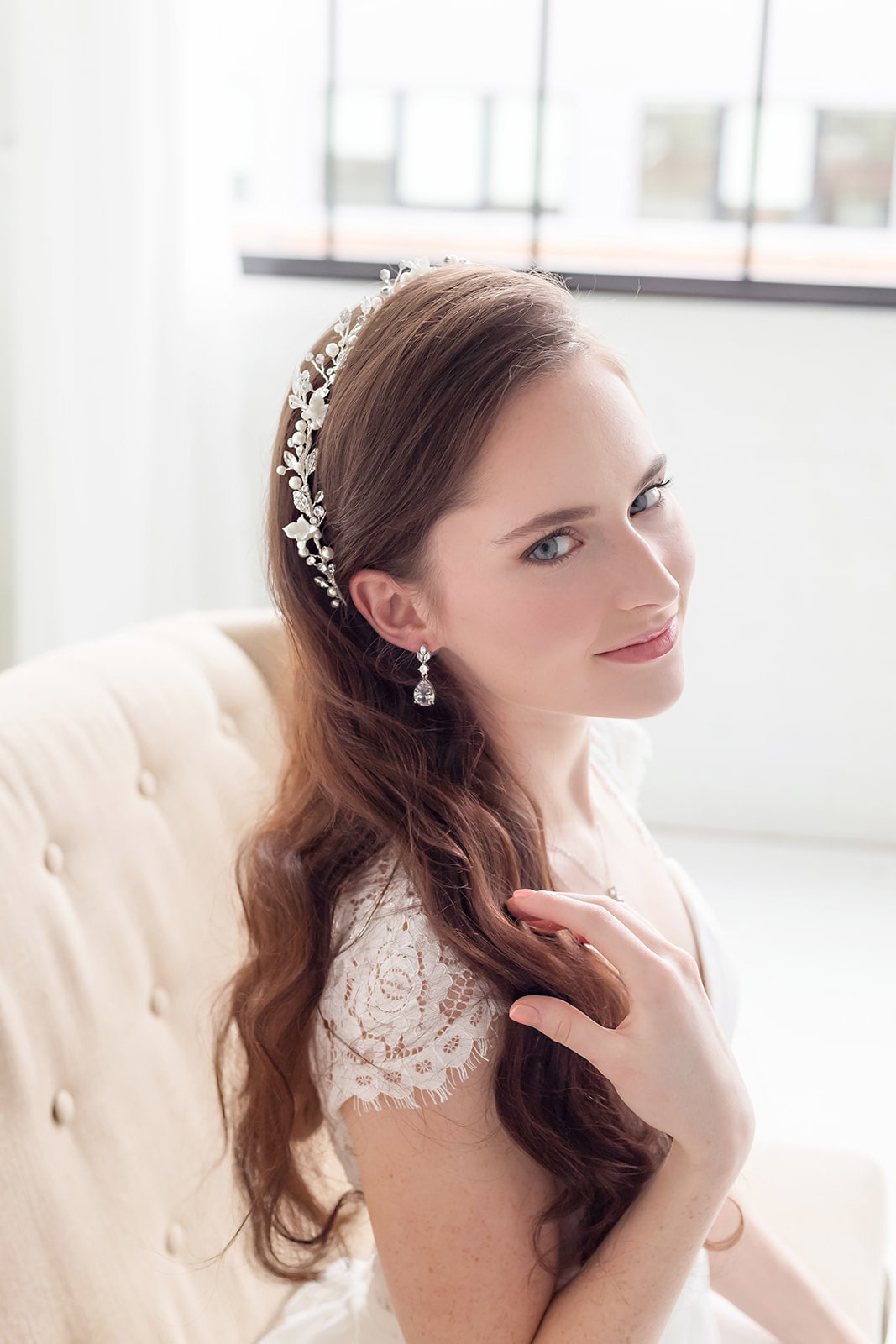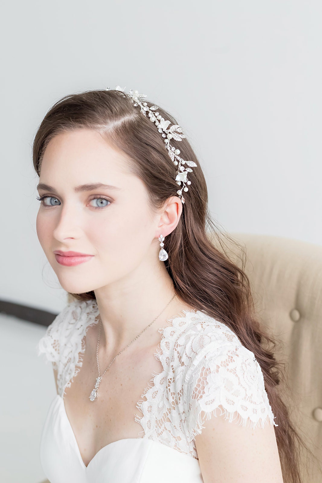 This exquisite wedding hair vine headpiece is designed to add a touch of elegance and floral beauty to your bridal look. This handcrafted and flexible hair accessory is adorned with shimmering crystals, pearlized flowers and lustrous pearls. It beautifully wraps around your hair, making it a perfect choice for any hairstyle. With its 1 inch wide design and versatility, it can be worn as a headband, back headpiece or weaved throughout a braid design. From classic weddings to boho-chic ceremonies, this handmade hair vine is the perfect finishing touch to complete your bridal ensemble.