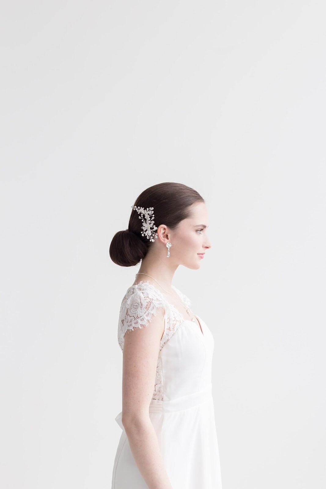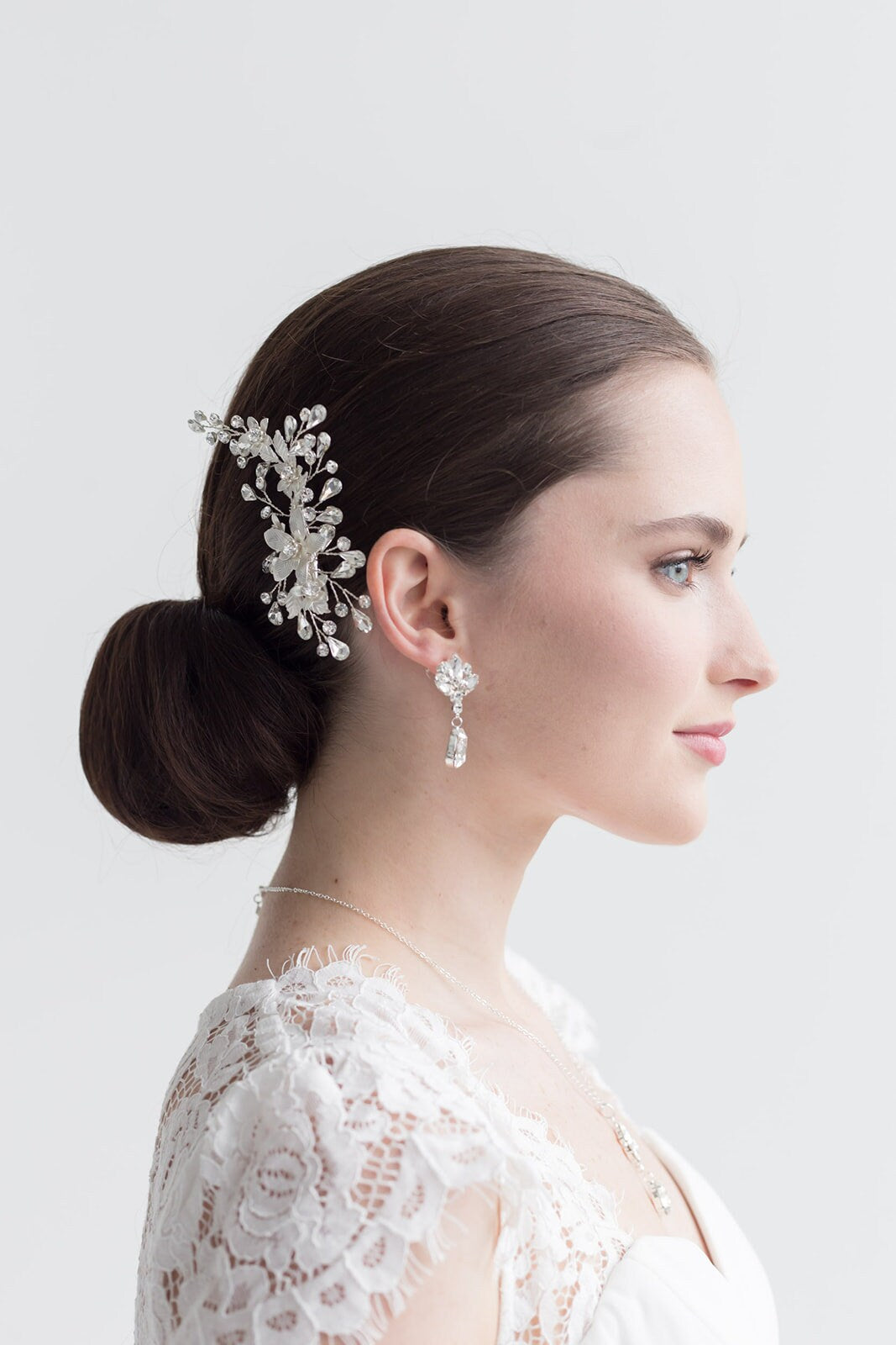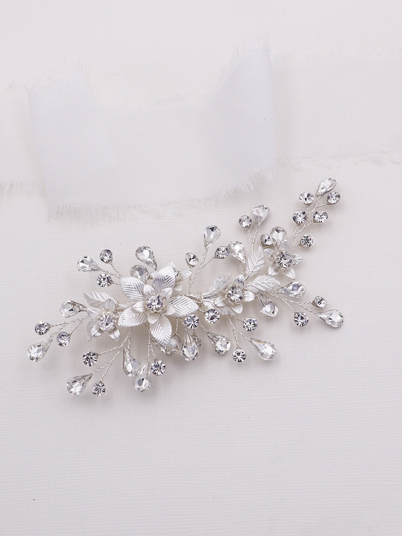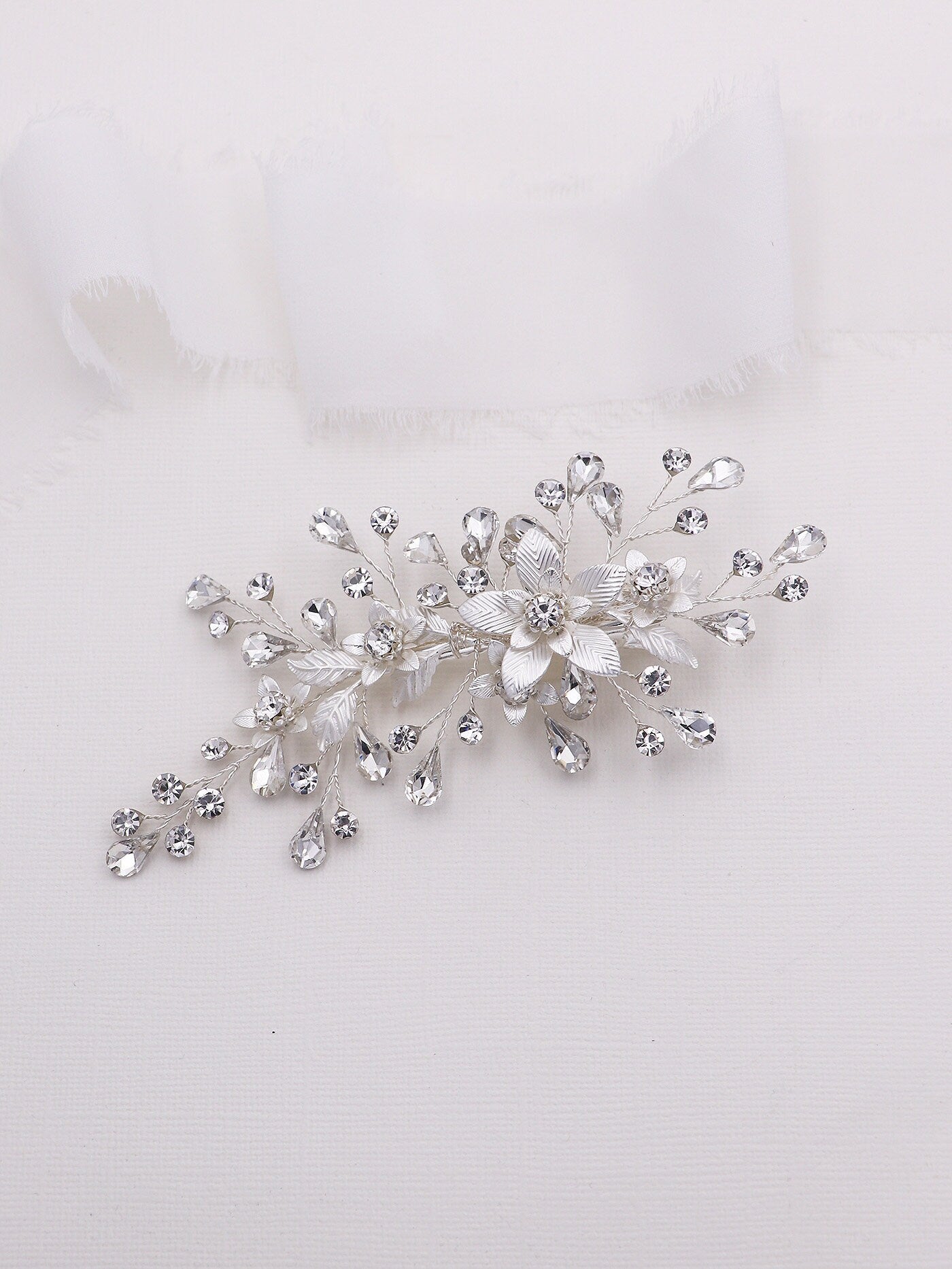 This exquisite wedding hair clip features brilliant rhinestones in floral design that is the perfect accessory for the bride or any special occasion event. This piece is perfect as a side or back comb accessory. Measures 4" wide by 2" tall. Back has an alligator style clip for easy placement.