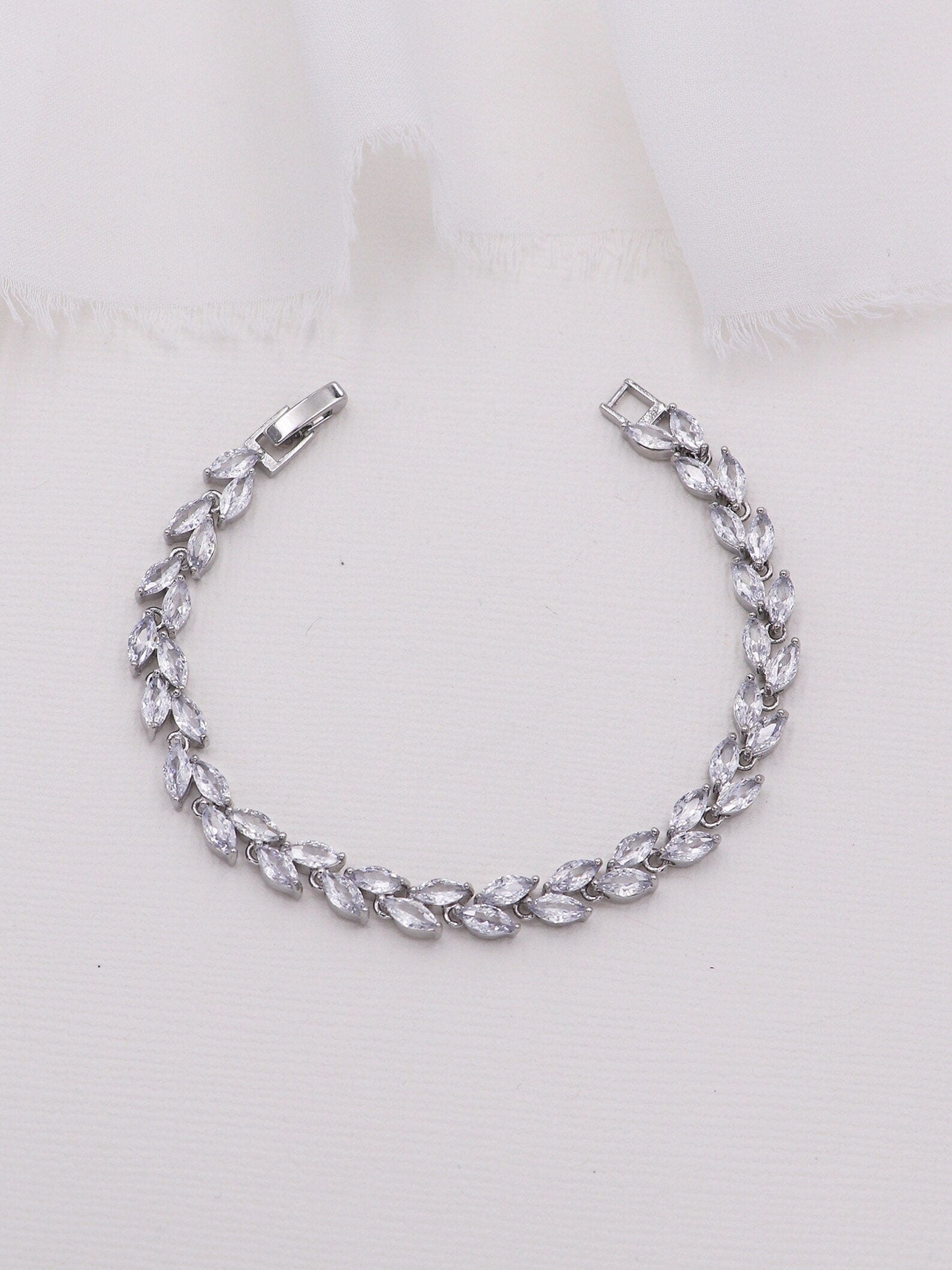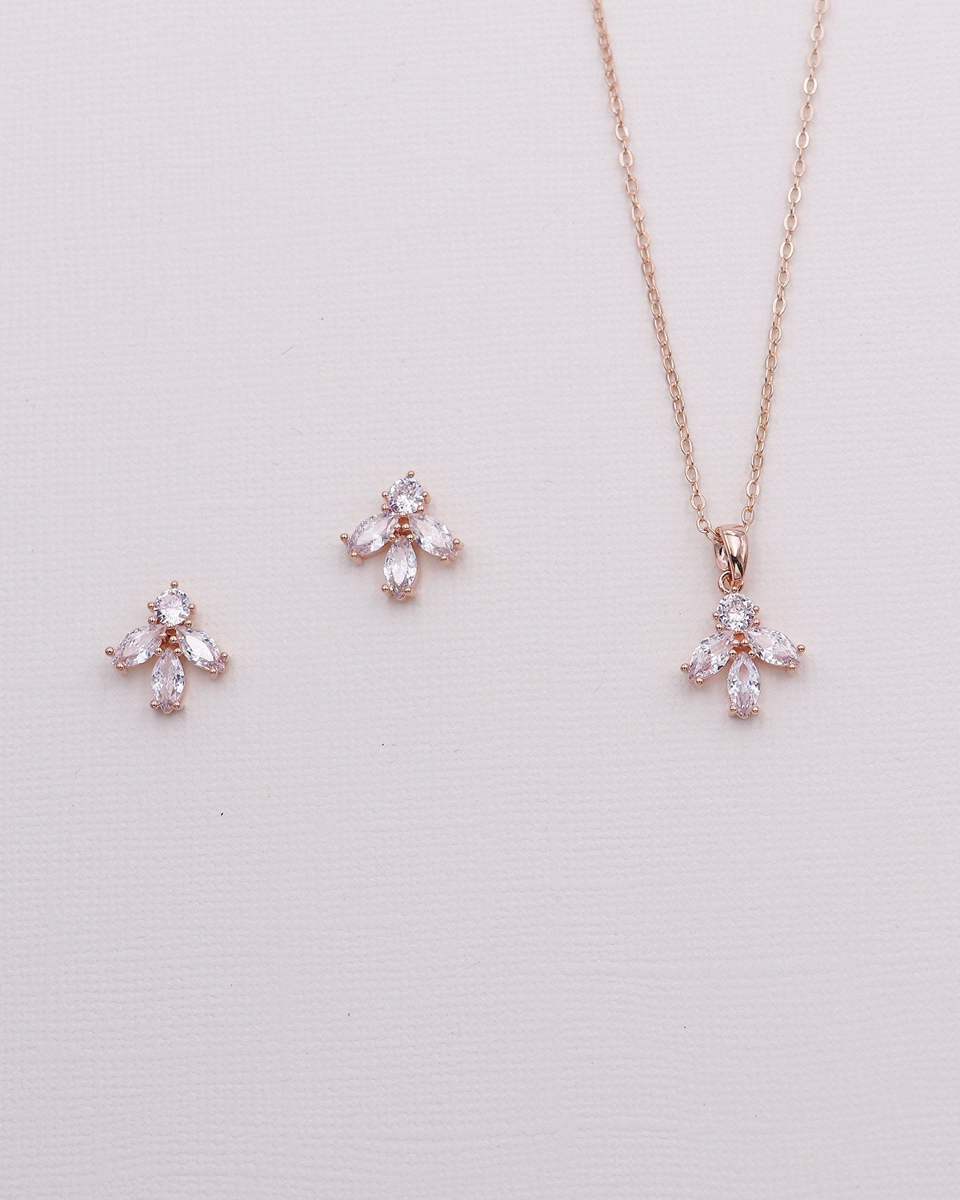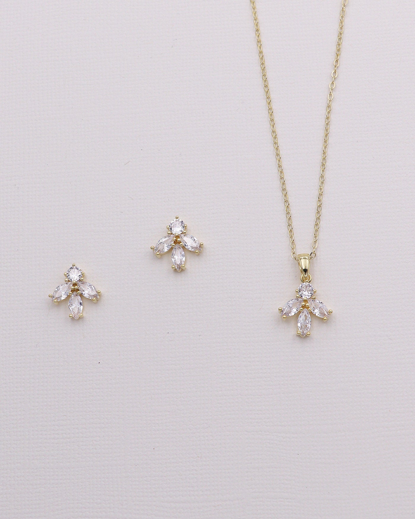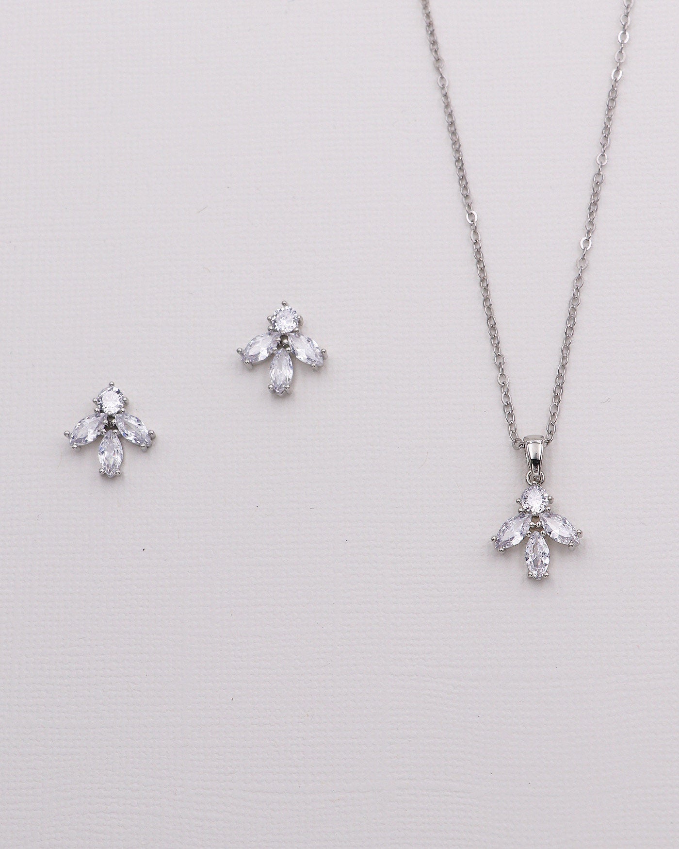 Add minimalist elegance with these exquisitely designed cubic zirconia teardrop wedding earrings and necklace set, featuring shapes of round and marquise in a "leafy" pattern. Perfect for the minimalist bride, bridesmaids, mother of the bride, MOH, prom or any occasion!