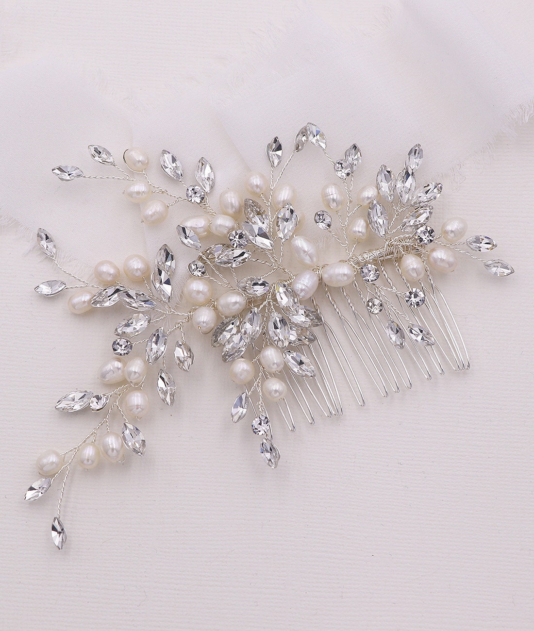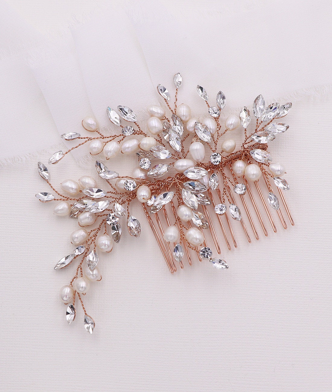 New design! Add that finishing touch with this elegantly designed handmade wedding hair accessory featuring sparkling crystal rhinestones and luster with freshwater pearls. This stunning comb measures 5" wide by 3" tall (at the widest point). This comb would be perfect as a side accent or back comb wedding hair accessory. Choose from silver, gold or rose gold finish. Available in all crystals or with accenting freshwater pearls.
